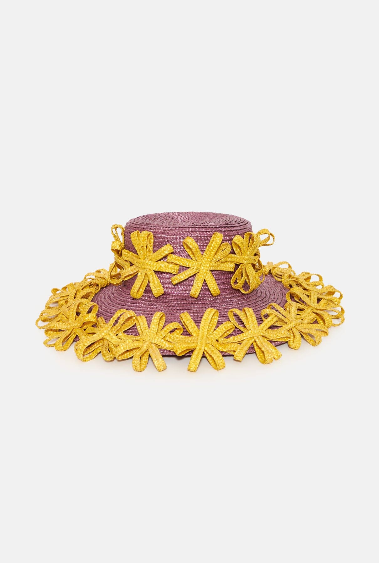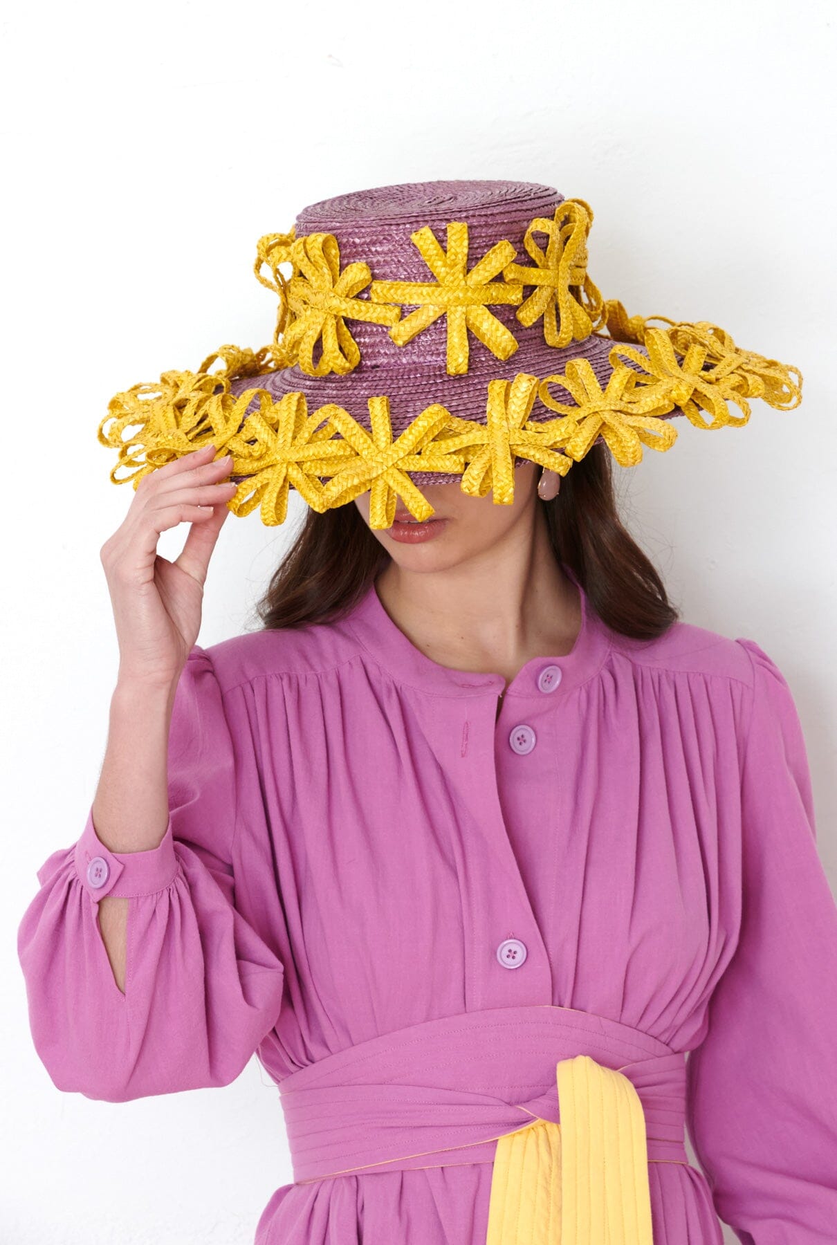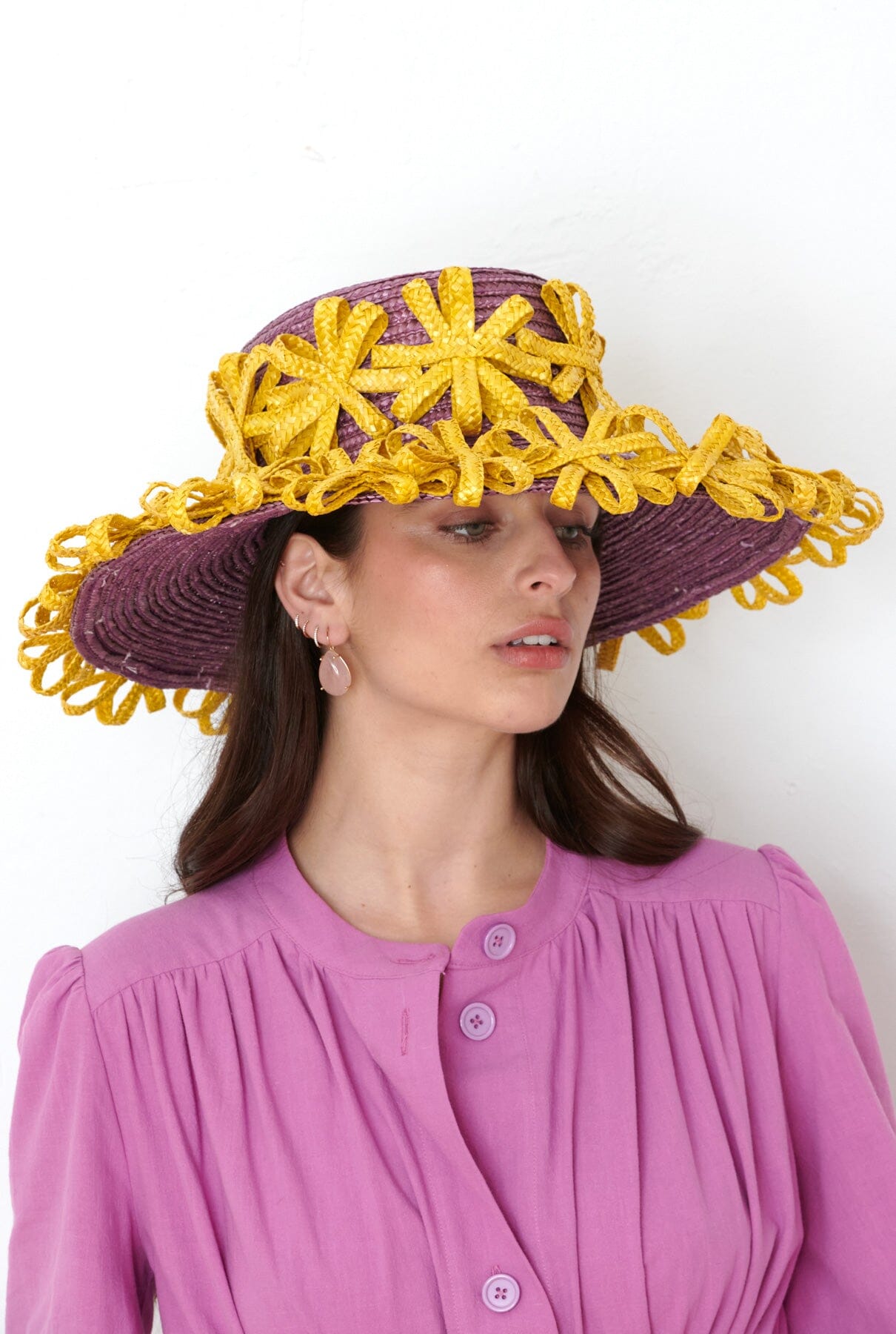 Sombrero de paja de trigo teñido de morado, con copa alta y ala ancha. Decorado con dos hileras de flores amarillas del mismo material, le da un toque original.