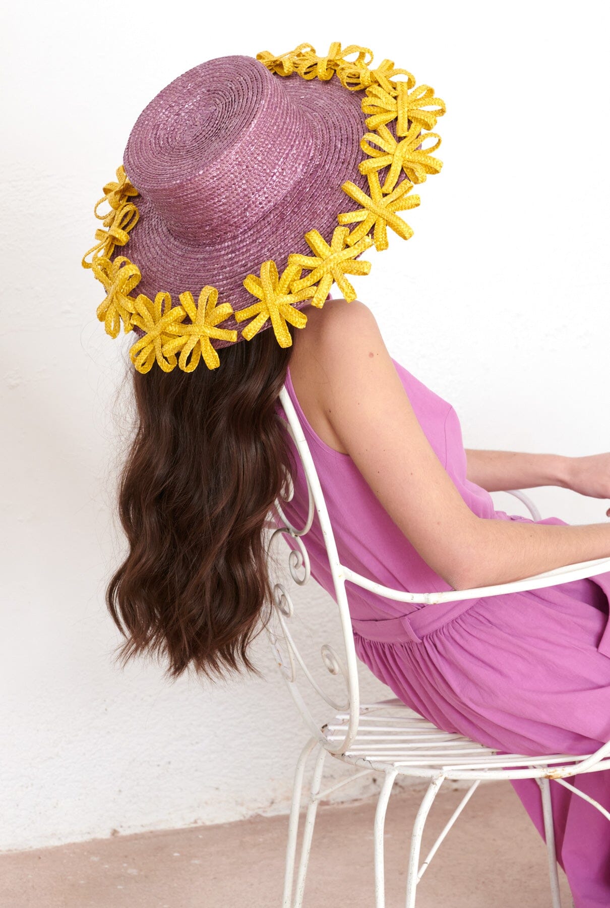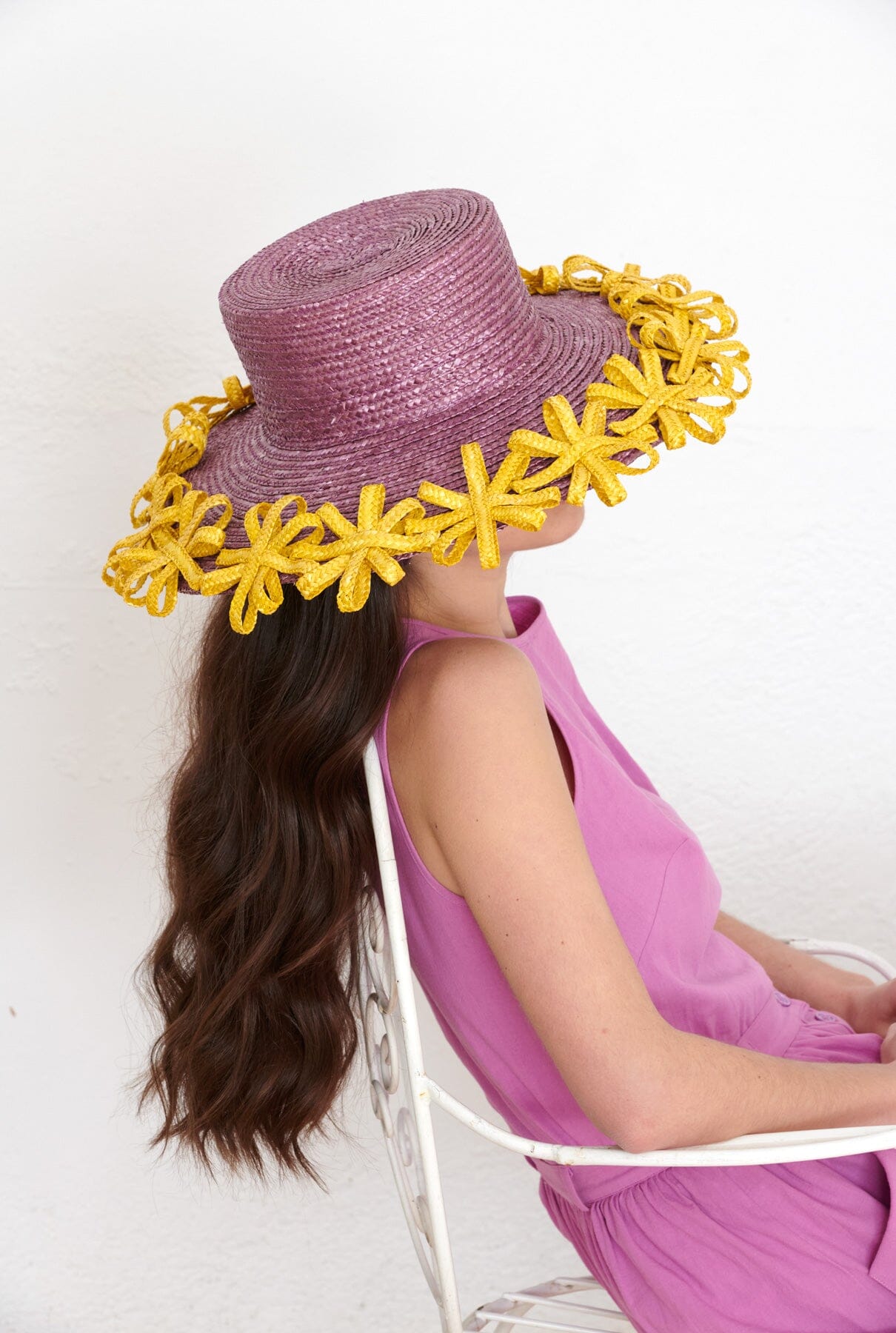 Sombrero de paja de trigo teñido de púrpura, con copa alta y ala ancha. Decorado con una hilera de flores amarillas del mismo material, le da un toque original.