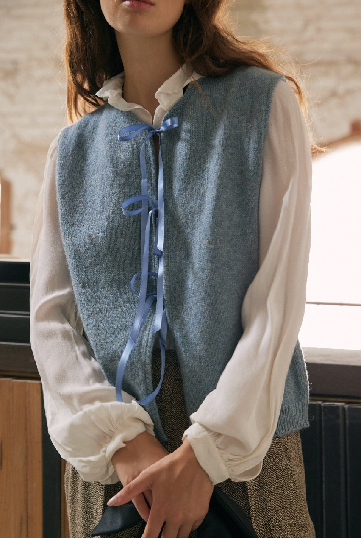 El chaleco con lazo Mumi está confeccionado en 100 % lana y tiene un aspecto rústico y deportivo. Este estilo tiene un corte relajado y tres lazos que se pueden anudar con cuidado para formar lazos. Este chaleco, que evoca un estilo romántico, se abrocha con bonitos lazos de satén cosidos a mano, haciendo un guiño a las tendencias coquetas y balletcore.
