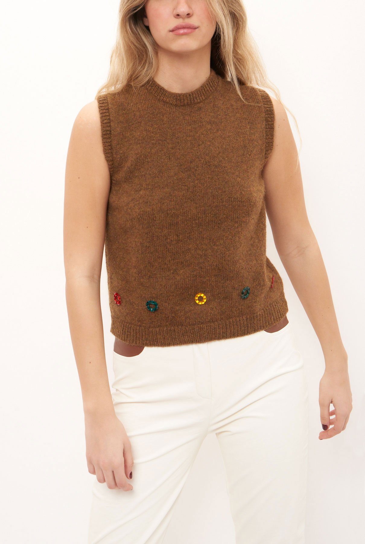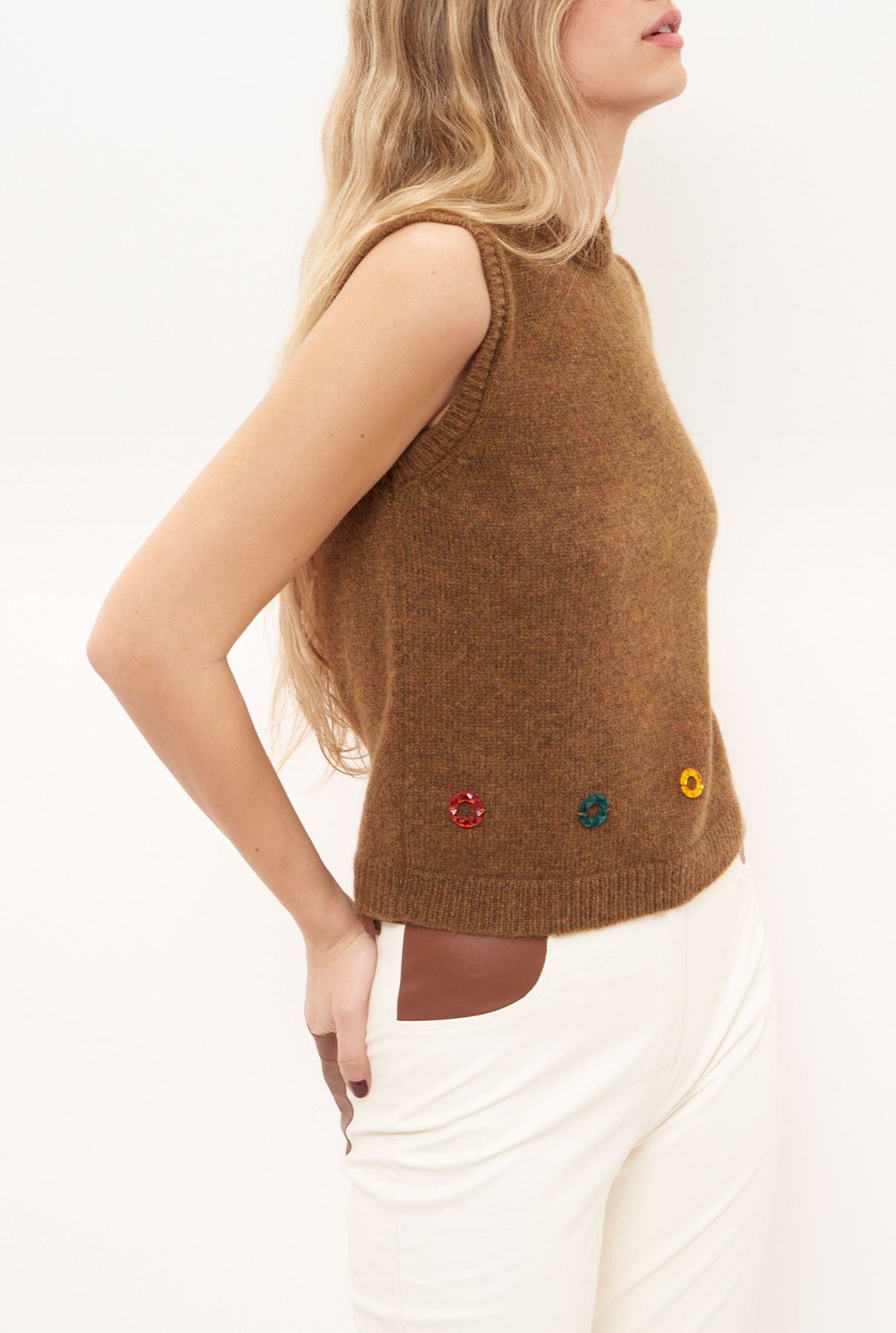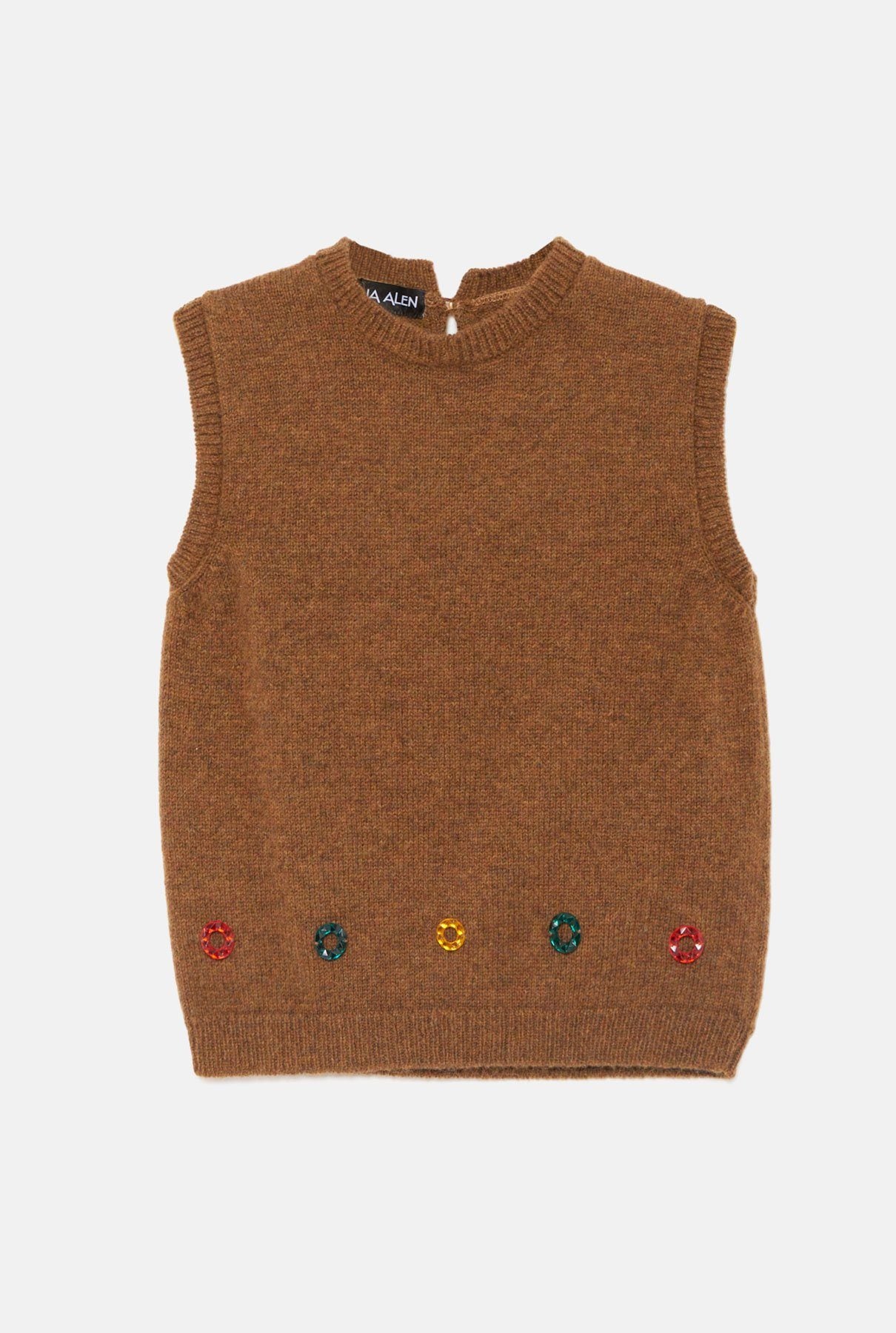 El chaleco mumu de cuello redondo es una prenda de punto sin mangas confeccionada 100% en lana. Este chaleco presenta coloridos apliques en los hombros y en la parte inferior de la prenda. Diseñado por Laia Alen.