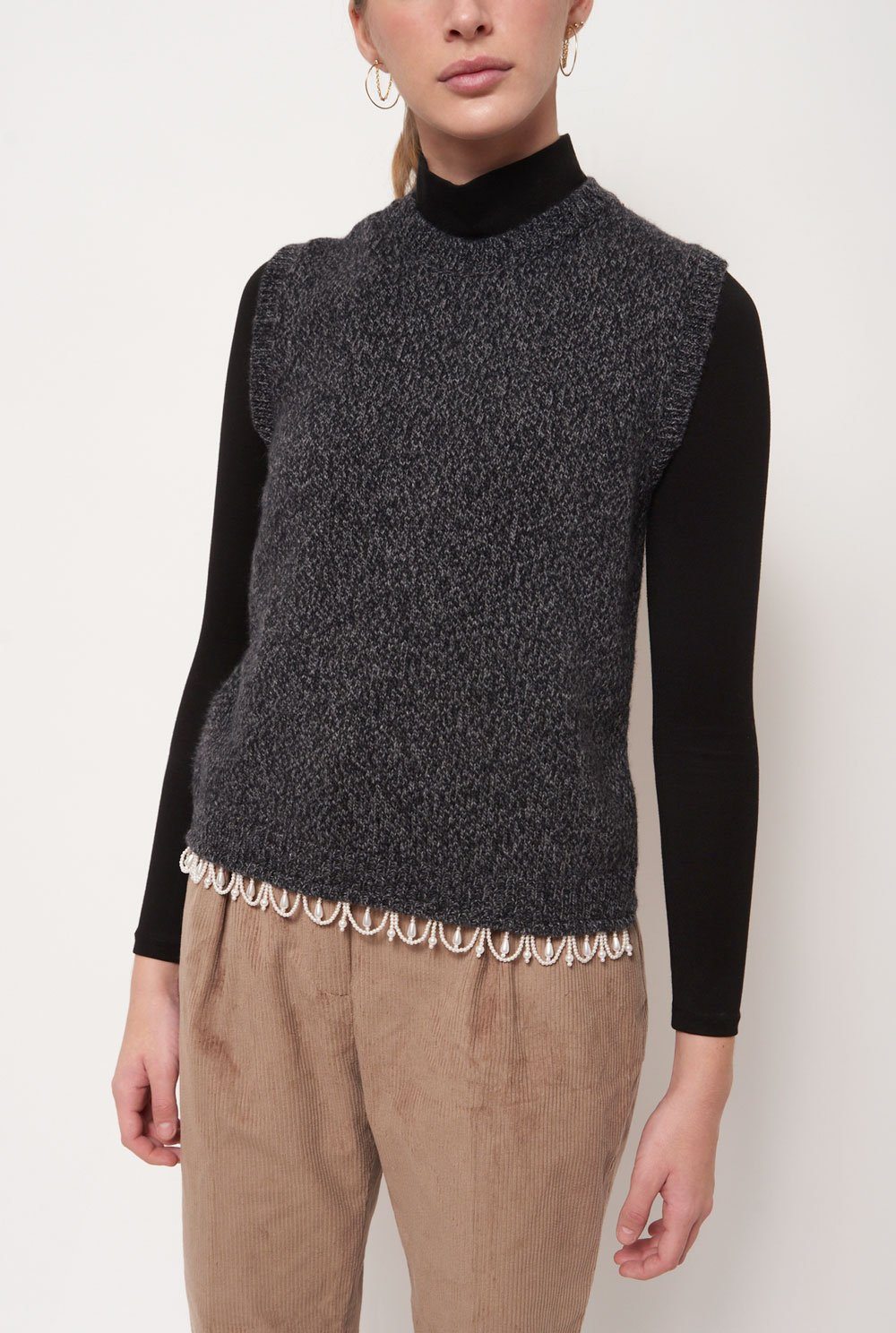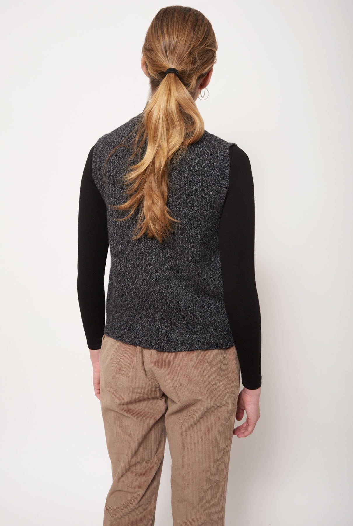 El chaleco de cuello redondo mumu es un tejido de punto sin mangas hecho de 100 % lana. Este chaleco presenta aplicaciones de colores en los hombros y en la parte inferior de la prenda. Diseñado por Laia Alen.