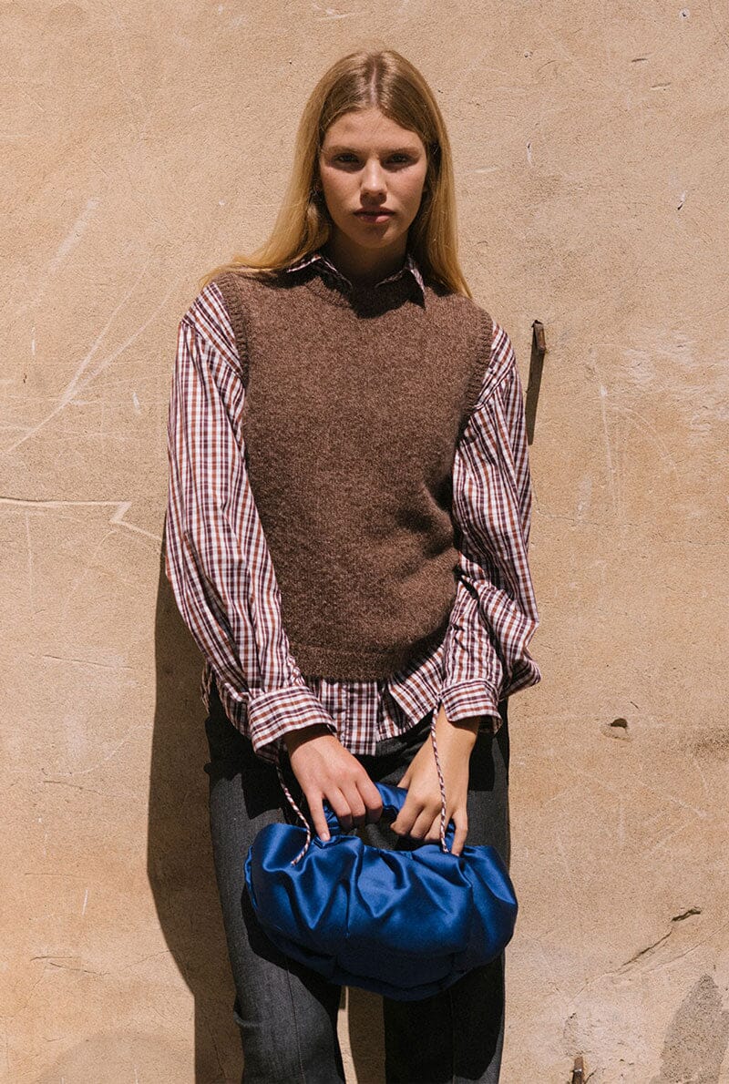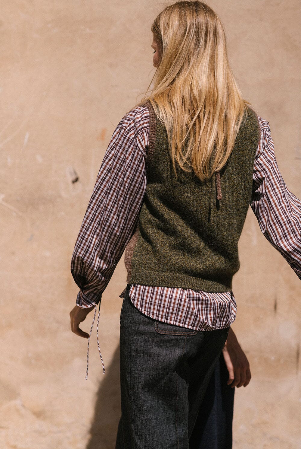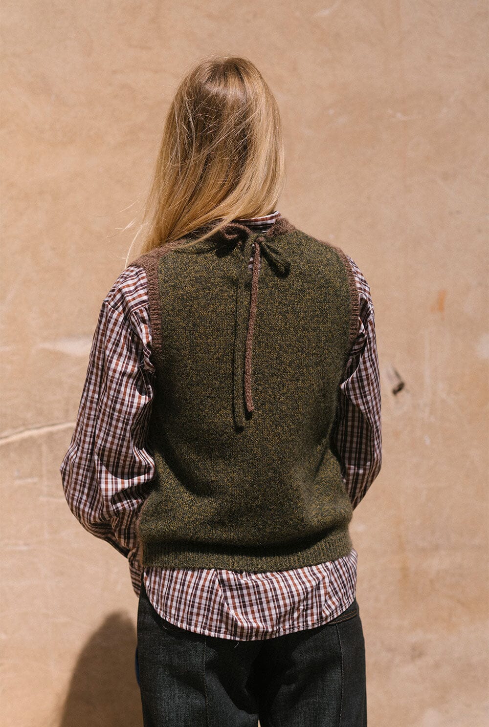 El chaleco de cuello redondo Mumu es un tejido sin mangas confeccionado en 100 % lana en dos colores diferentes. Se acentúa con un cierre de cinta tejida en la parte posterior.