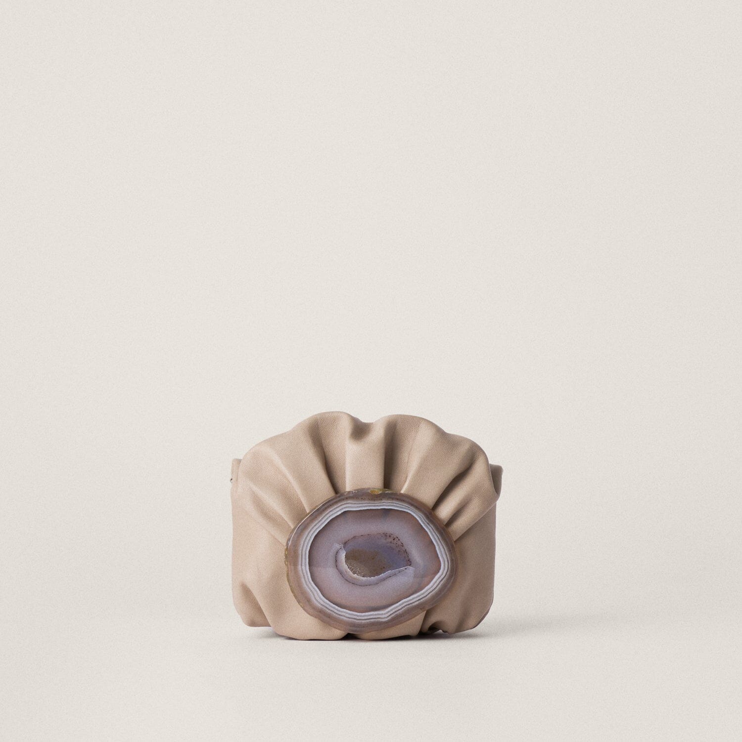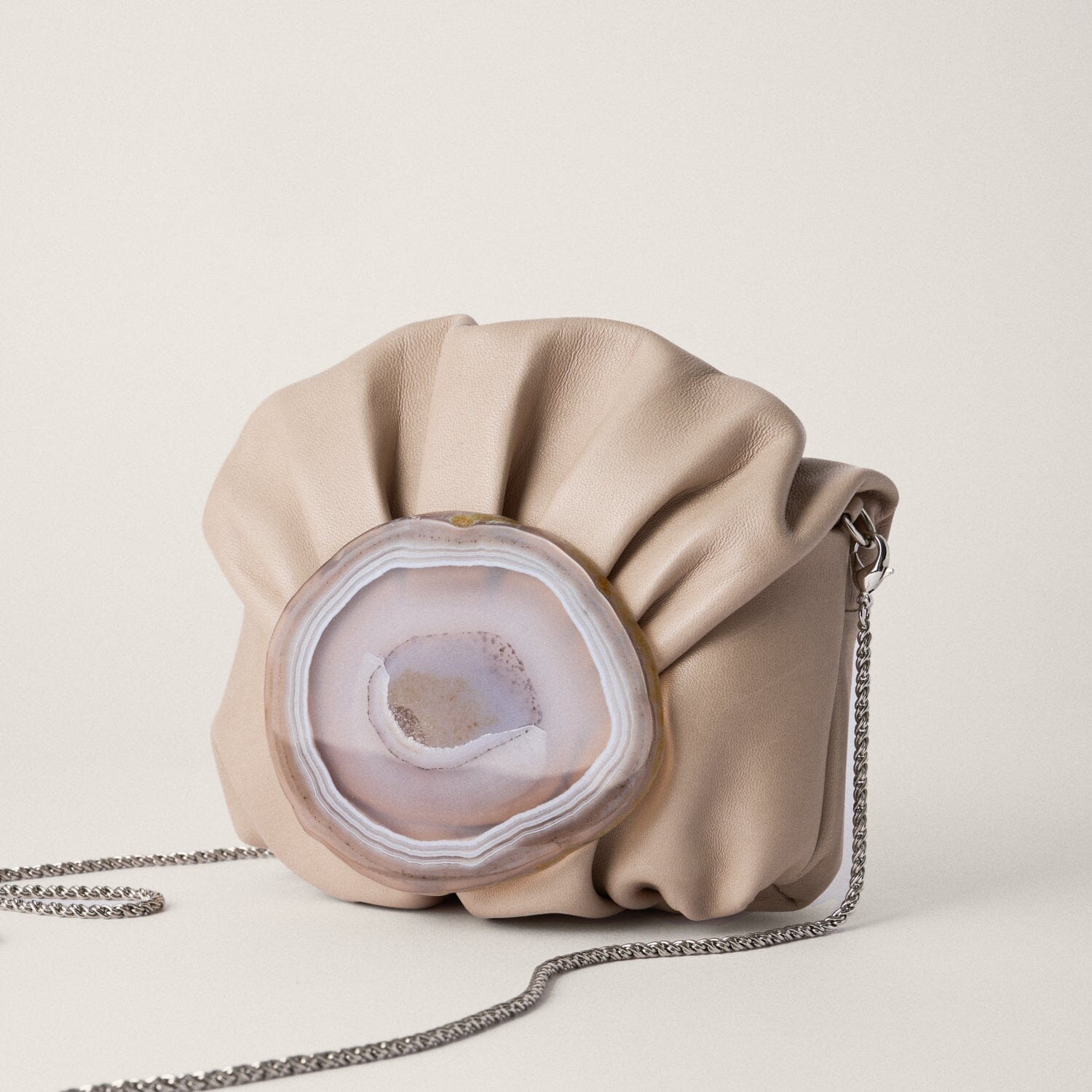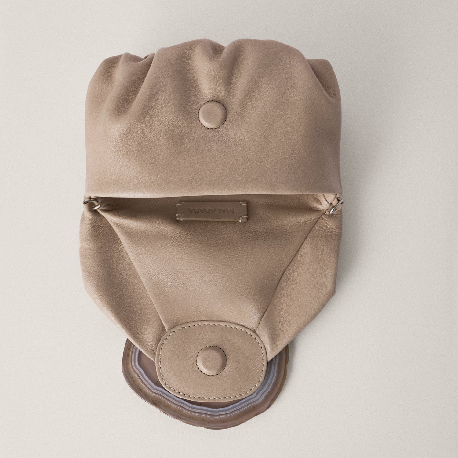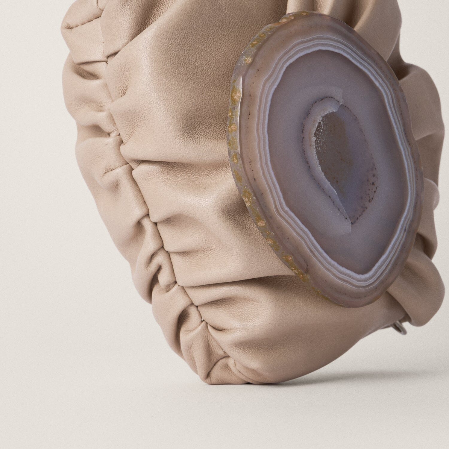 Pequeño clutch con estructura fruncida, elaborado en napa de cordero española extremadamente suave y agradable. Su cierre incorpora una pieza de ágata natural, única y exclusiva para cada bolso, seleccionada por nuestro equipo de diseño, por lo que difiere de las que aparecen en las imágenes de nuestra web. Si lo desea, podemos proporcionarle una foto previa antes de realizar la compra online. El cierre es de imán y en el interior tiene un bolsillo pequeño.