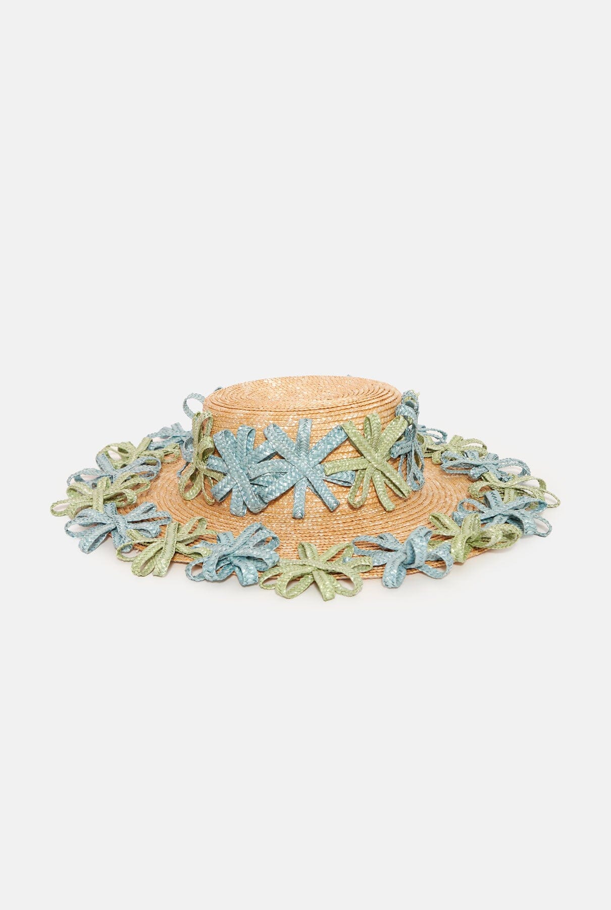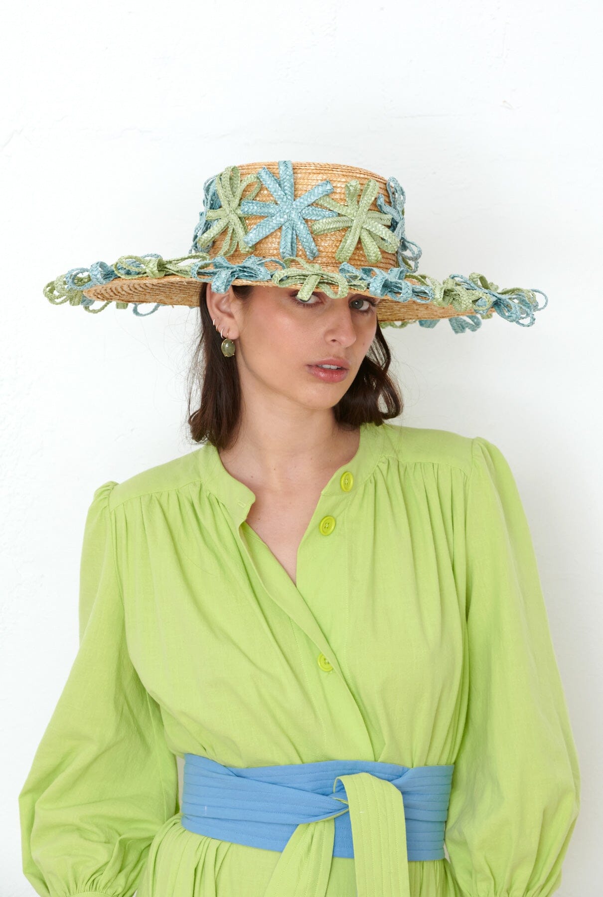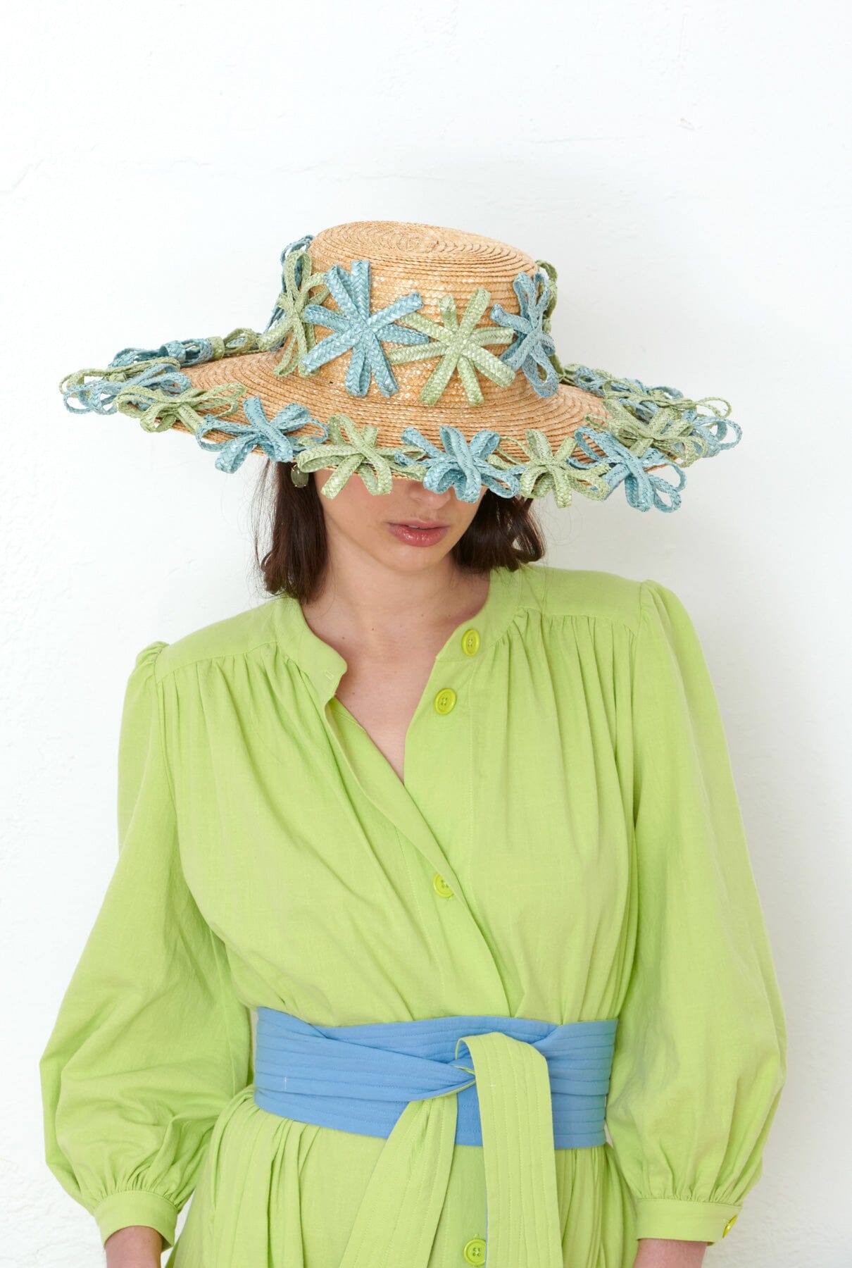 Sombrero de paja de trigo natural con copa alta y ala ancha. Decorado con dos hileras de flores azules y verdes del mismo material, le da un toque original.