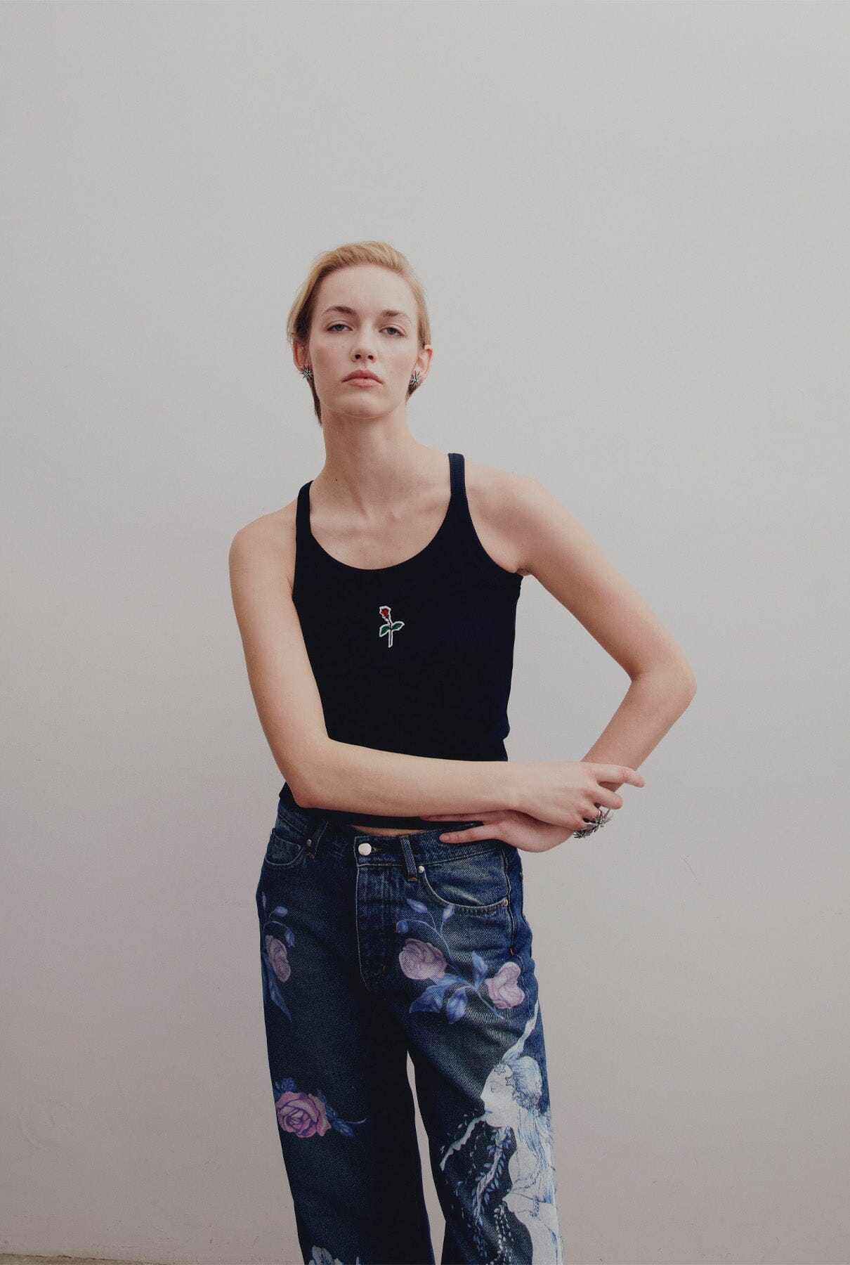 Camiseta de tirantes Yconic canalé azul marino. Parche con el logo de Ynesuelves Rose bordado en la parte delantera. Ajustado.