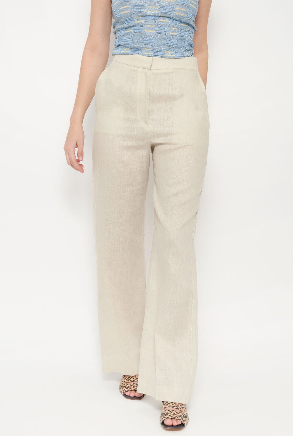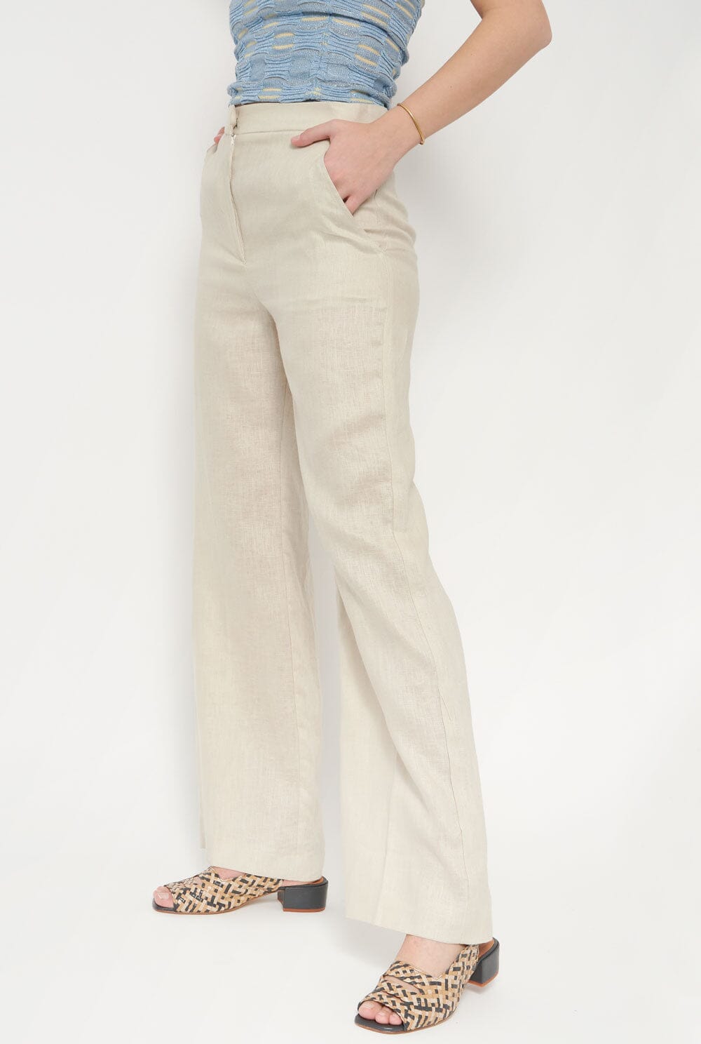 Pantalón de cintura alta de lino. Bolsillos delanteros. Pernera ancha. Bragueta con cremallera delantera y gancho metálico. Lavar a mano, planchar a baja temperatura, no secar en secadora, no usar lejía. Diseñado por Alava Brand