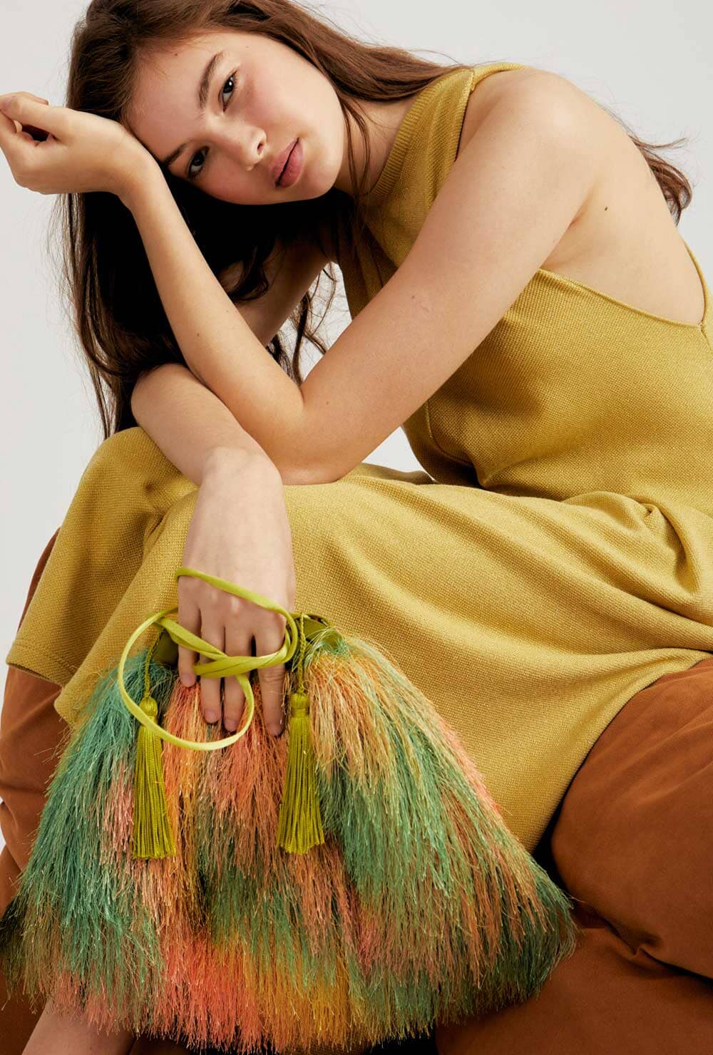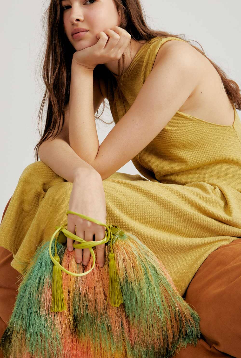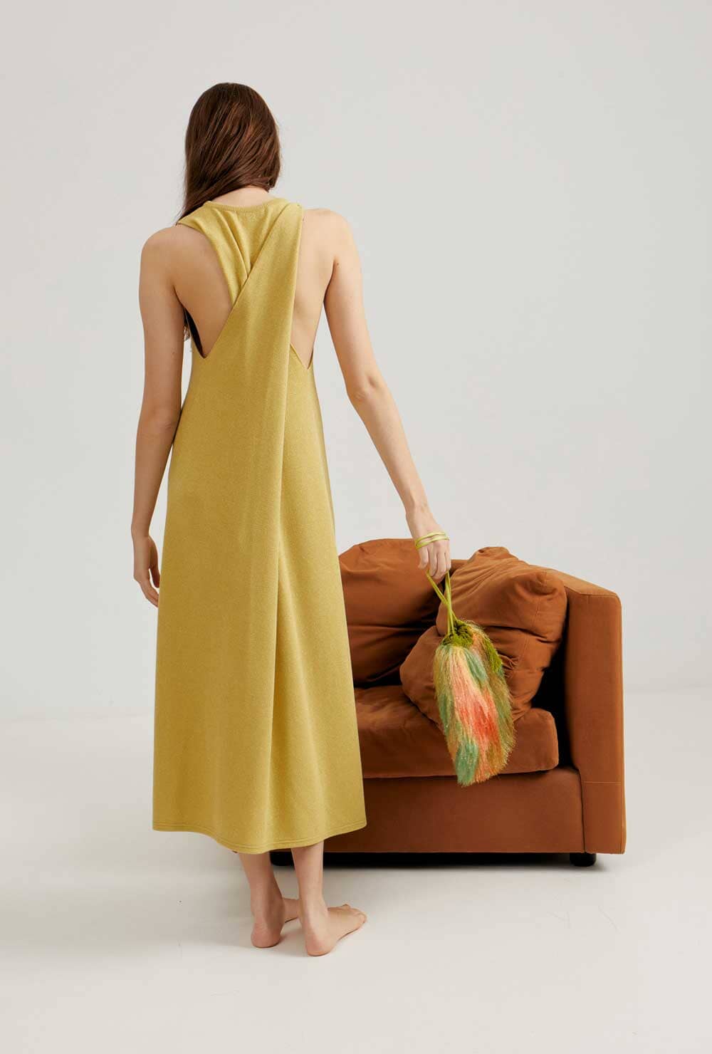 El tejido de punto del vestido nora es de un dorado claro con un ligero toque de purpurina.