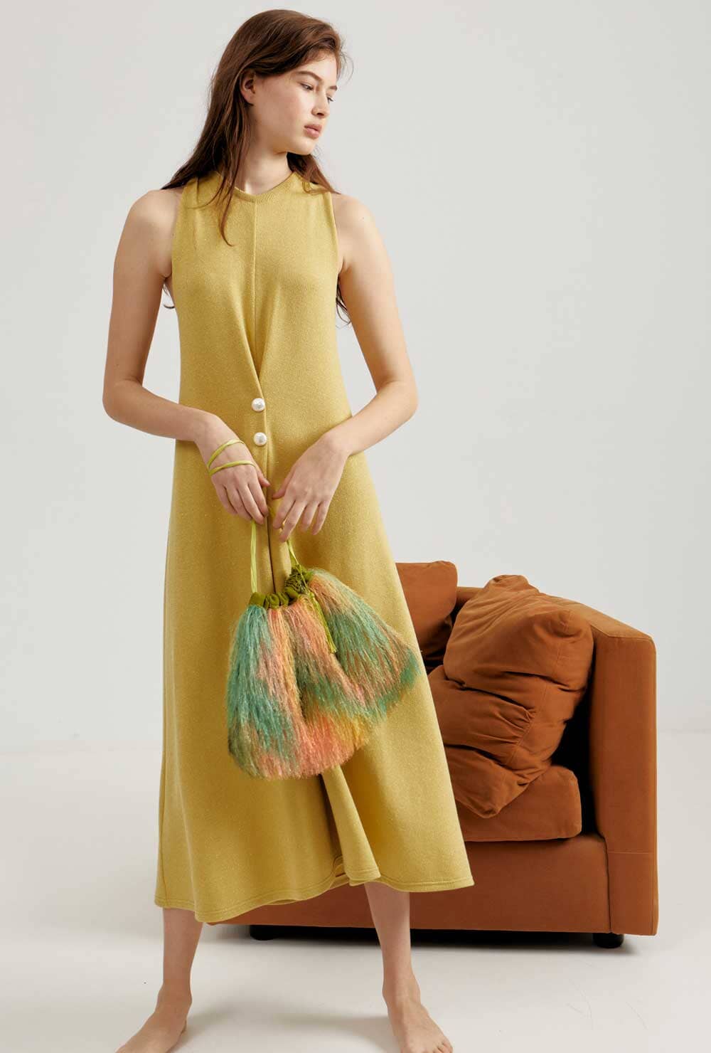 Este vestido de punto sin mangas tiene un cuello redondo en la parte delantera y un detalle retorcido en la tela de punto en la espalda. Tiene un fruncido en la cintura asegurado con dos botones de perlas adornados y una falda con vuelo que tiene la longitud perfecta para mostrar los pies.