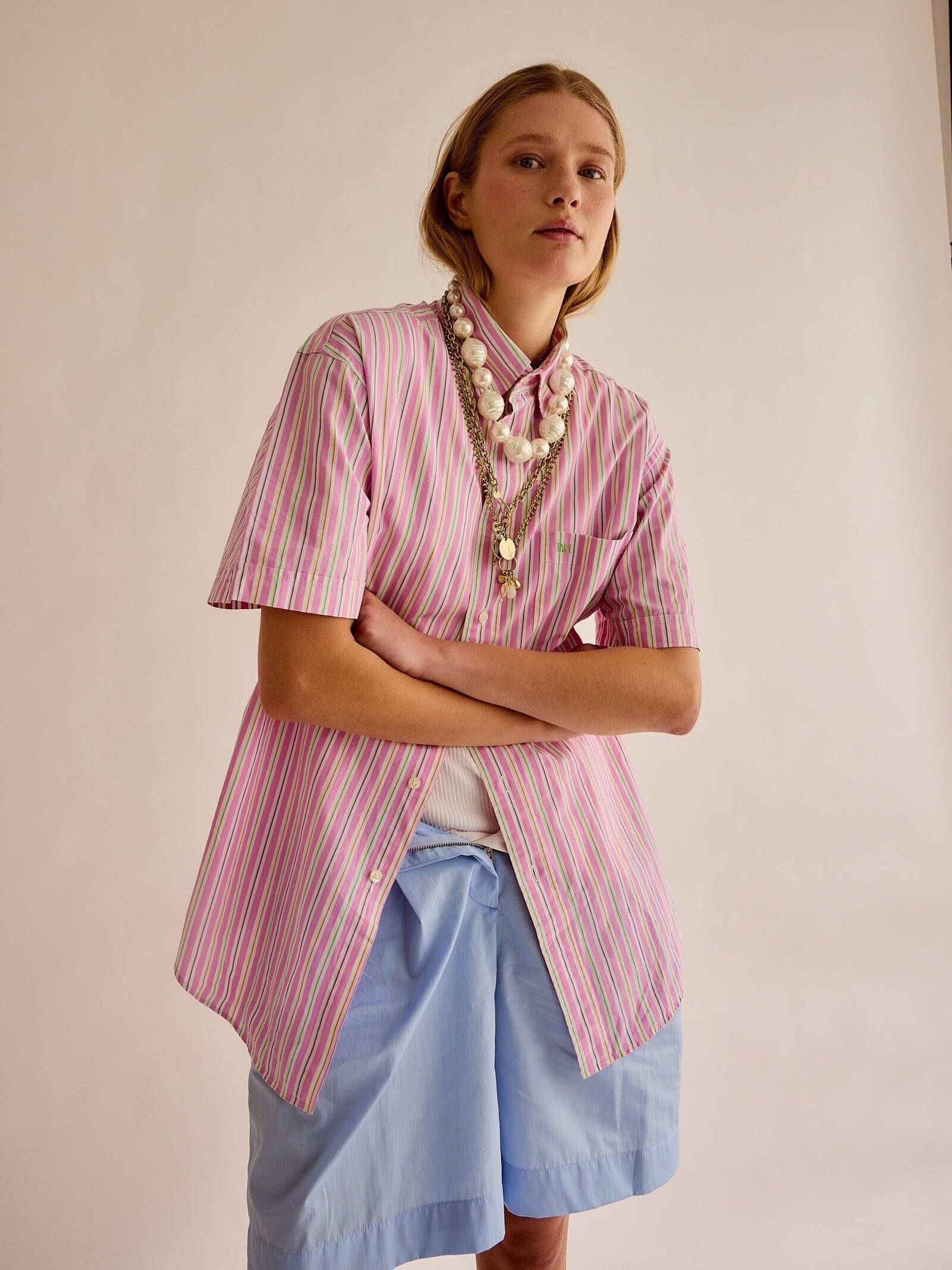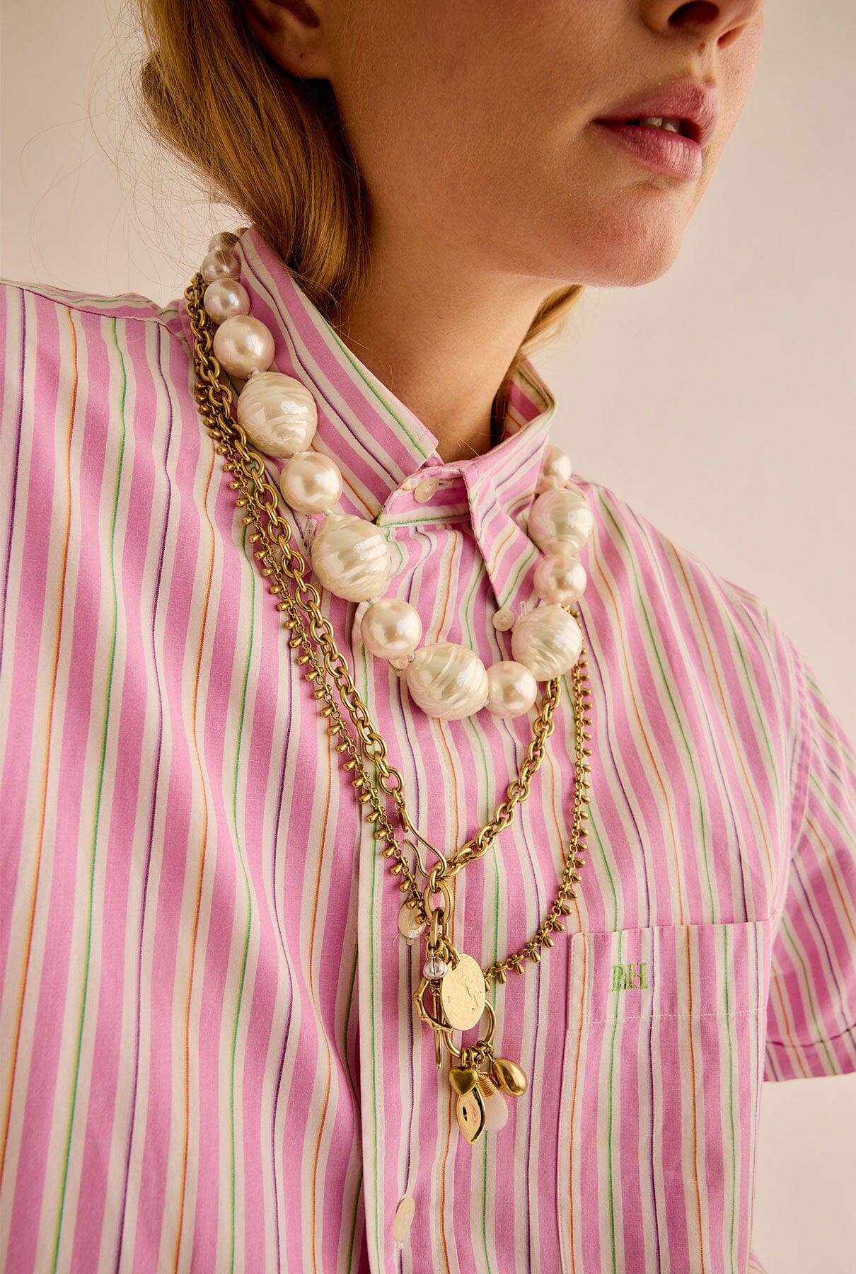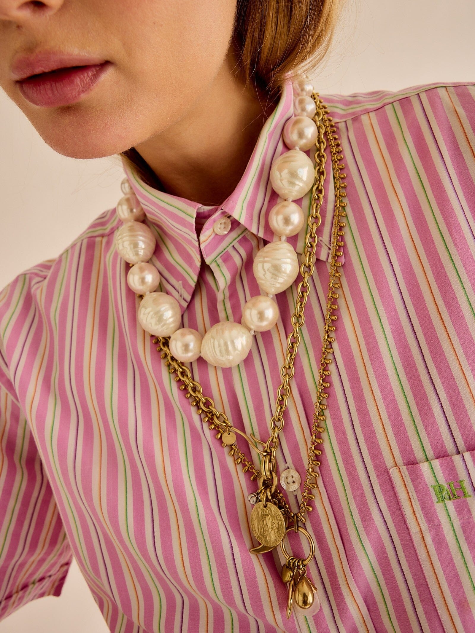 Half bust necklace, made of different sized pearl beads with a crystal core.