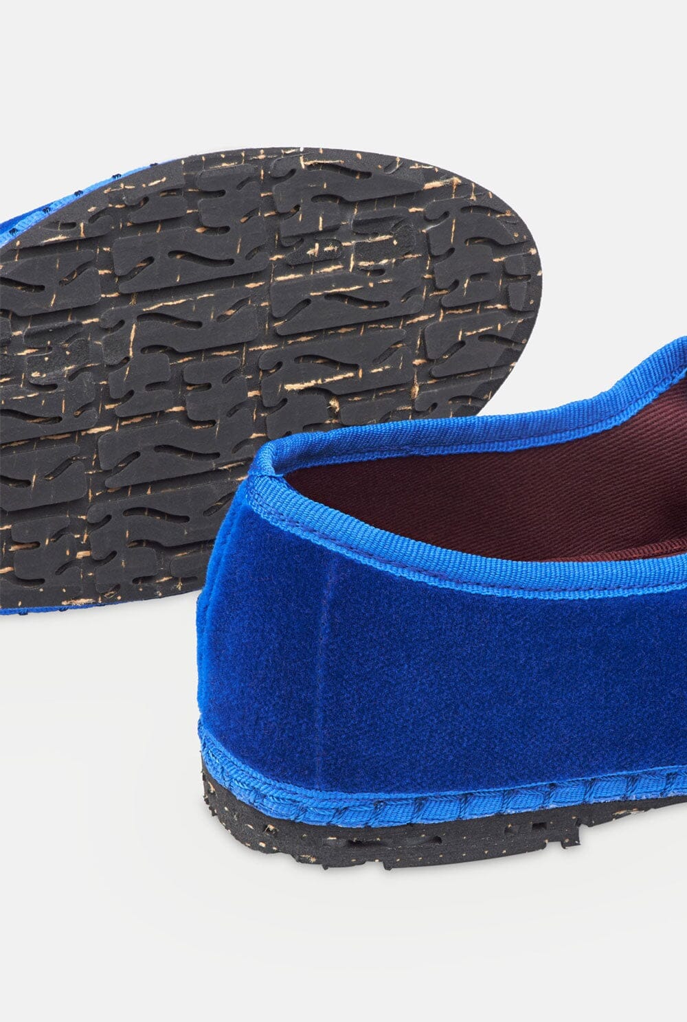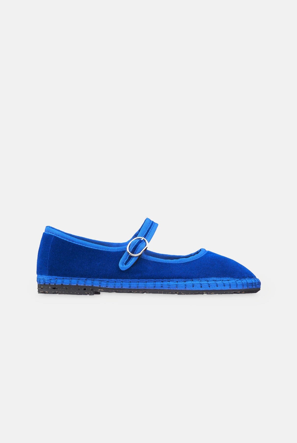 Mercedita de terciopelo en color azul intenso con ribetes en azul intenso y cierre de hebilla. El exterior del zapato es de terciopelo 100% algodón, y el interior del zapato está fabricado con forro de algodón orgánico transpirable y plantilla de tejido antibacteriano 100% transpirable. La suela está hecha de caucho procedente de neumáticos de bicicleta reciclados.