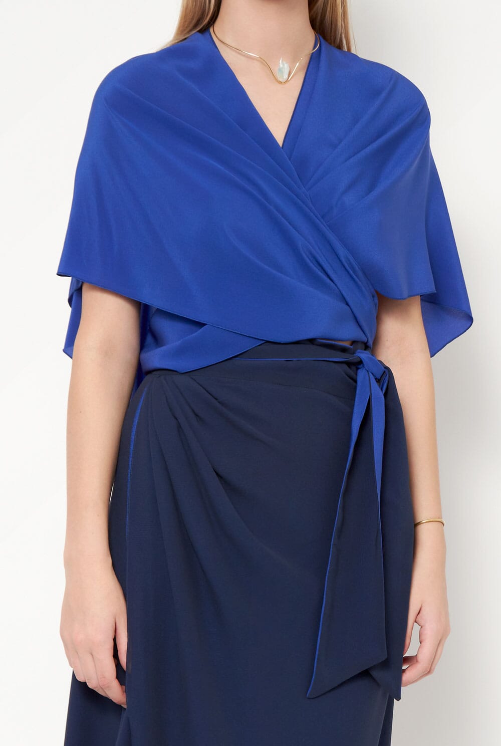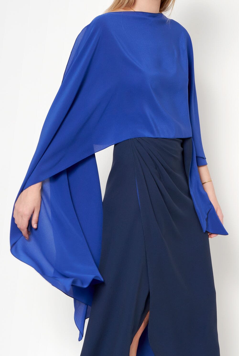 La «Olga» es una capa de crepé 100% seda. Su diseño asimétrico permite anudarla en cualquier parte del cuerpo y utilizarla de muchas formas diferentes.