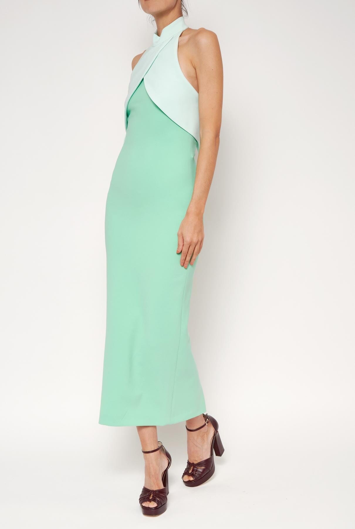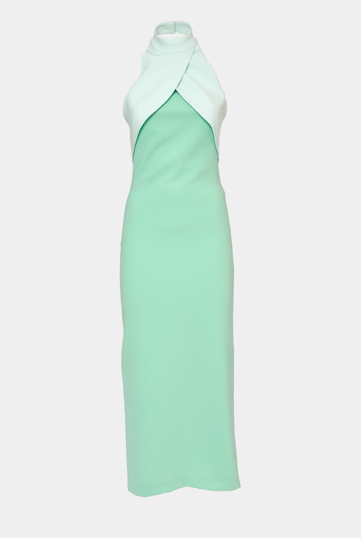 El icónico Montenegro, vestido midi bicolor con cuello halter. Abertura de falda en espalda. Con forro. Hecho en España.
