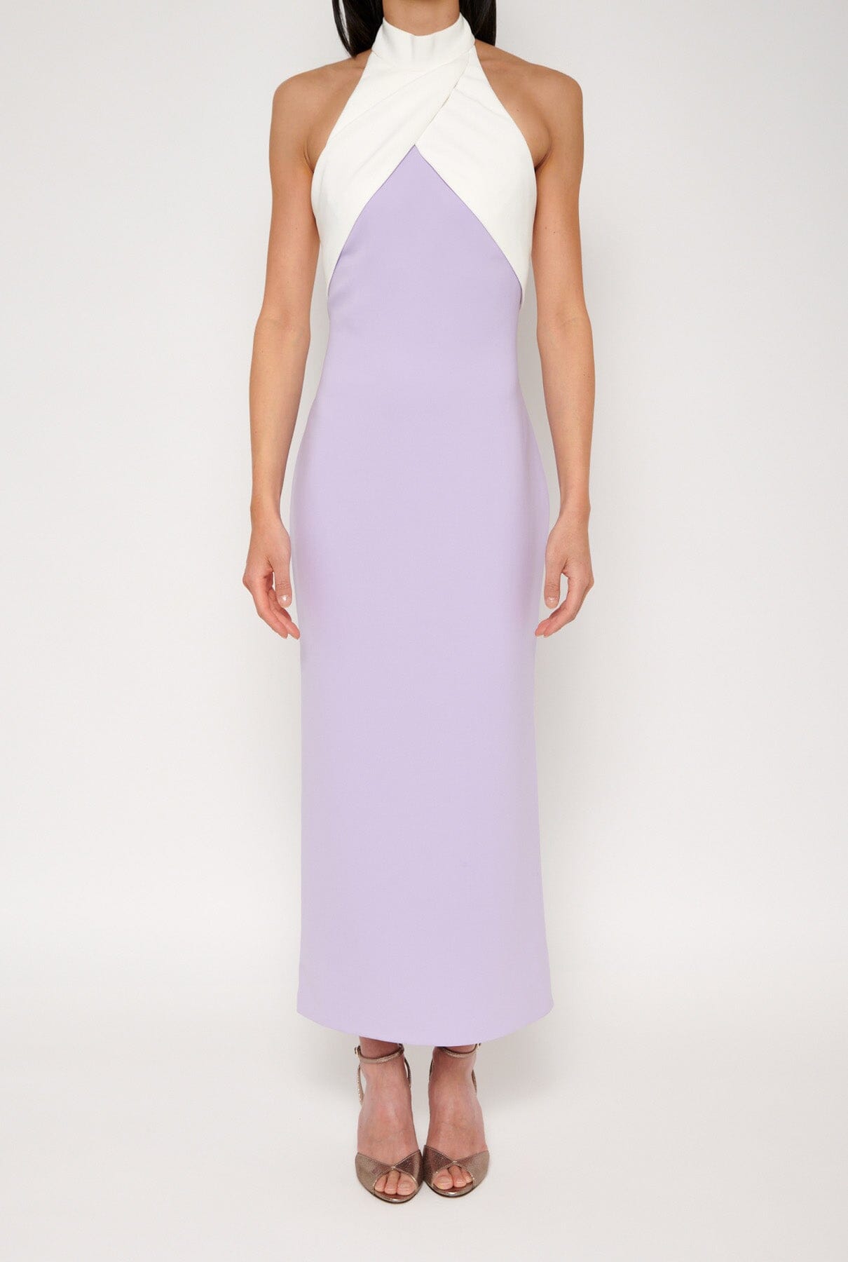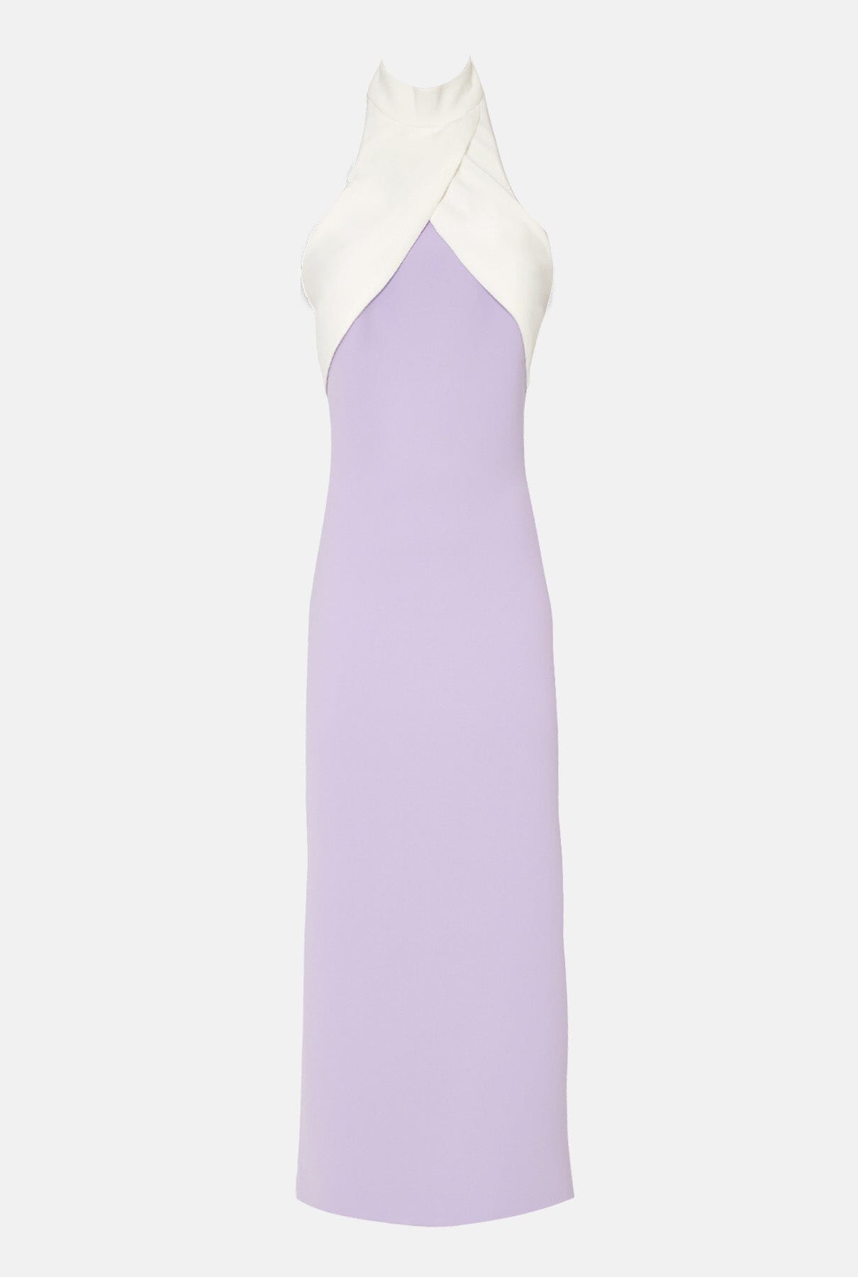 El icónico Montenegro, vestido midi bicolor con cuello halter. Abertura de falda en espalda. Recubrimiento. Hecho en España.