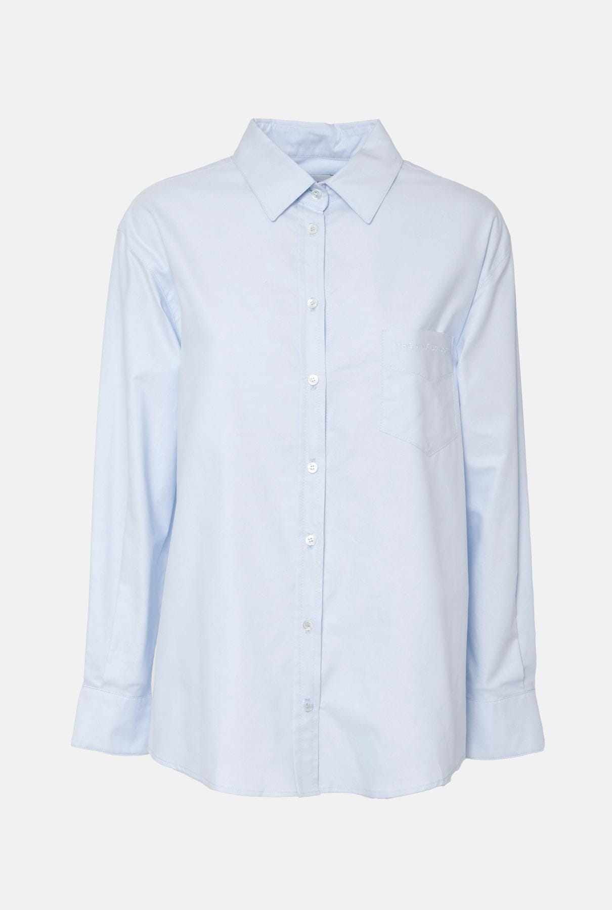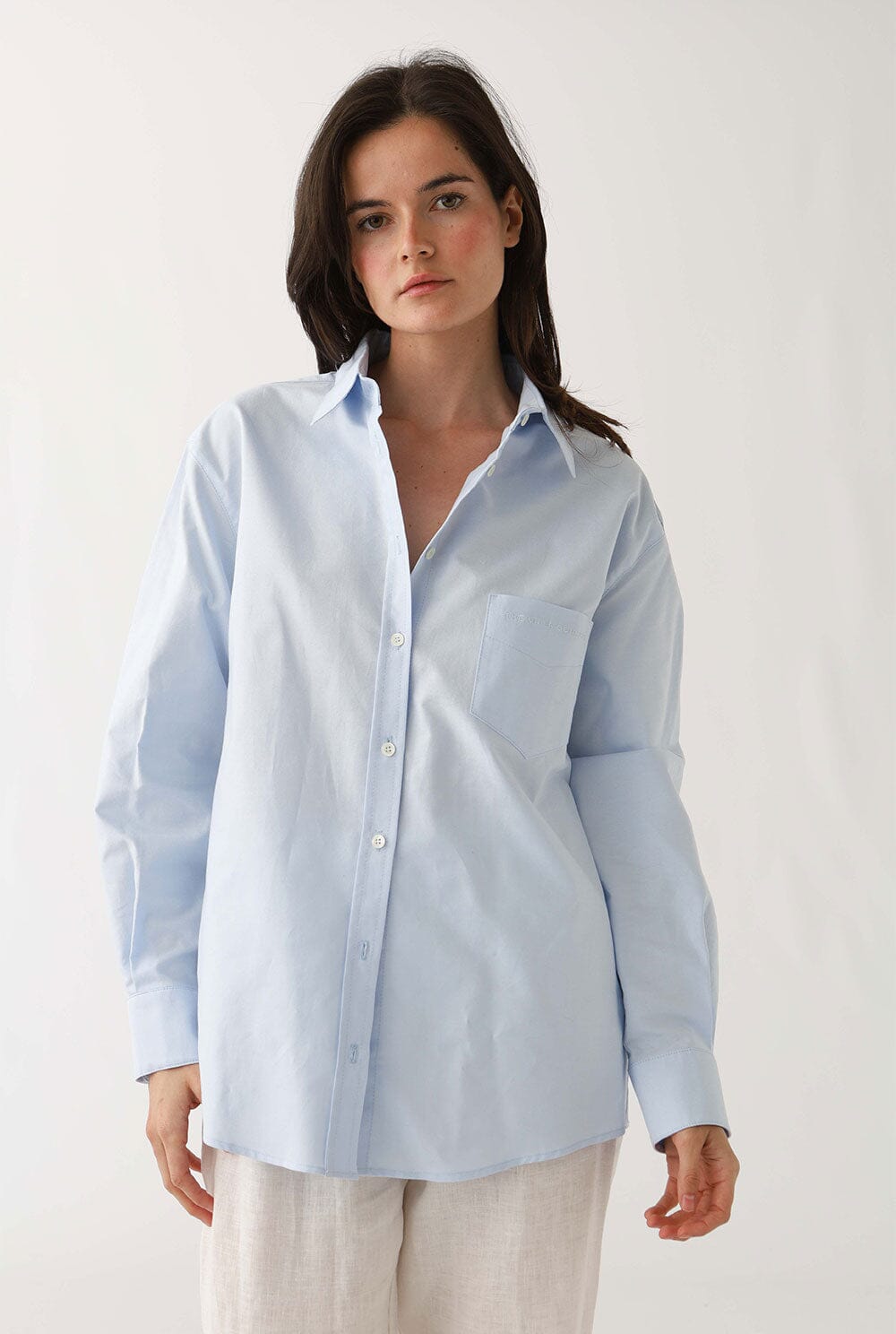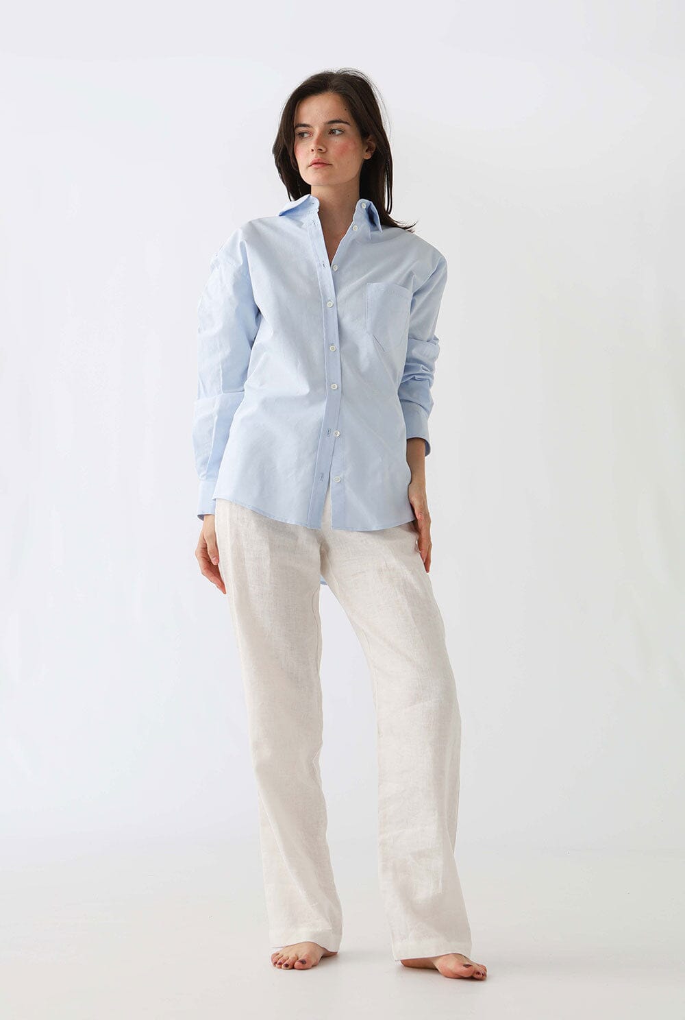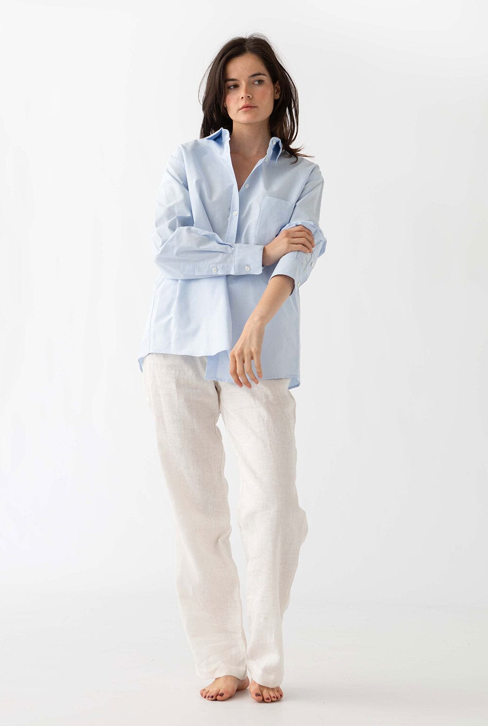 Diseñado y producido en España, con botones nacarados, corte cuadrado y puño ancho para mayor comodidad. Disponible en dos colores, blanco y azul claro.