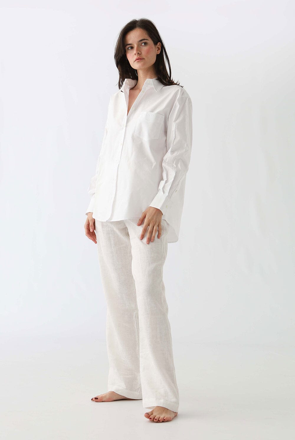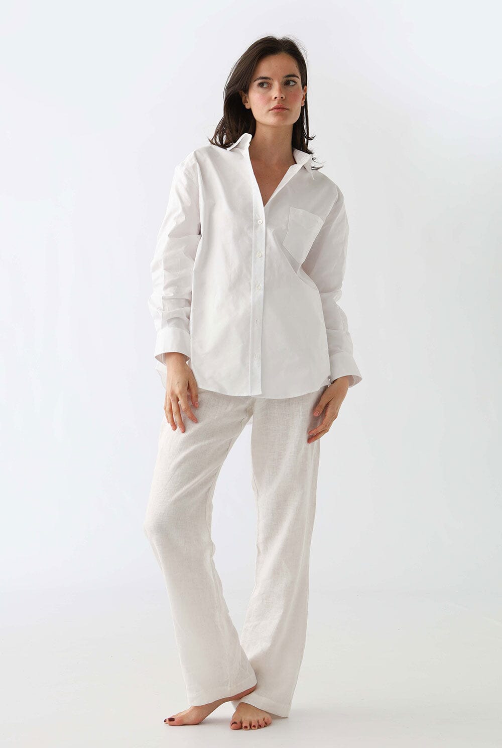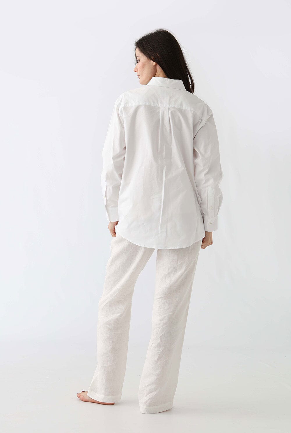 Diseñado y producido en España, con botones nacarados, corte cuadrado y puño ancho para mayor comodidad. Disponible en dos colores, blanco y azul claro.