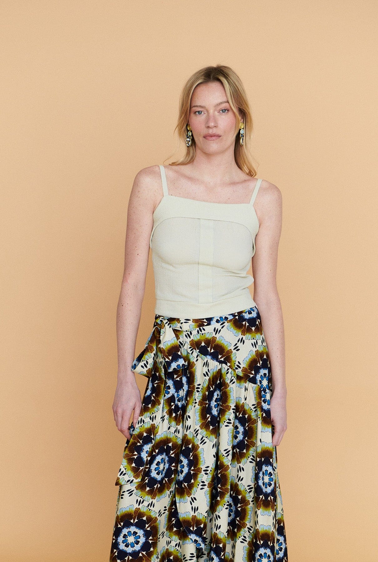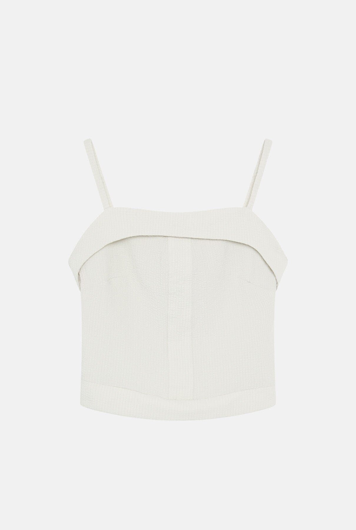 Top en tejido texturizado. Original forma redondeada en escote y espalda con tirantes. Cierre con cremallera lateral. Para un look completo se puede combinar con la falda Carlota o Claudia. En 3 tonos: blanco, piedra y caqui.