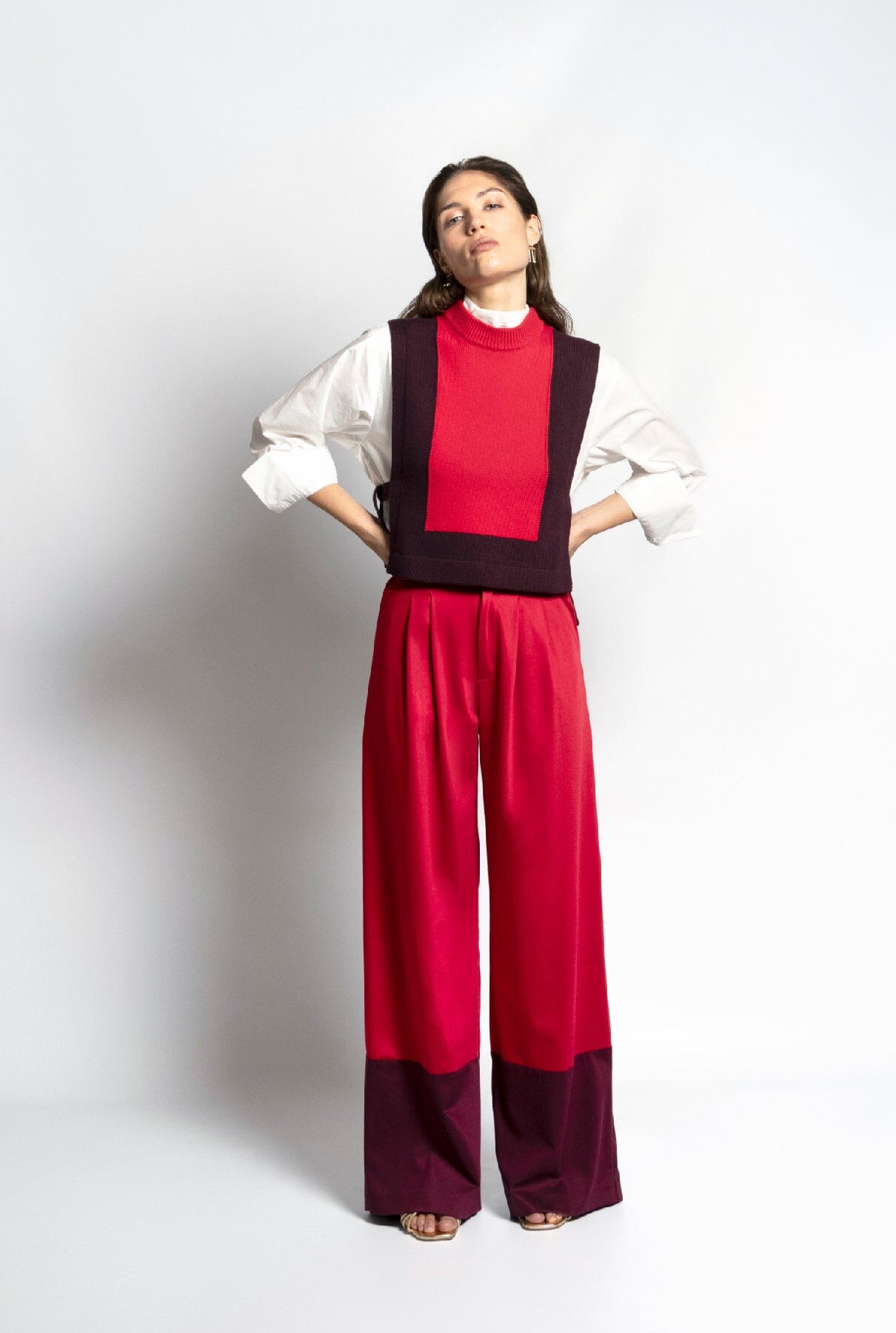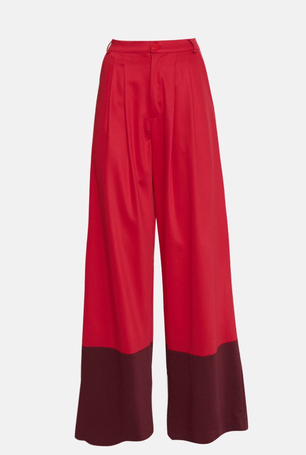 Pantalón de tiro alto y pernera ancha con dos pinzas. Tiene bajo en contraste de color granate. Está confeccionado en tejido de rayón-lyocel-spanx.