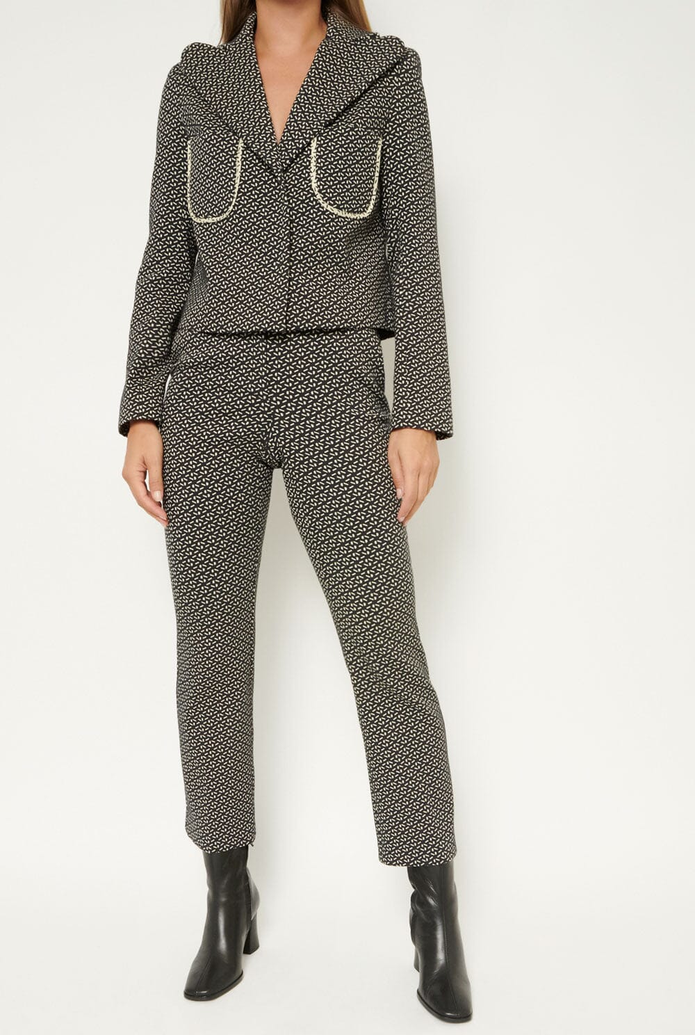 Ratones Jackuar con fondo negro. Bolsillos laterales. Se cierra con cremallera y botón delante. Súper cómodo con pierna ligeramente trompeta.