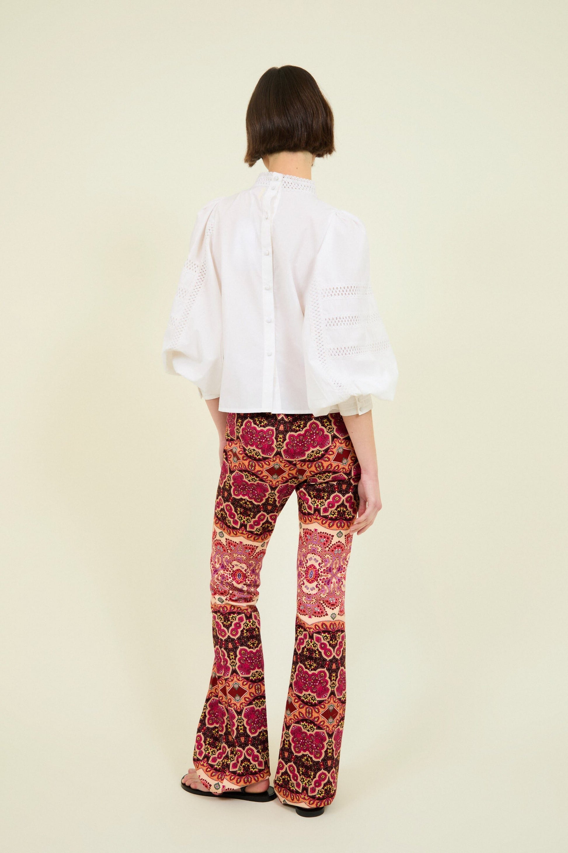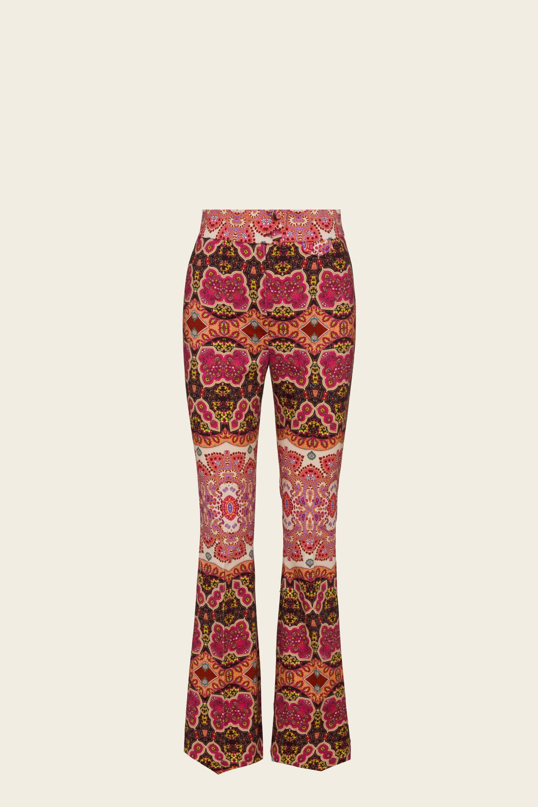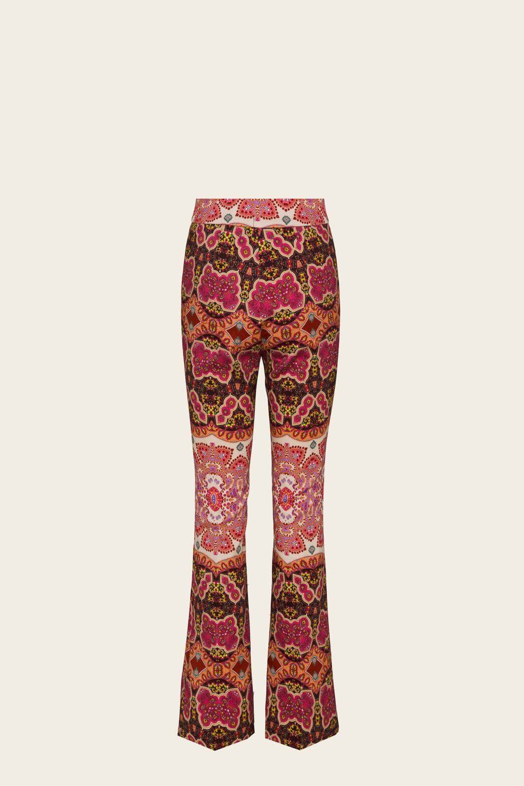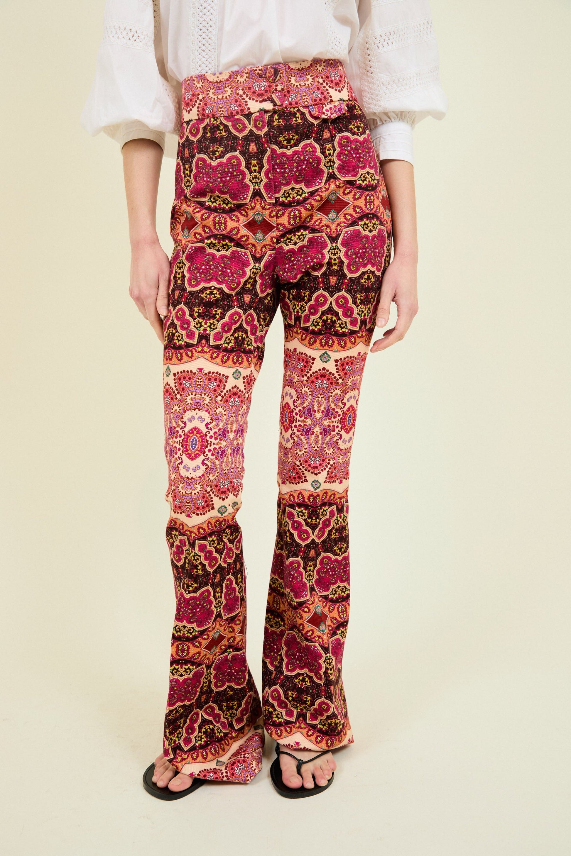 El pantalón Bella en rosa es un diseño acampanado, confeccionado en 100 % algodón, un tejido ligero, ideal para la temporada de primavera-verano. Luce un original estampado que adorna toda la prenda.