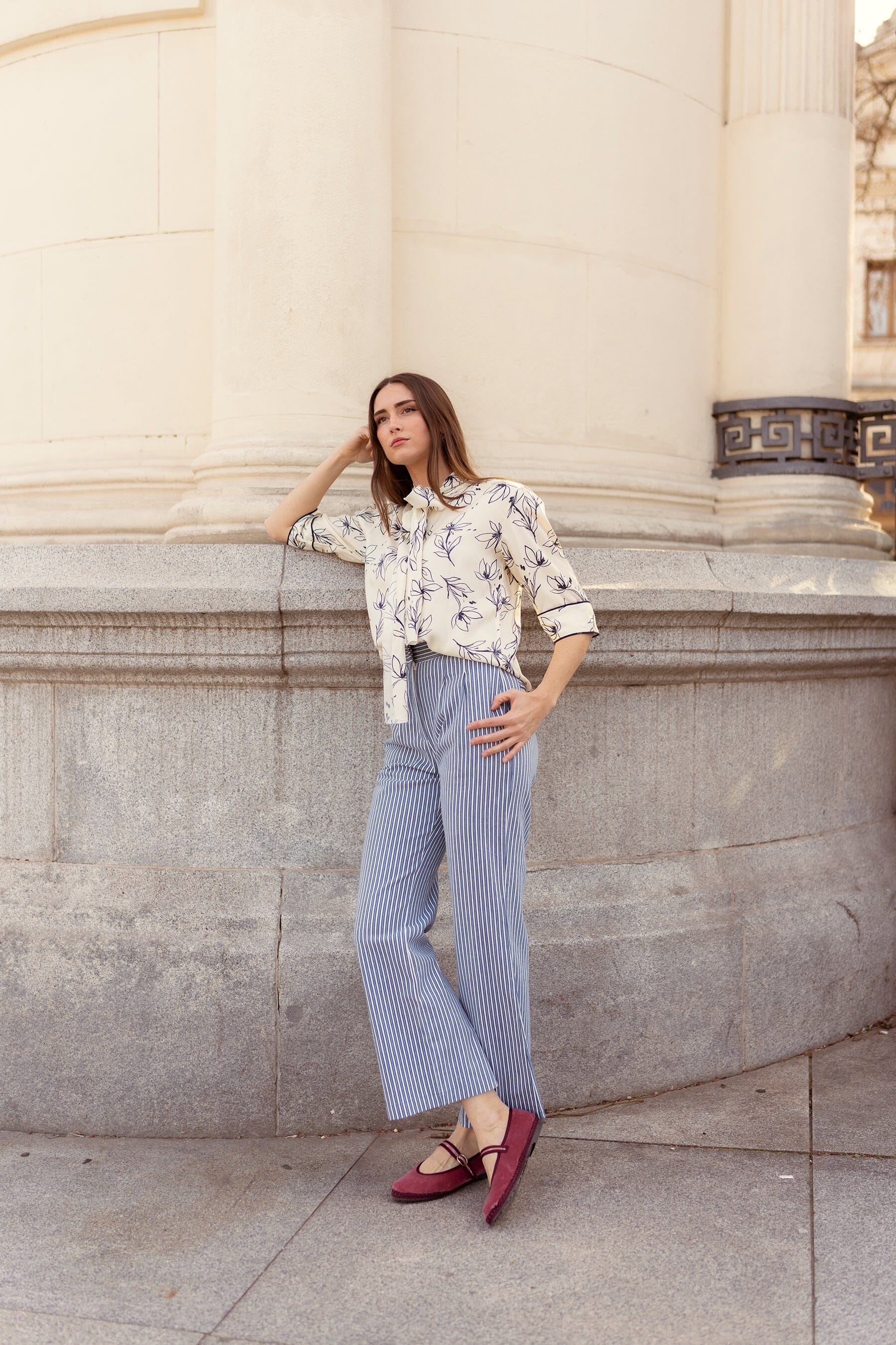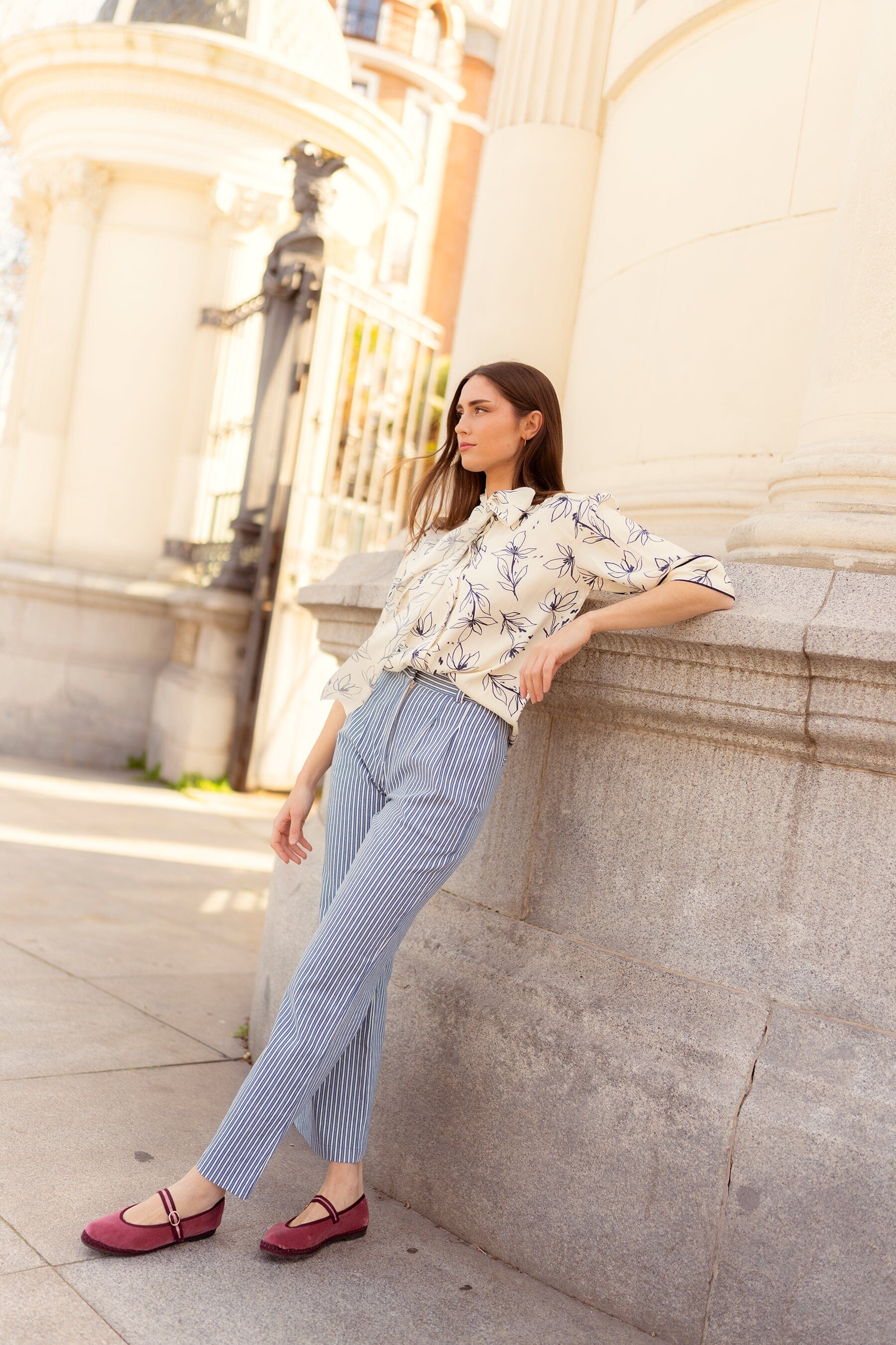 Pantalón con pinzas, cierre frontal con botón interior y cremallera en tejido de rayas en azul y crudo. Bolsillos laterales y detalle de bolsillo falso en la espalda. Largo hasta los zapatos: la modelo mide 1,80 m.