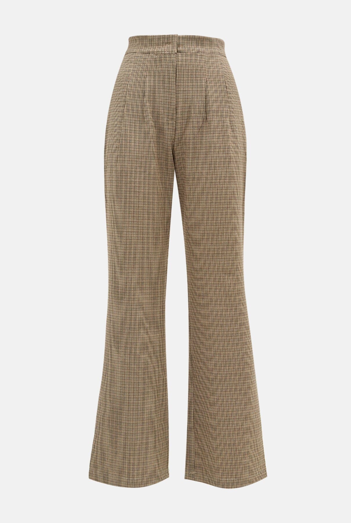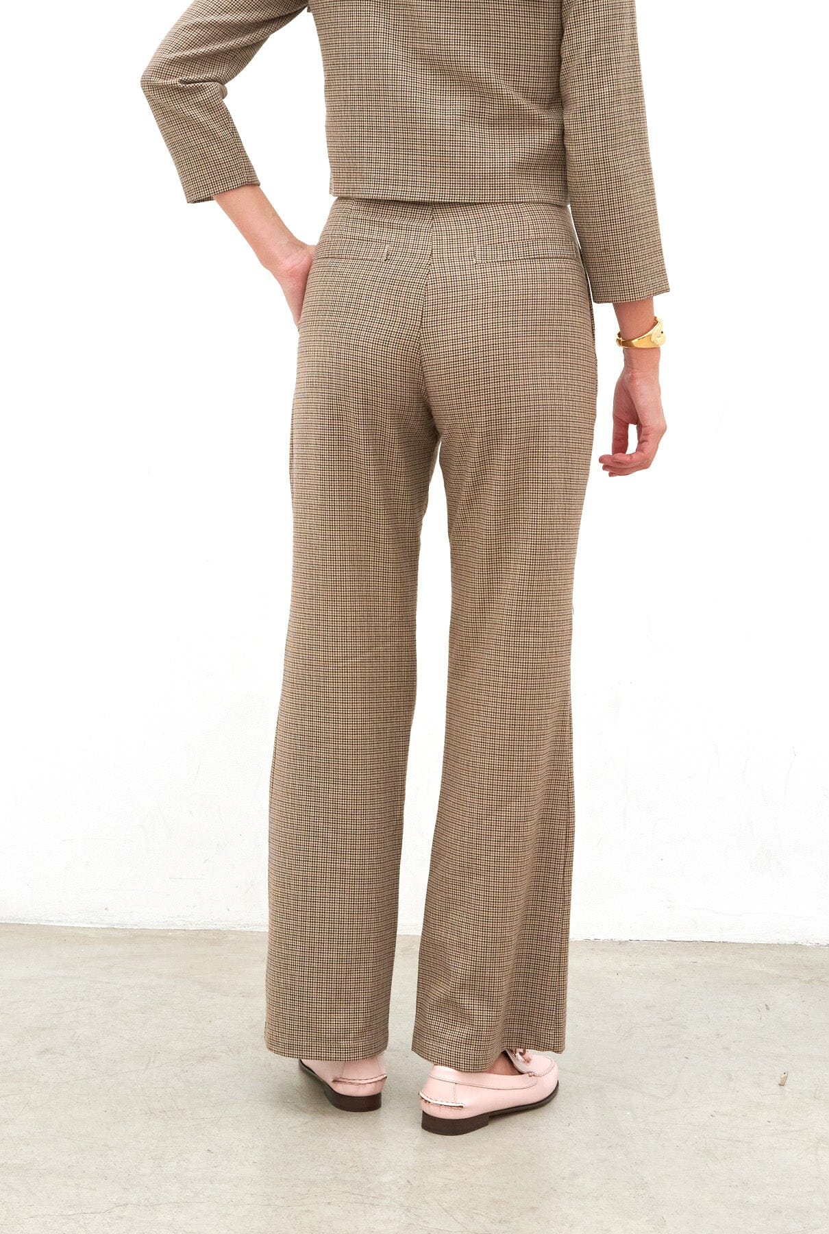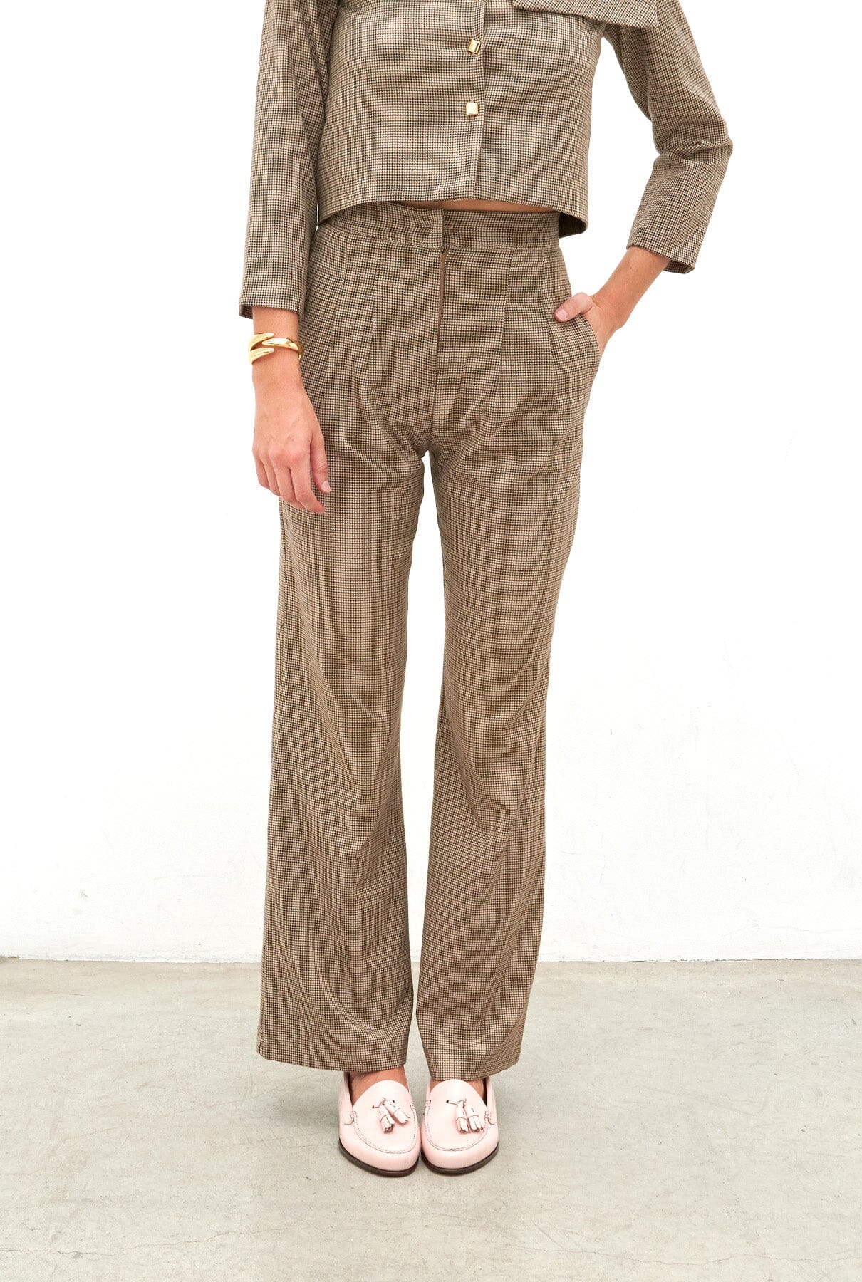Pantalón con pinzas, cierre frontal con botón interior y cremallera en tejido pata de gallo en color beige y marrón. Bolsillos laterales en costura y detalle de falso bolsillo en la parte trasera.