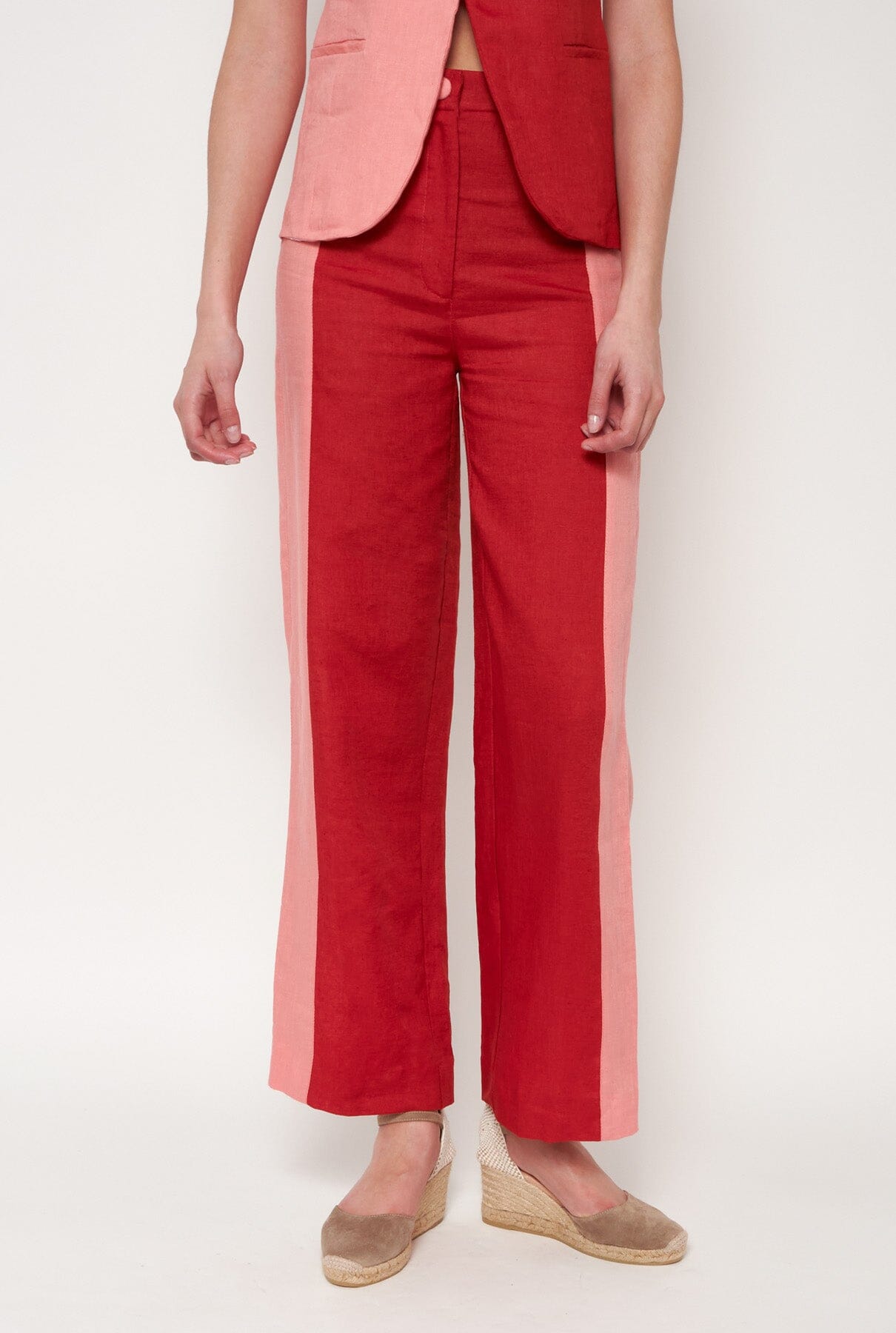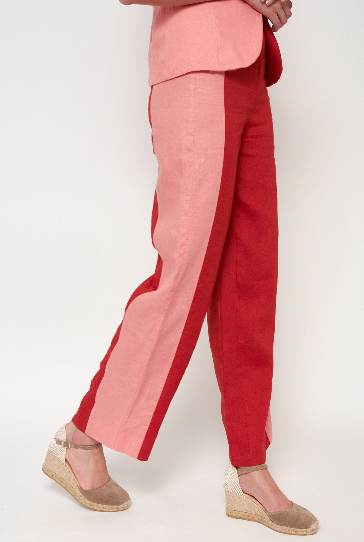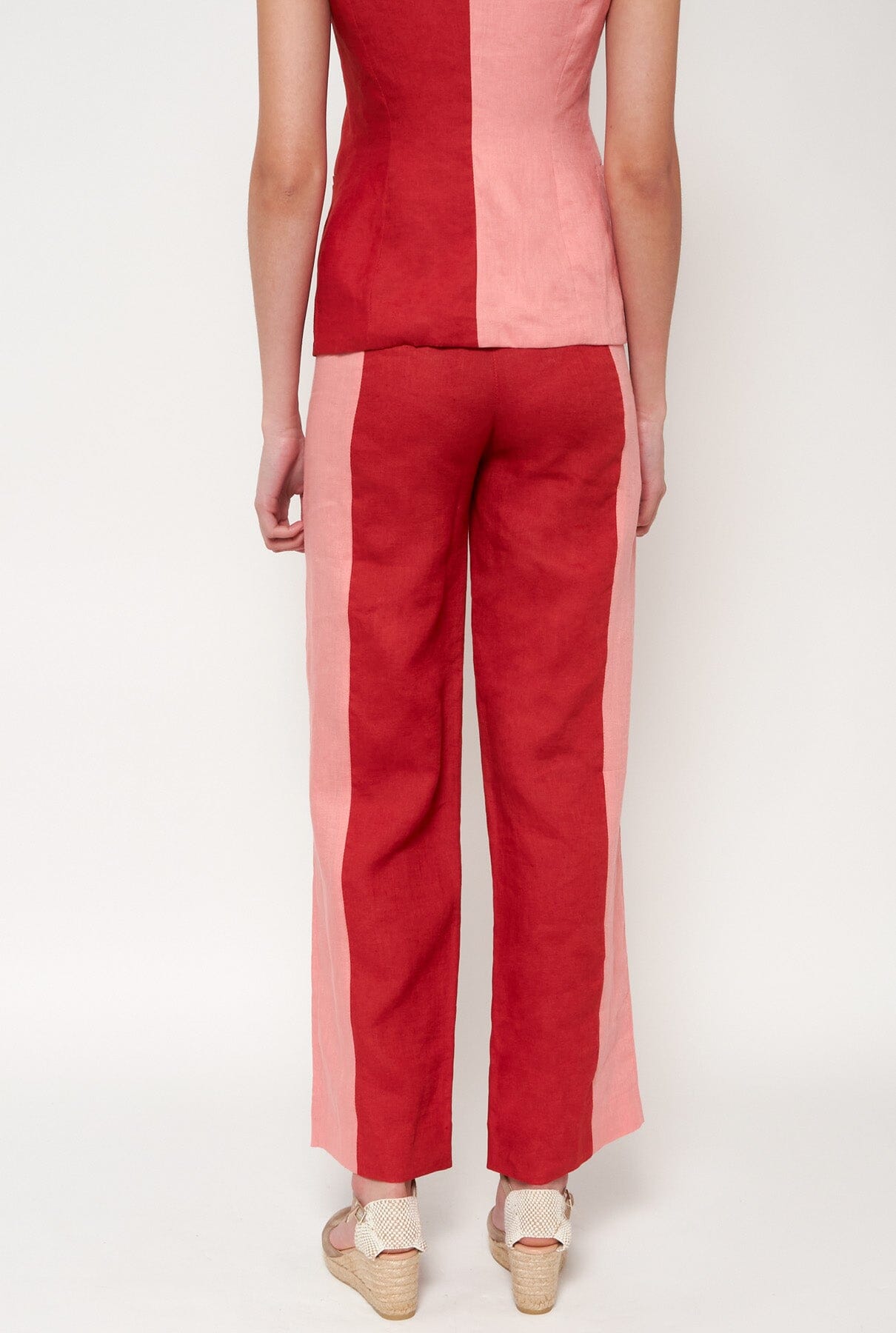 Pantalón hecho a mano en nuestro taller en Lanzarote. Pantalón fluido de tiro alto bicolor. Pierna recta. Cierre frontal con cremallera y botón.