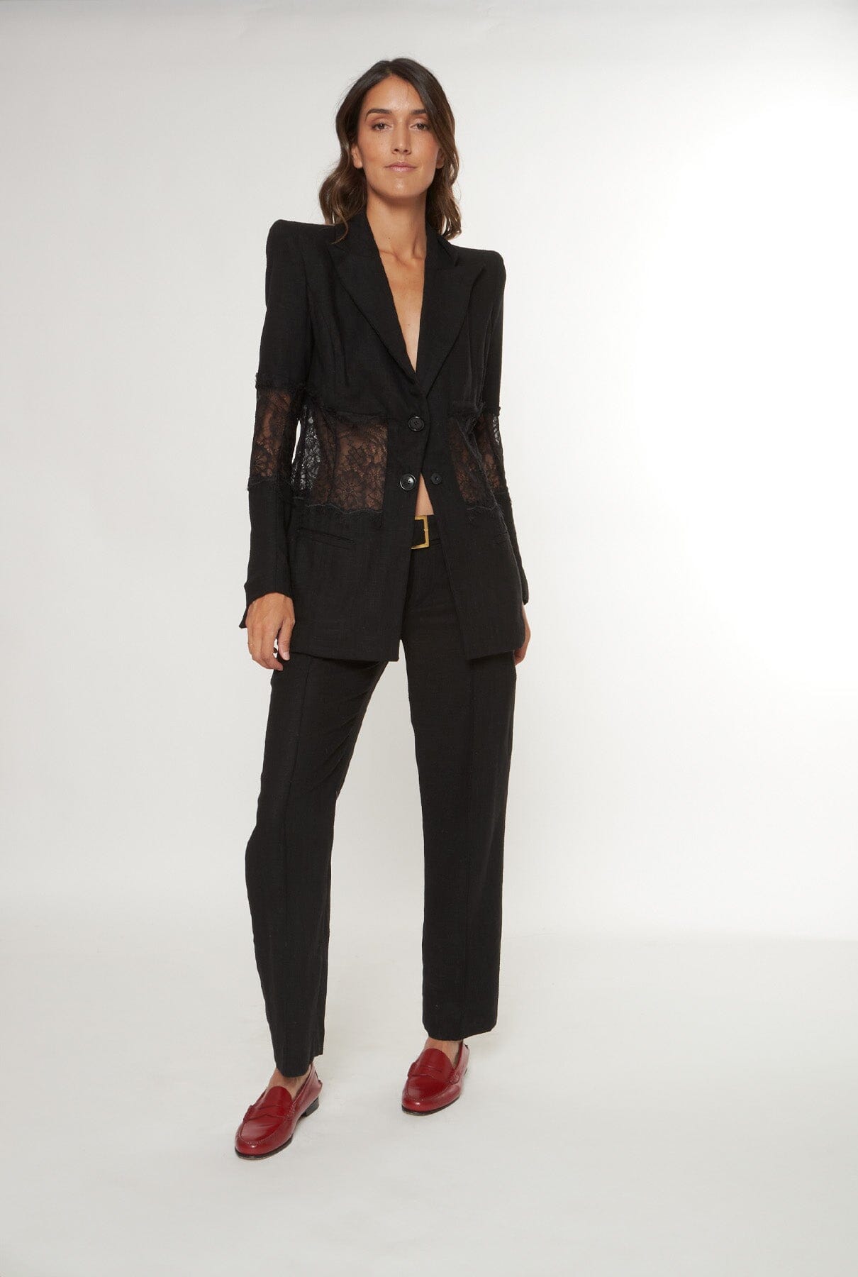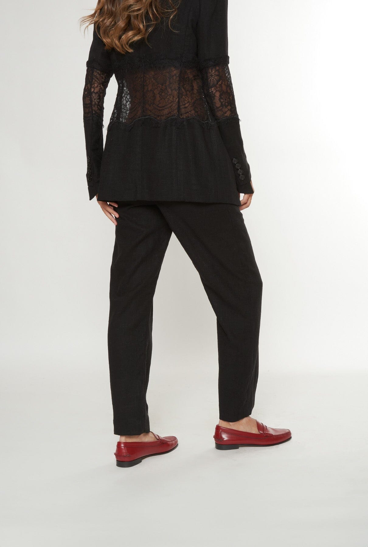 Pantalón de lino con o sin detalle de encaje, largo hasta la cadera, recto y largo hasta el tobillo.