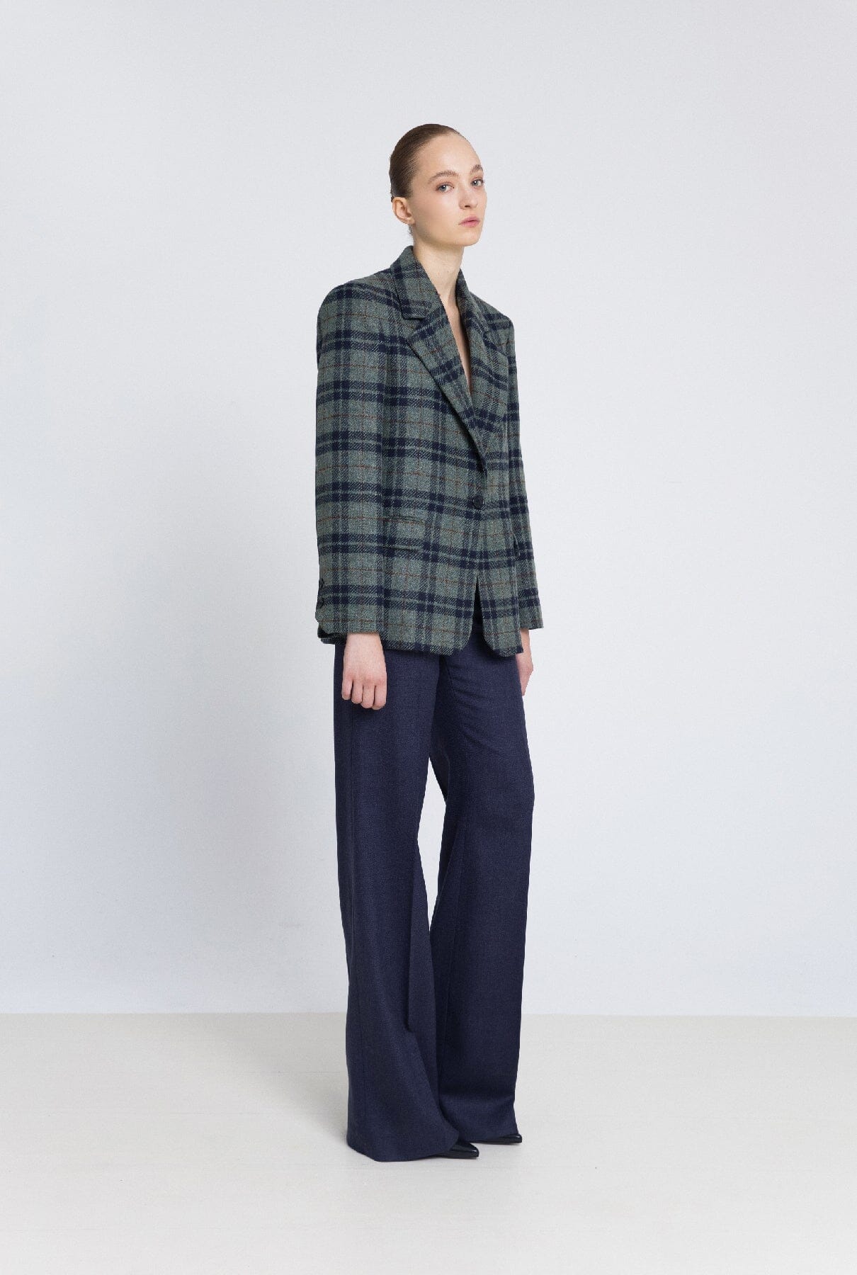 El pantalón acampanado azul marino de 100 % lana es un pantalón que se puede llevar en cualquier ocasión. El patrón acampanado proporciona una silueta femenina y sofisticada que combina comodidad y estilo desenfadado.