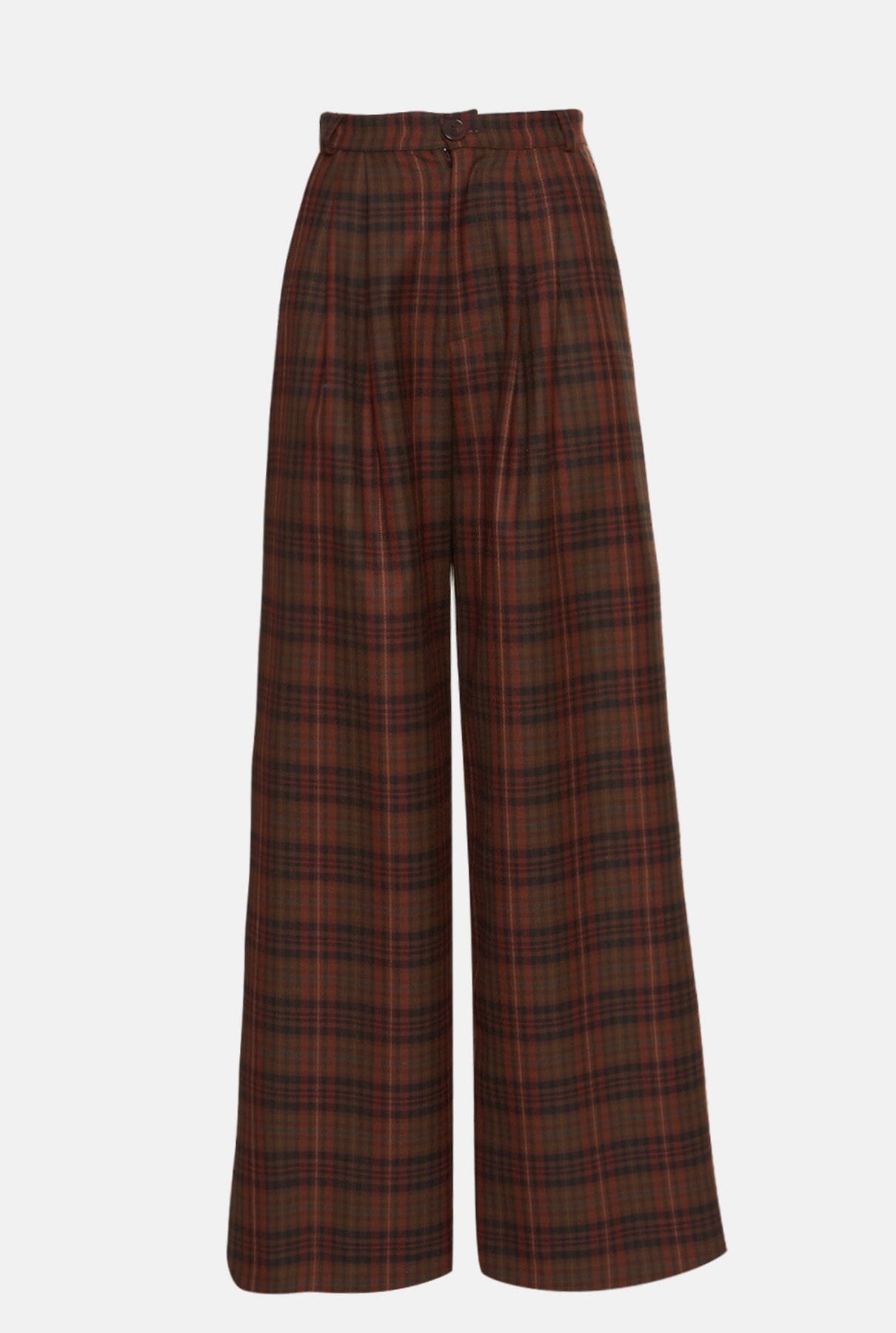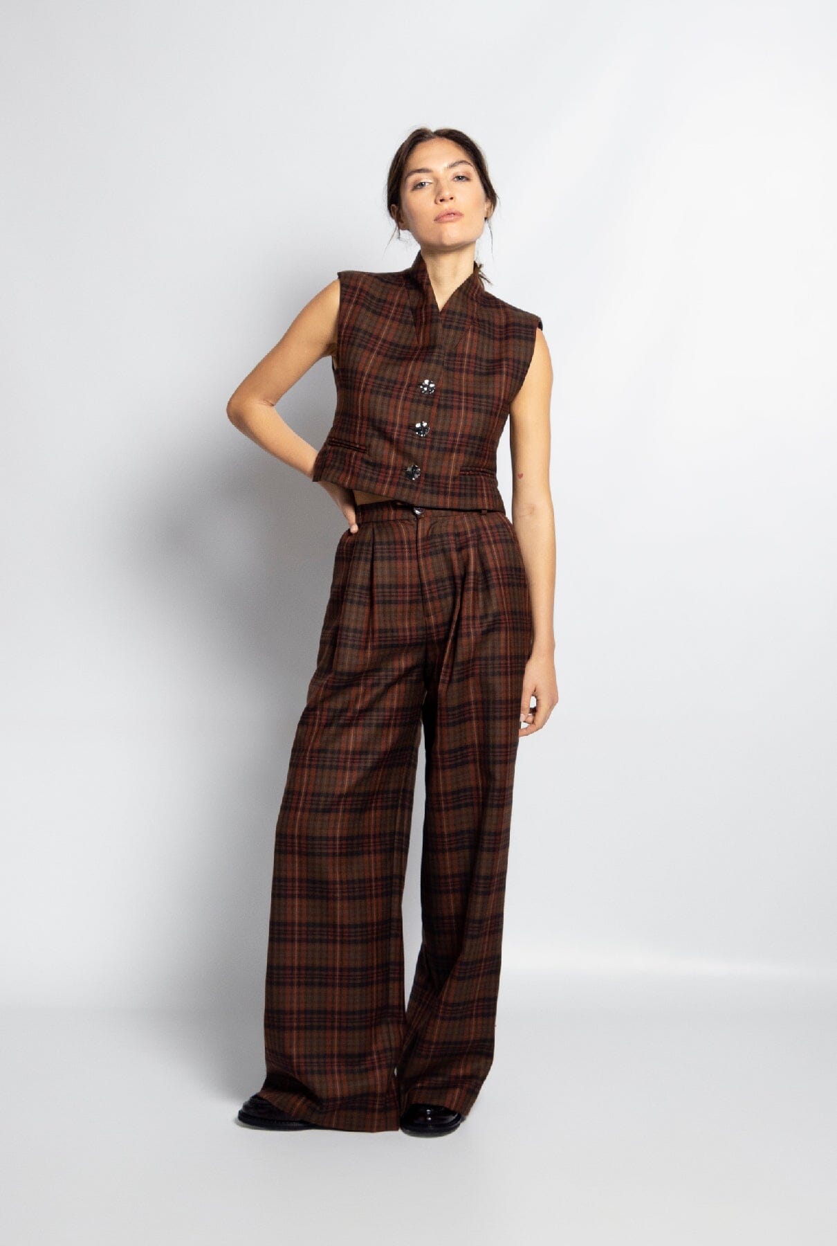 Pantalón de tiro alto y pernera ancha con dos pinzas. Está confeccionado en un tejido de cuadros 100% lana de una calidad excepcional que aporta al pantalón un tacto perfecto.