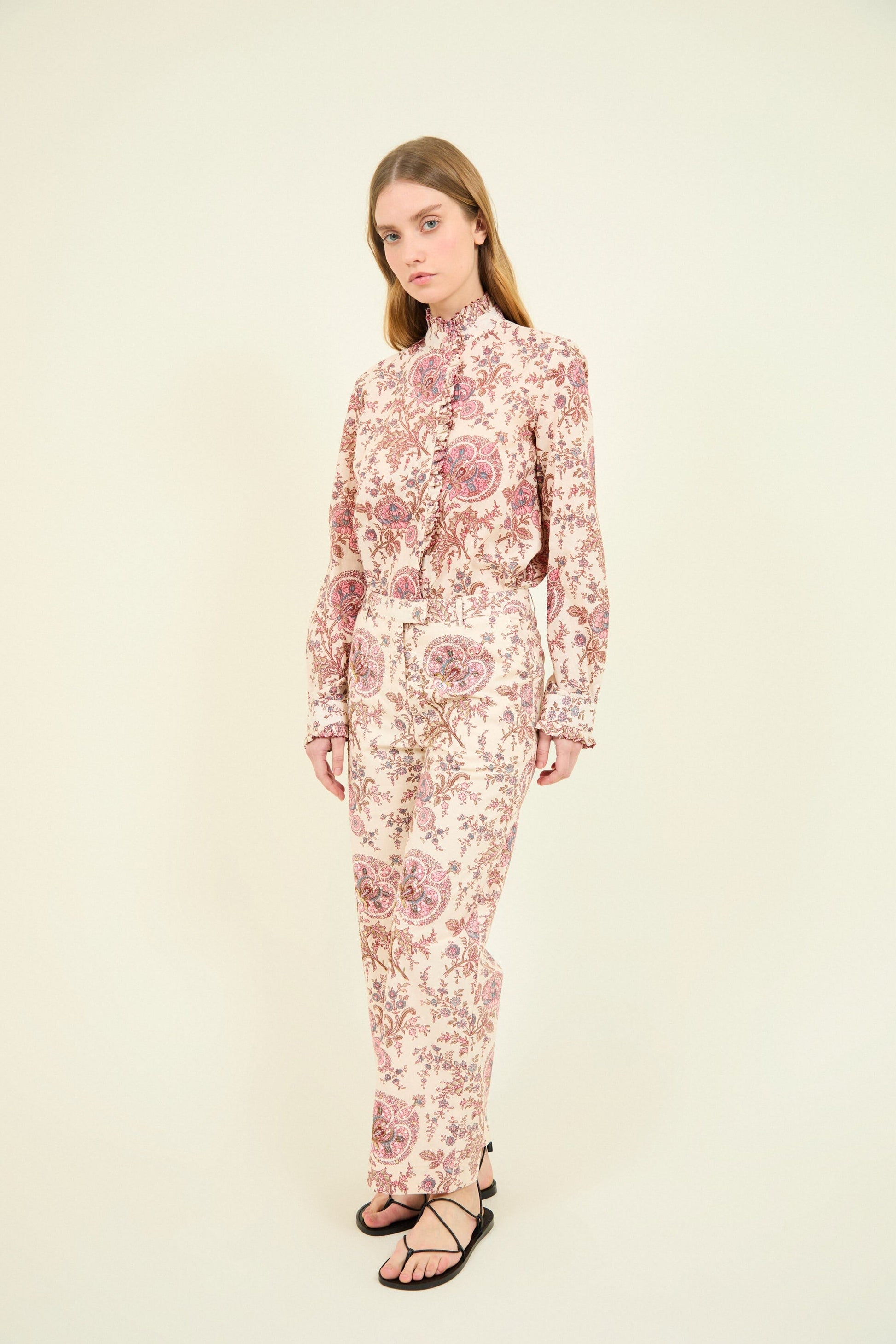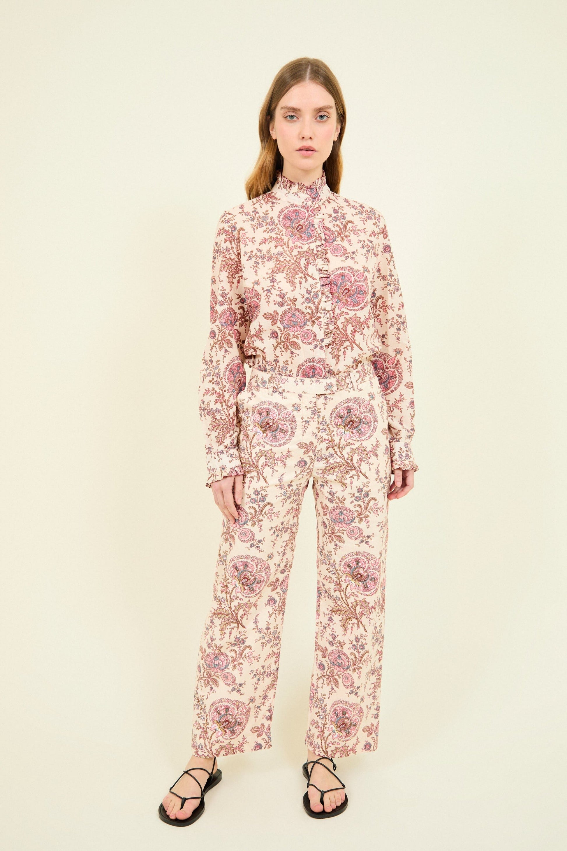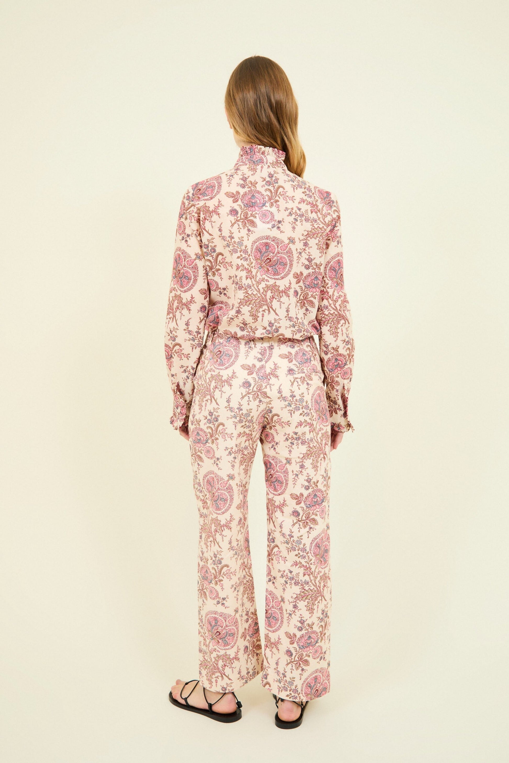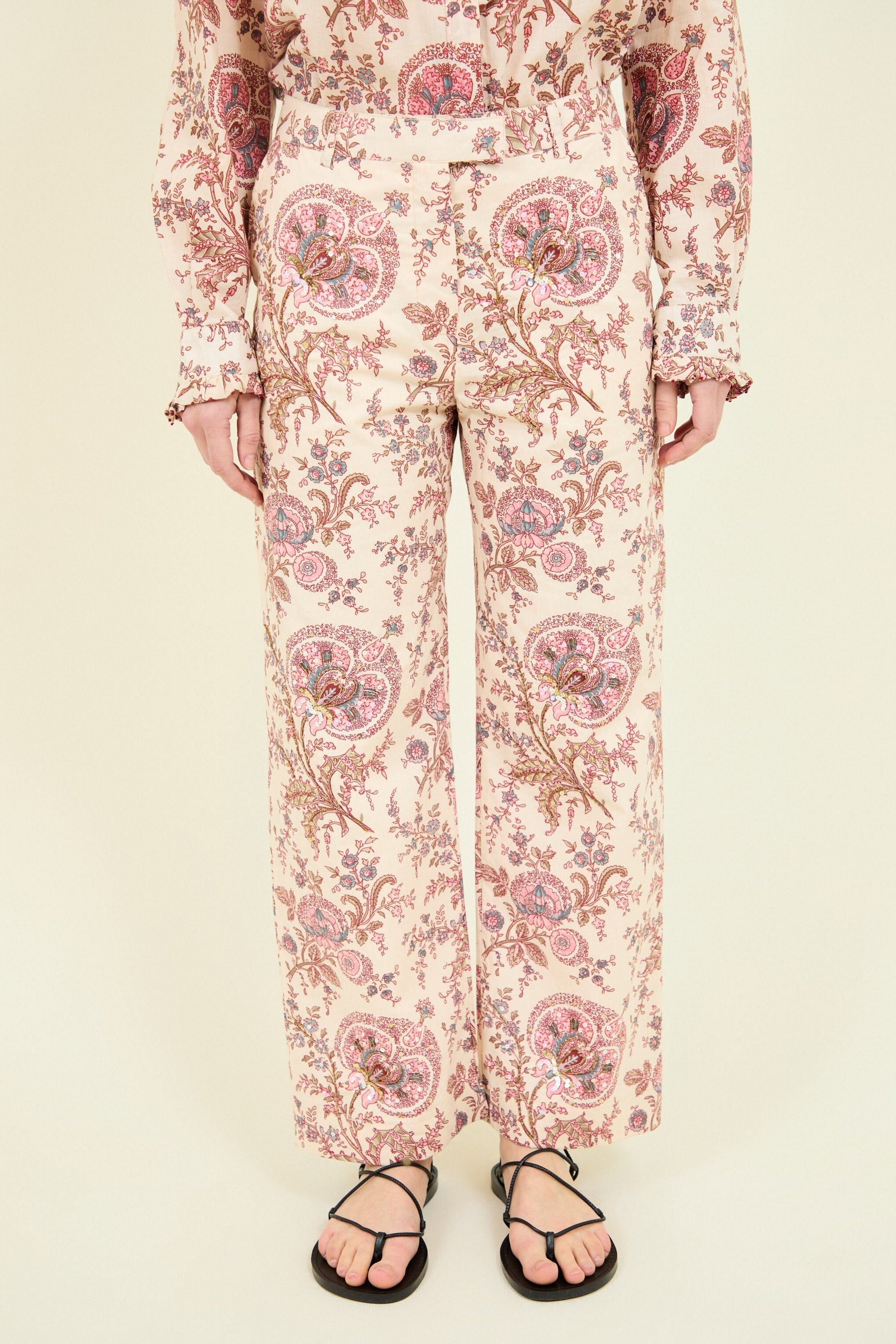 El pantalón Georgia es un diseño romántico y femenino, confeccionado en 100% algodón. Presenta un estampado floral en tonos rosas sobre fondo blanco, un corte amplio y recto (muy cómodo) y cierre frontal en la cintura;