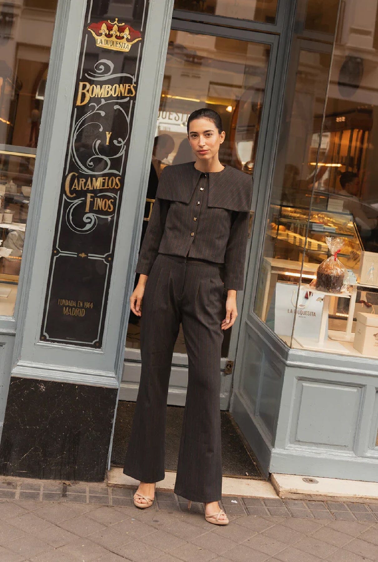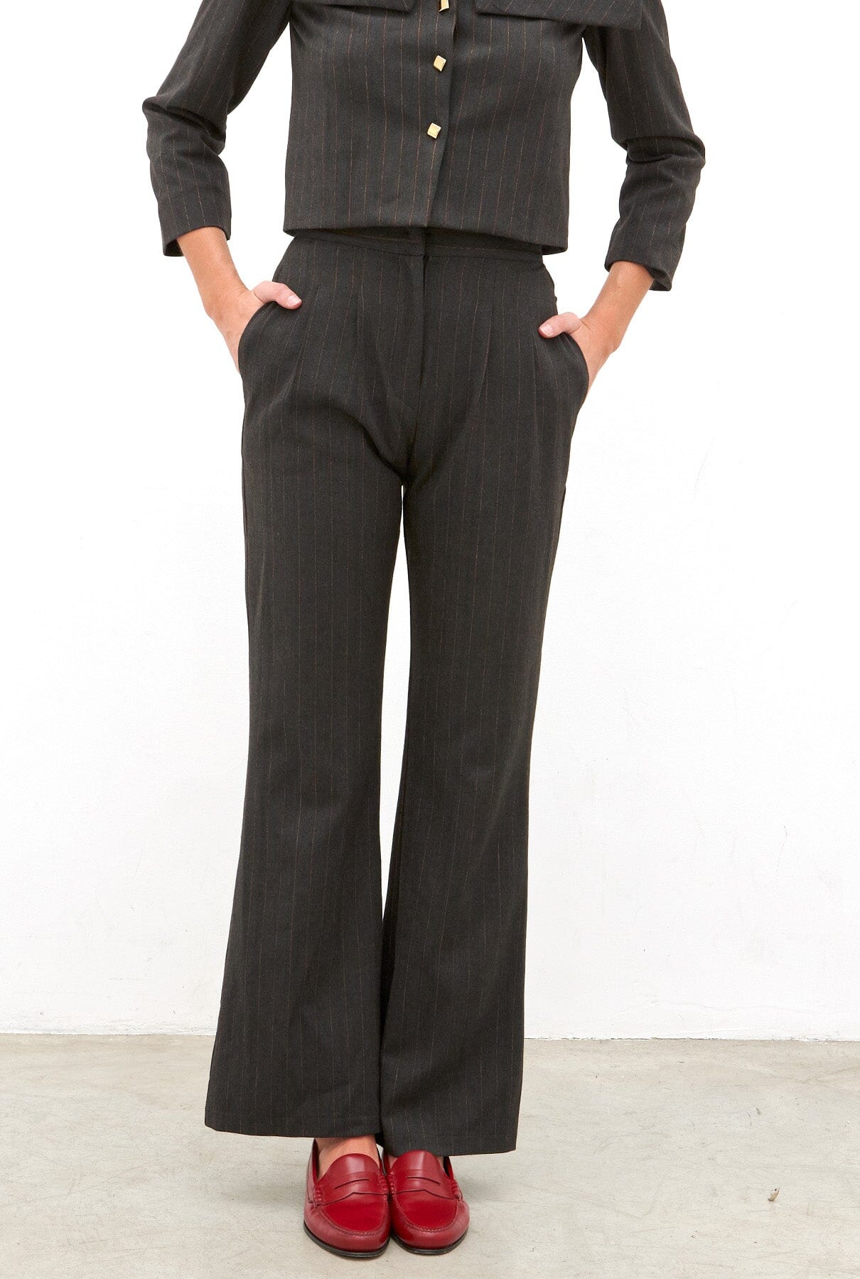Pantalón con pinzas, cierre frontal con botón interior y cremallera en tejido de rayas granate con fondo azul grisáceo oscuro. Bolsillos laterales en costura y detalle de bolsillo falso en la parte trasera.