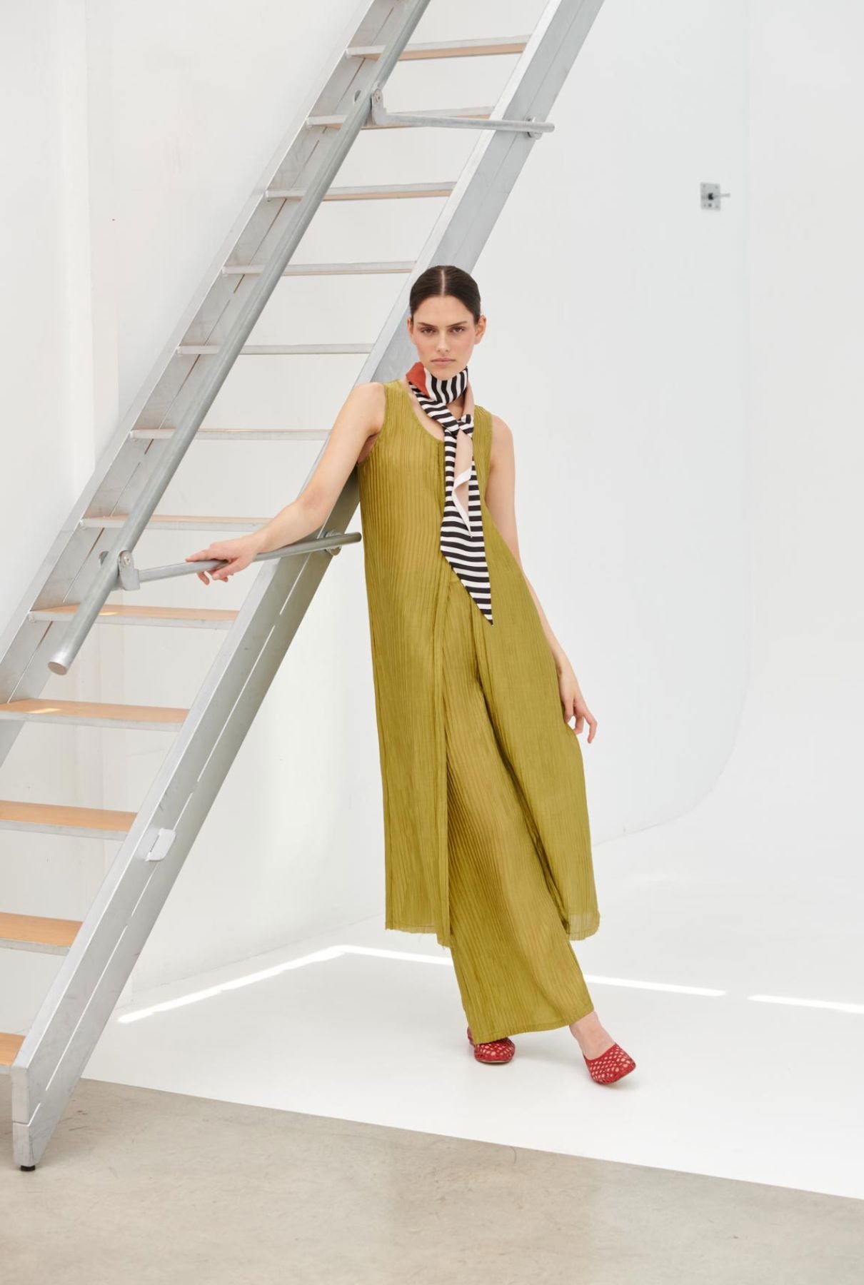 Pantalón largo y acampanado, con bolsillos laterales y cinturilla elástica.