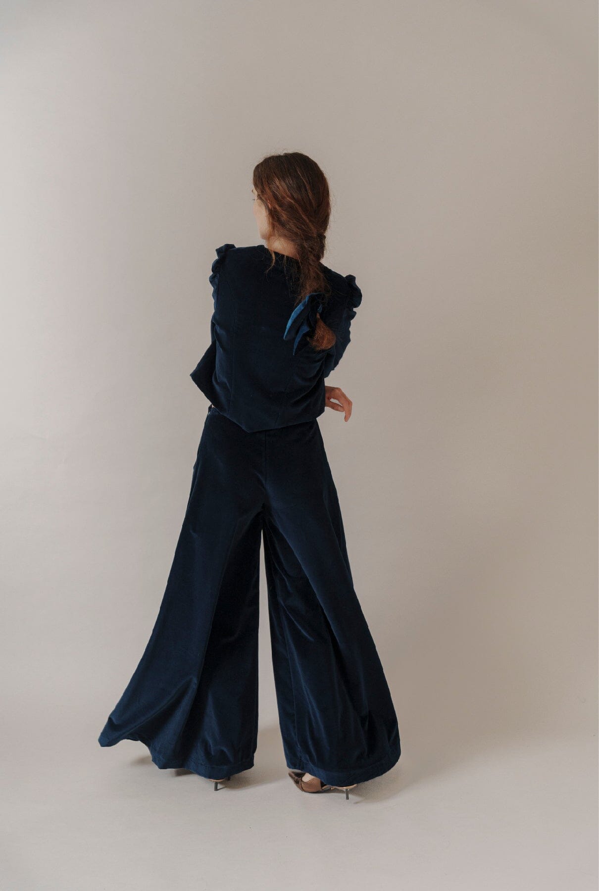 Pantalón ancho de terciopelo, talle medio y cierre con cremallera invisible lateral.