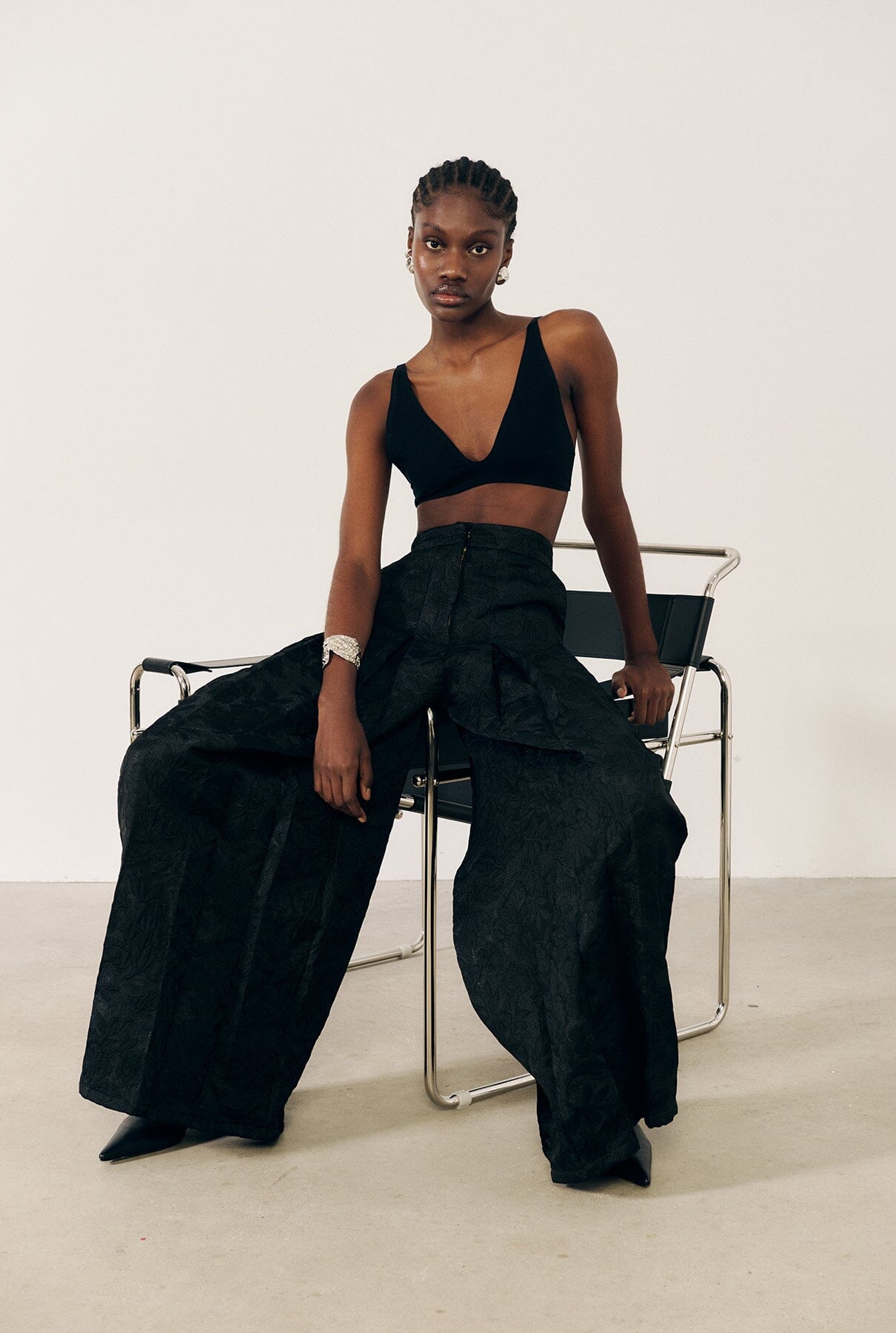 Flower brocade maxi pleated pants.