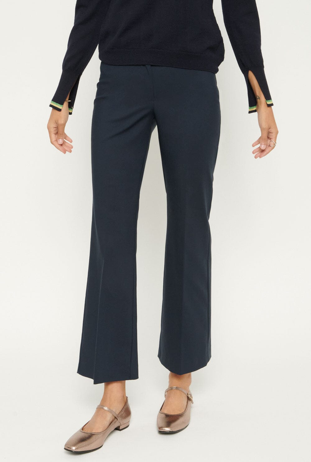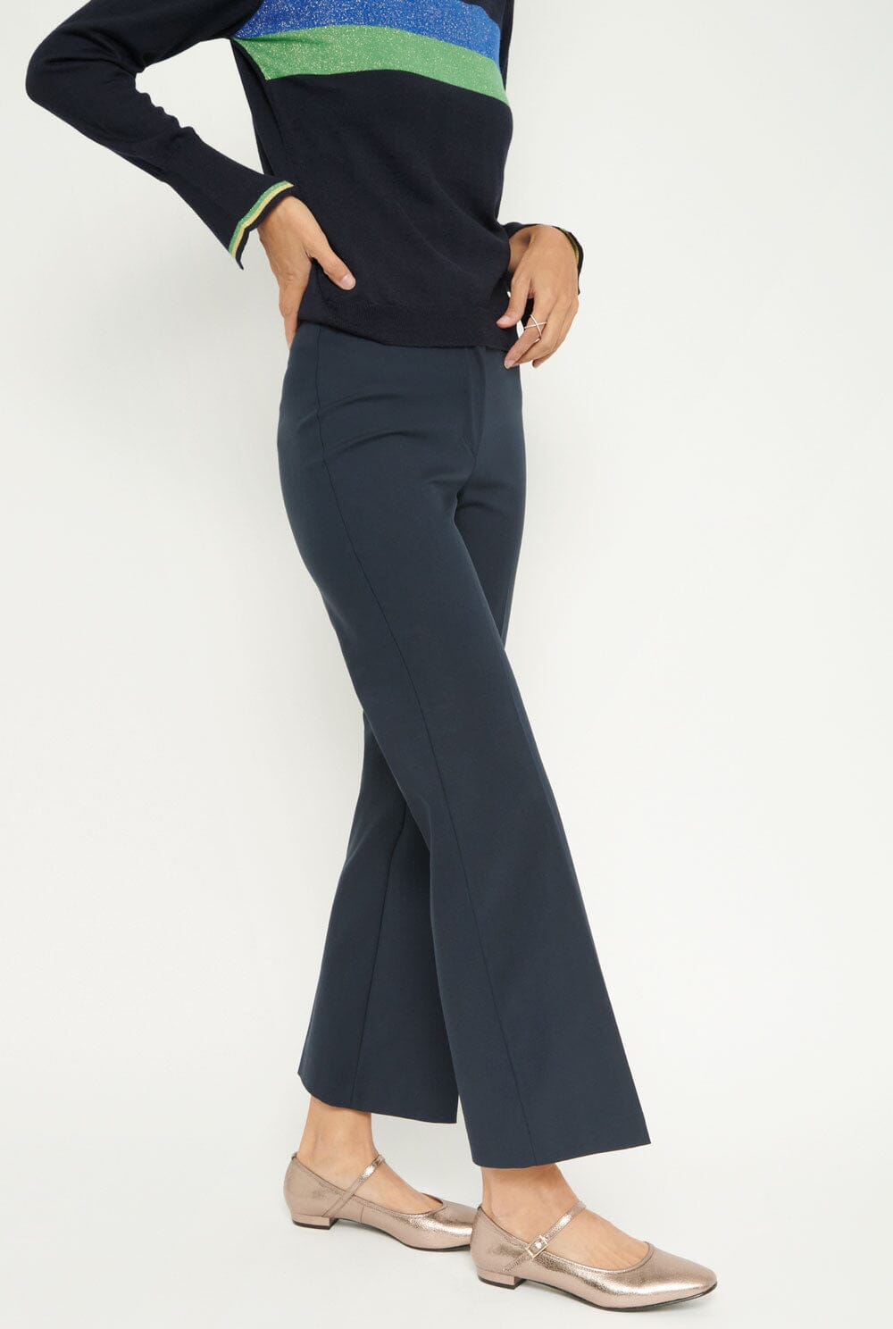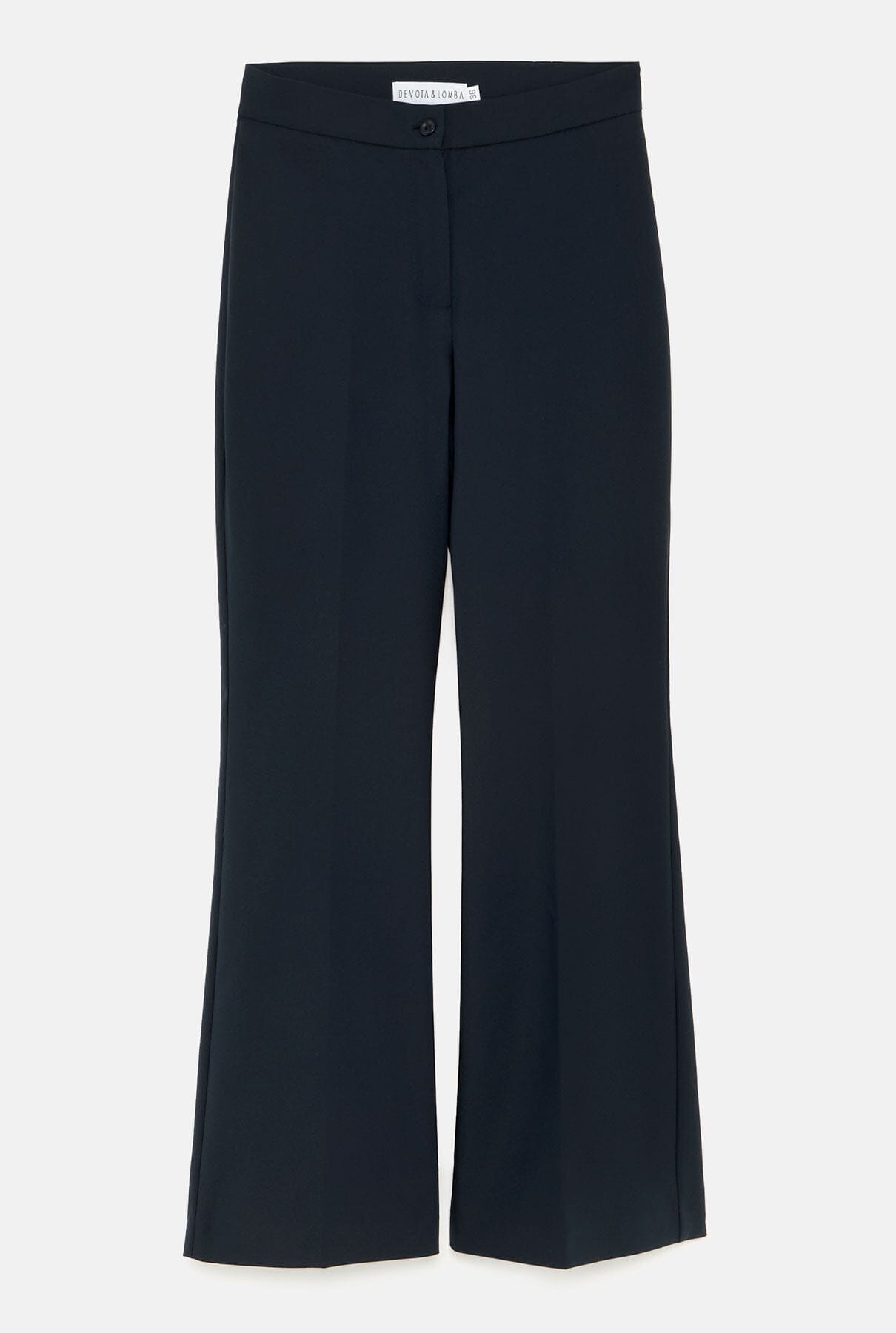 Pantalón línea trompeta, confeccionado en algodón elastano. Cierre de cremallera y botón en la parte delantera. Diseñado por Devota & Lomba.