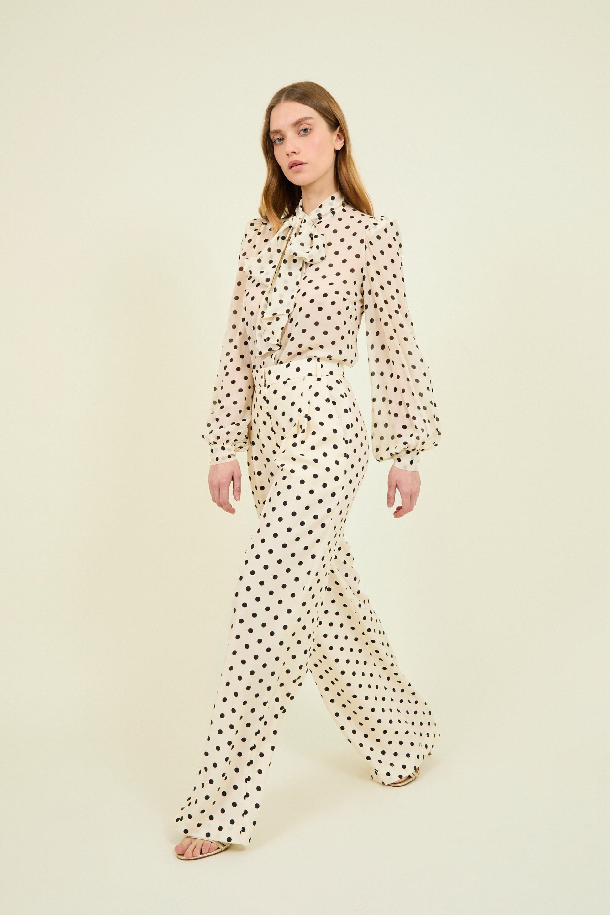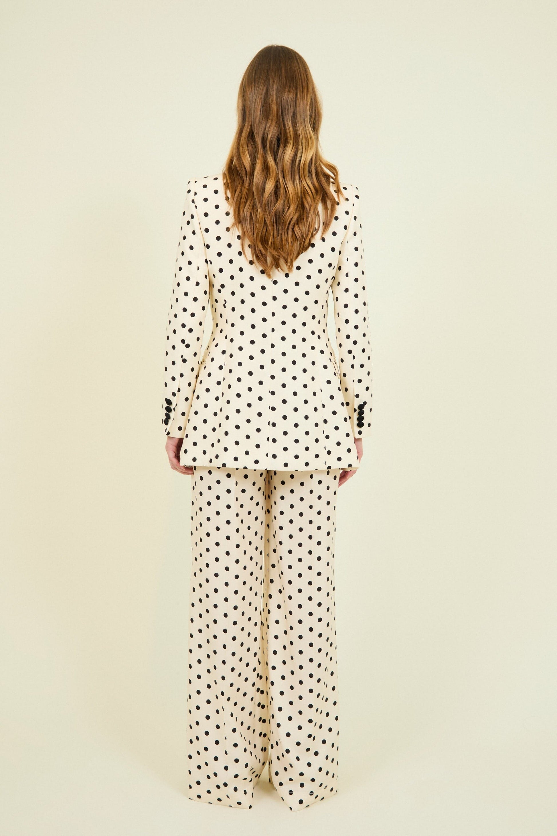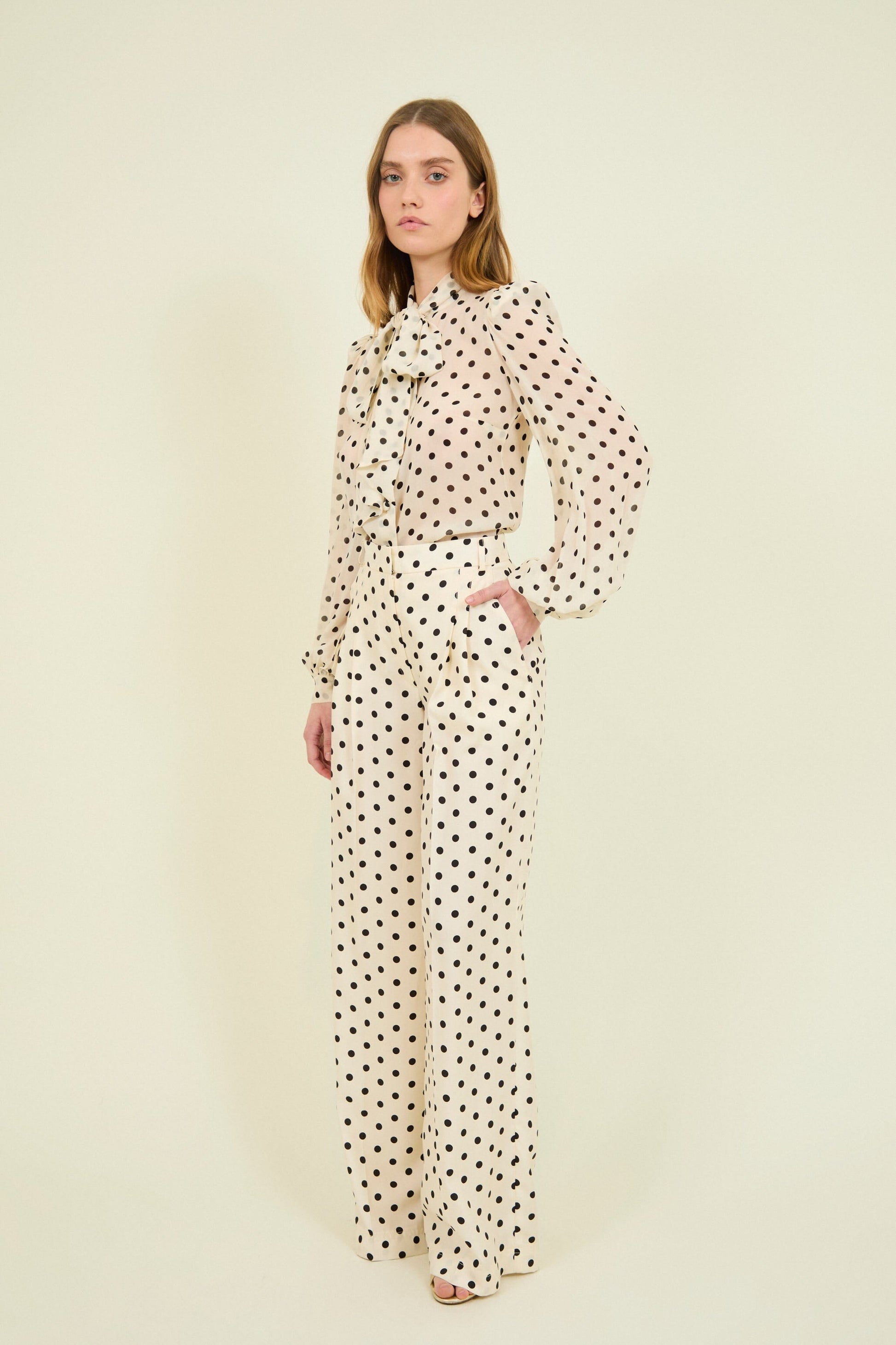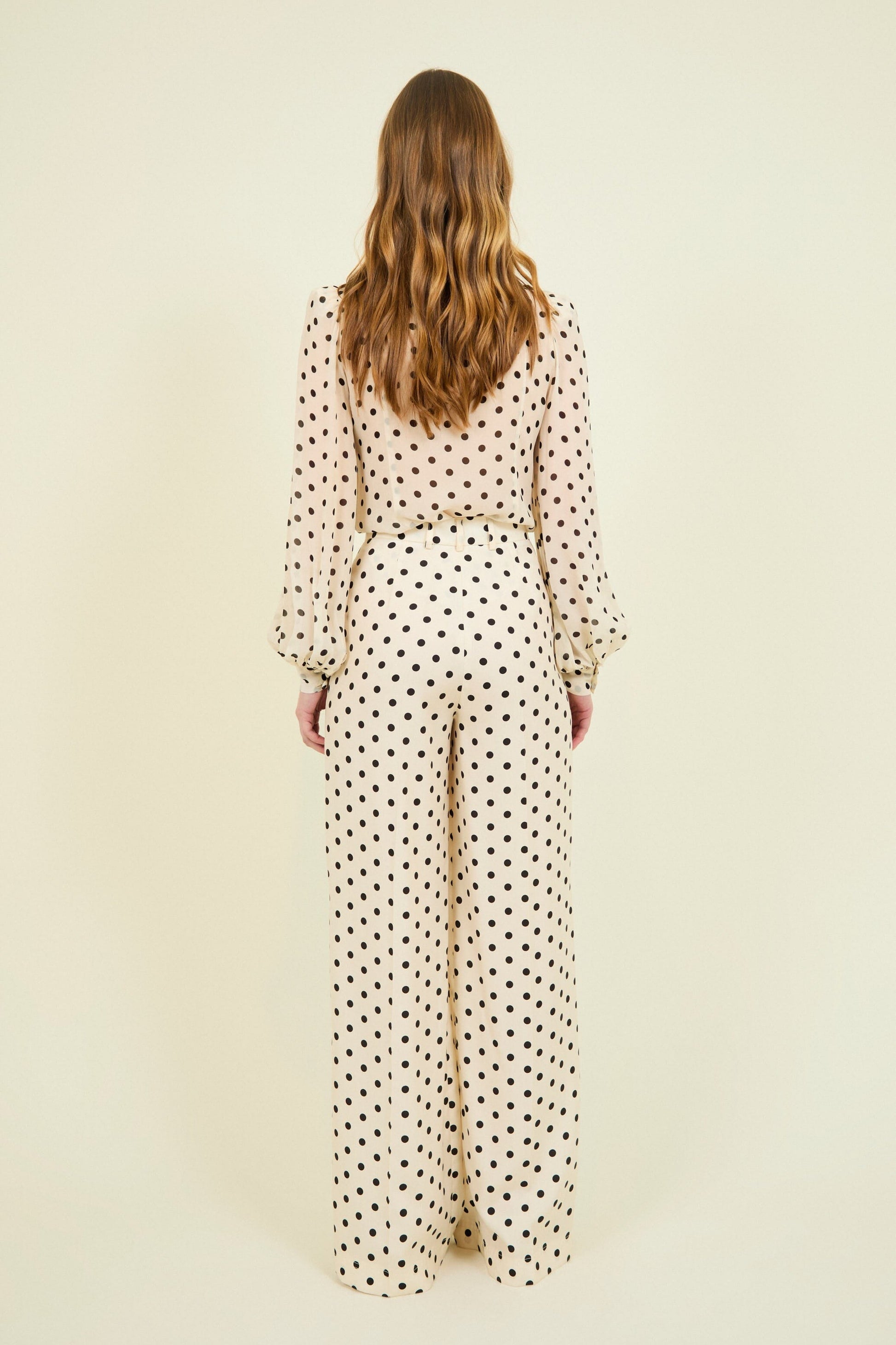 El pantalón Mila para mujer en color blanco es un diseño de estilo palazzo con un elegante estampado de lunares en color negro. Cuenta con un tiro alto muy favorecedor, dos bolsillos laterales y un cierre frontal.