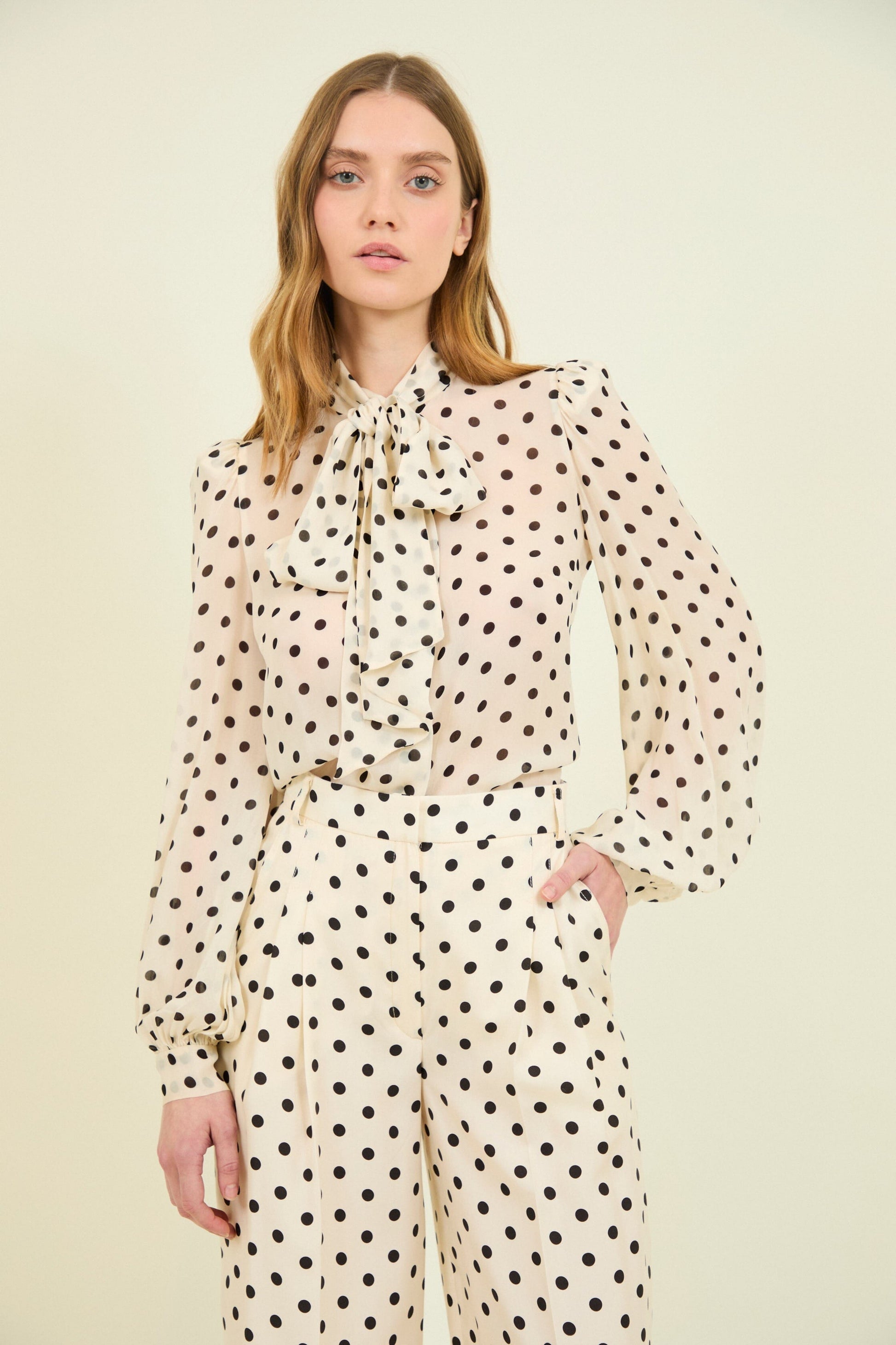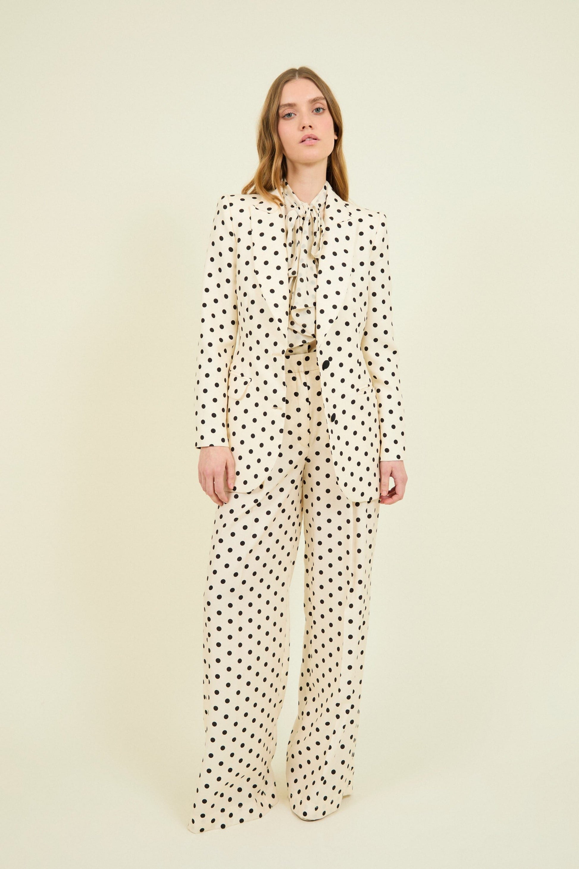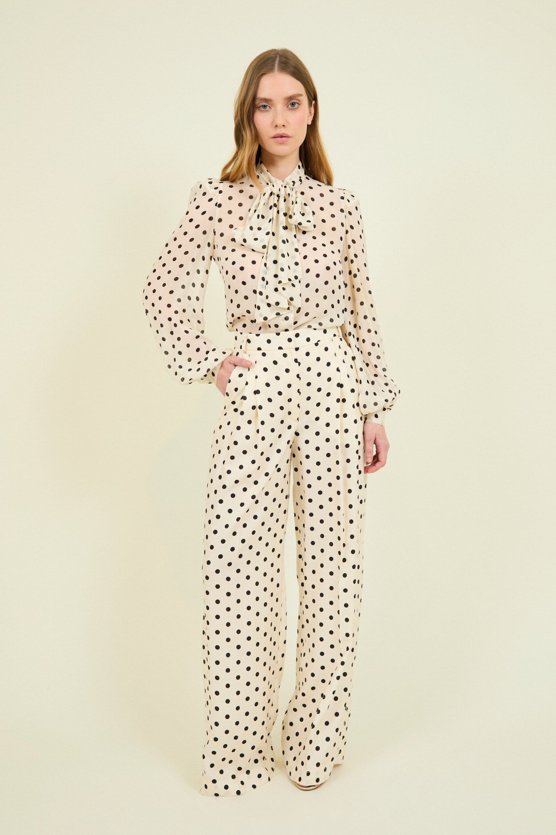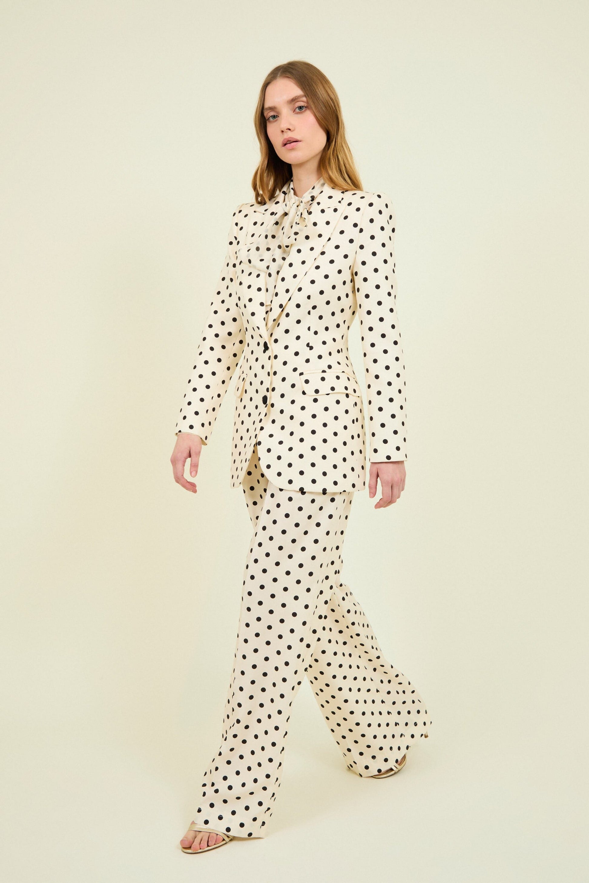 El pantalón Mila para mujer en color blanco es un diseño de estilo palazzo con un elegante estampado de lunares en color negro. Cuenta con un tiro alto muy favorecedor, dos bolsillos laterales y un cierre frontal.