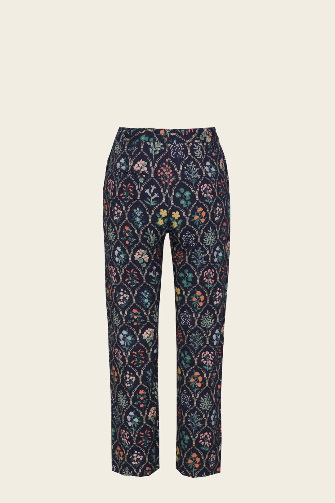 Los pantalones Niza, confeccionados 100 % algodón, destacan por su vibrante estampado floral que combina una paleta de colores rica y sofisticada. Con corte recto y cintura media, ofrecen comodidad sin renunciar al estilo.