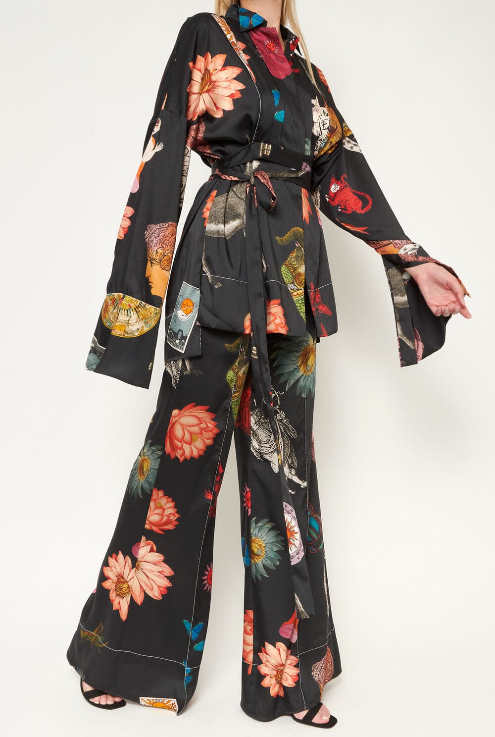 Camisa fluida de manga ancha, abertura frontal y cuello cerrado vuelto a la derecha. Diseñado por Juan Vidal.