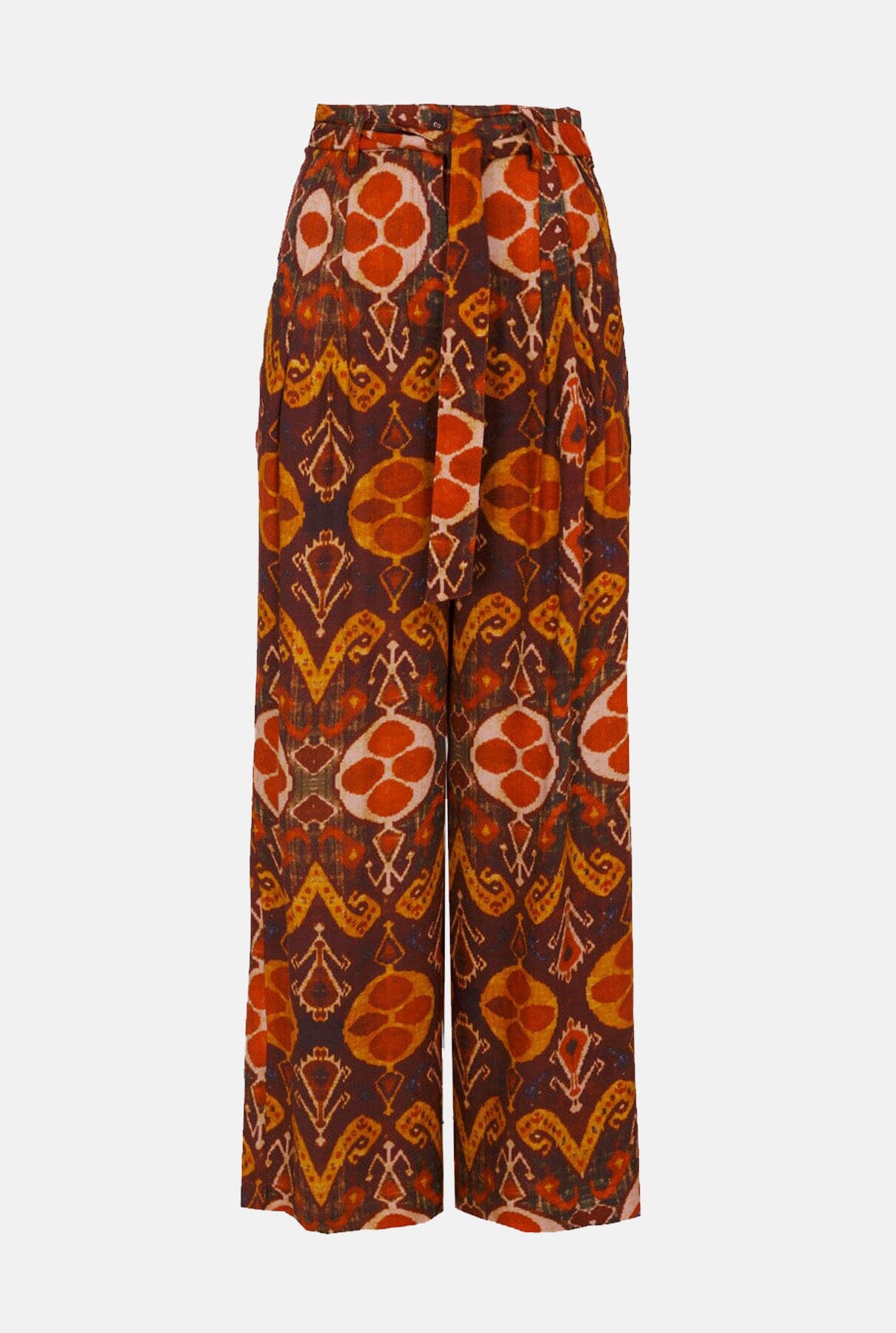 Este pantalón plisado presenta un vibrante estampado ikat que destaca sobre un fondo naranja y rojo, creando un efecto visual cautivador. El corte elegante y estructurado aporta un toque sofisticado, ideal para cualquier ocasión. Perfecto para quienes quieran añadir un toque de color y originalidad a su vestuario.