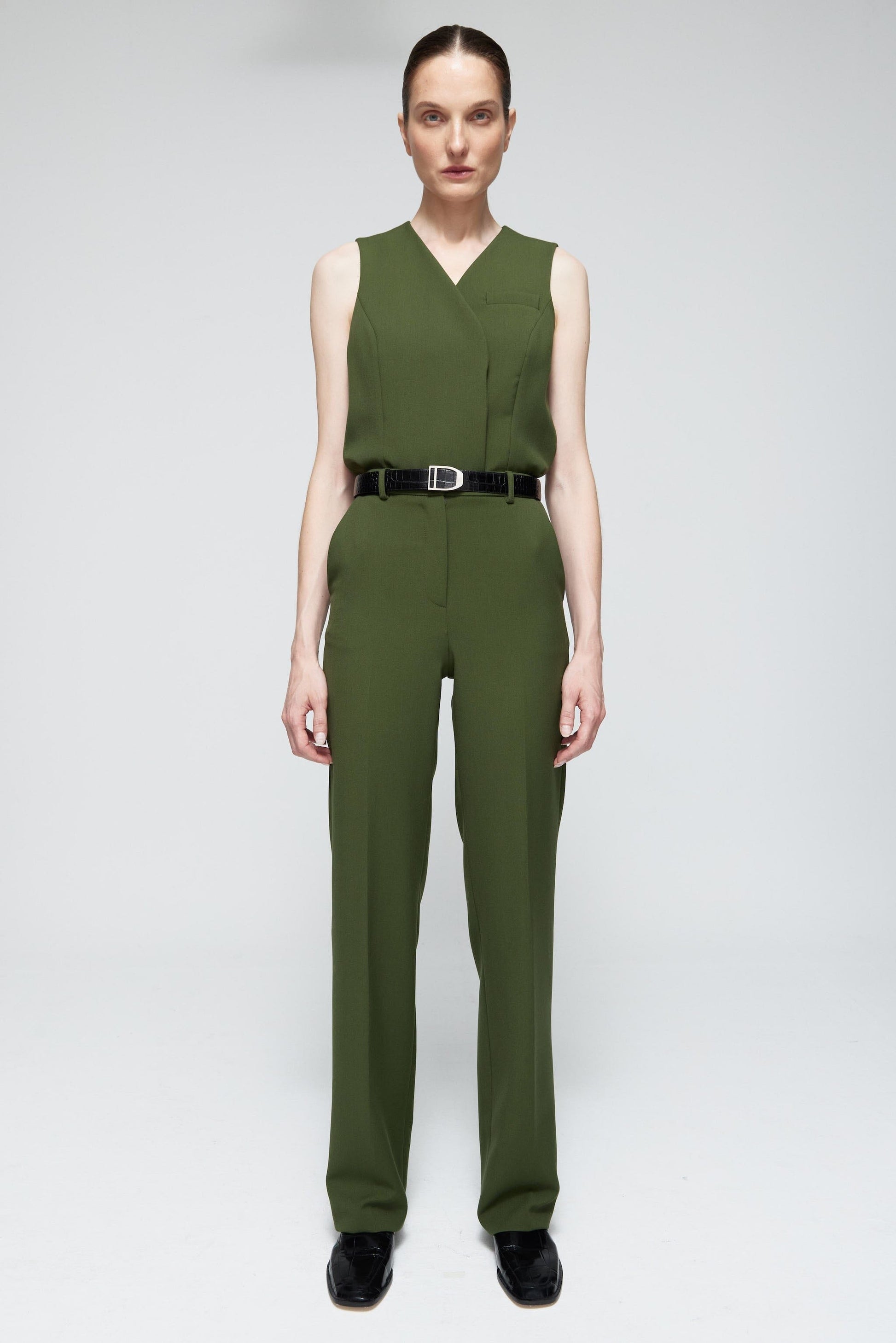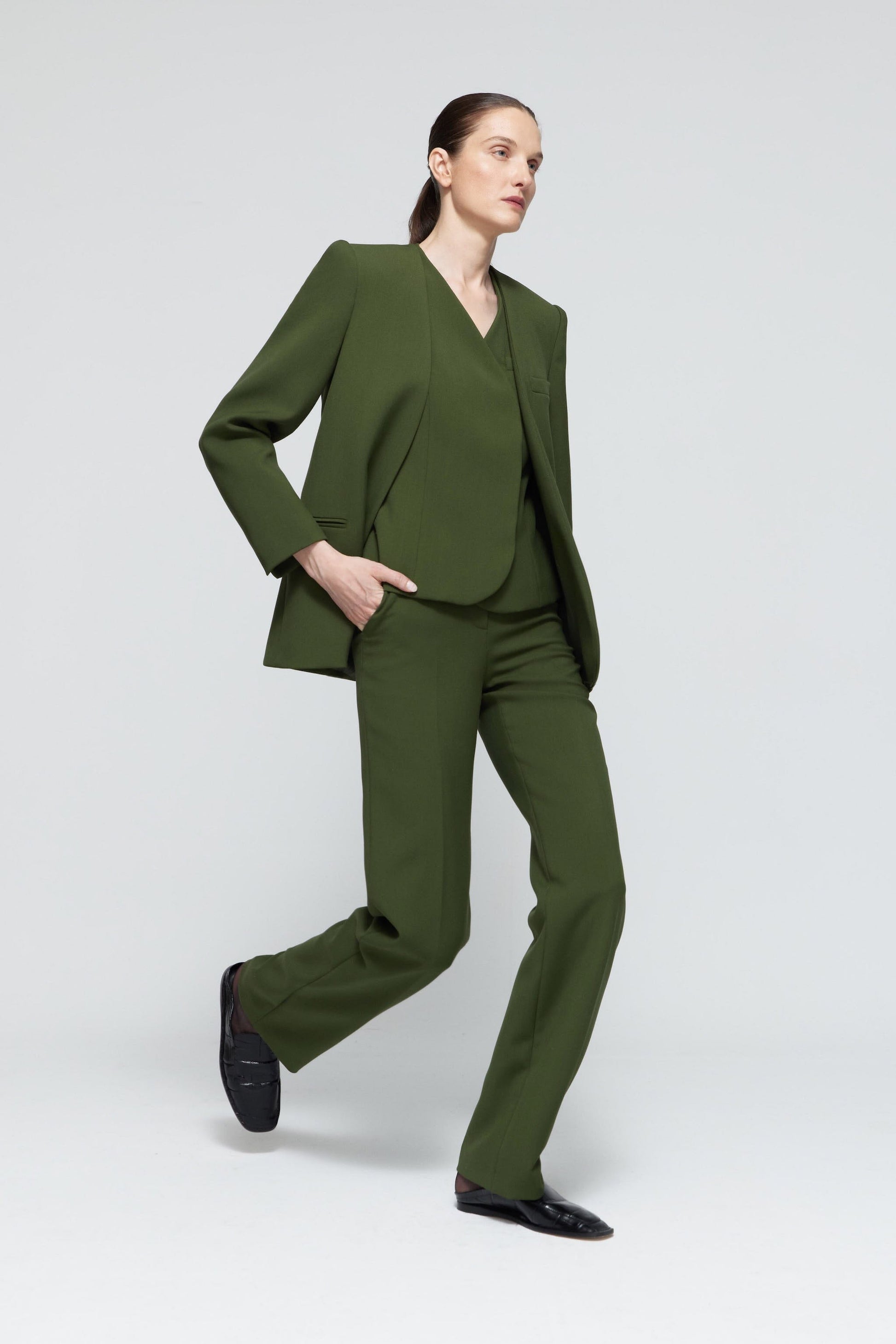 Pantalón sastre en lana verde. Su color y cuidado diseño dan lugar a un estilo depurado y lleno de personalidad.
