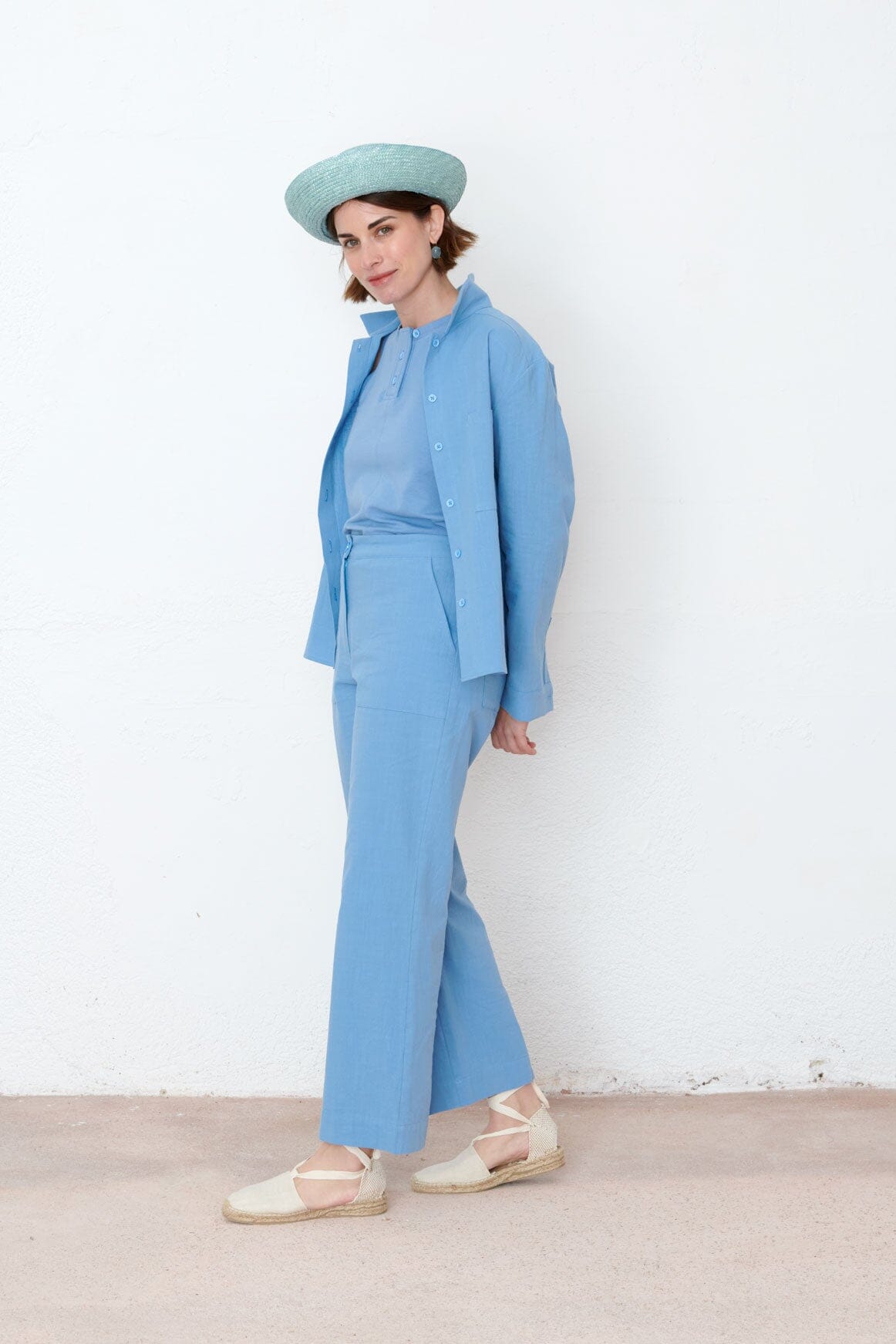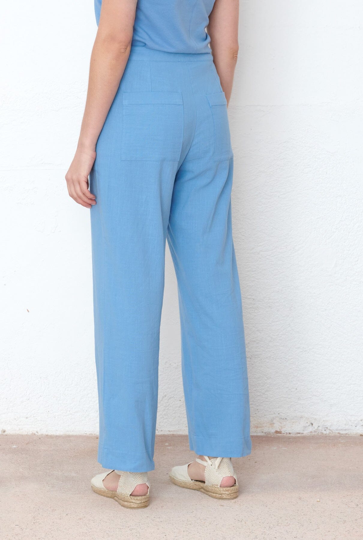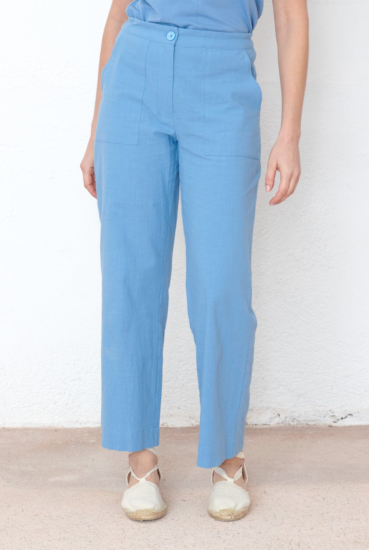 Pantalón recto con cinturilla y cordón interior ajustable. Dos bolsillos delanteros y dos traseros. Cintura alta. Tejido de algodón, ideal para el verano.