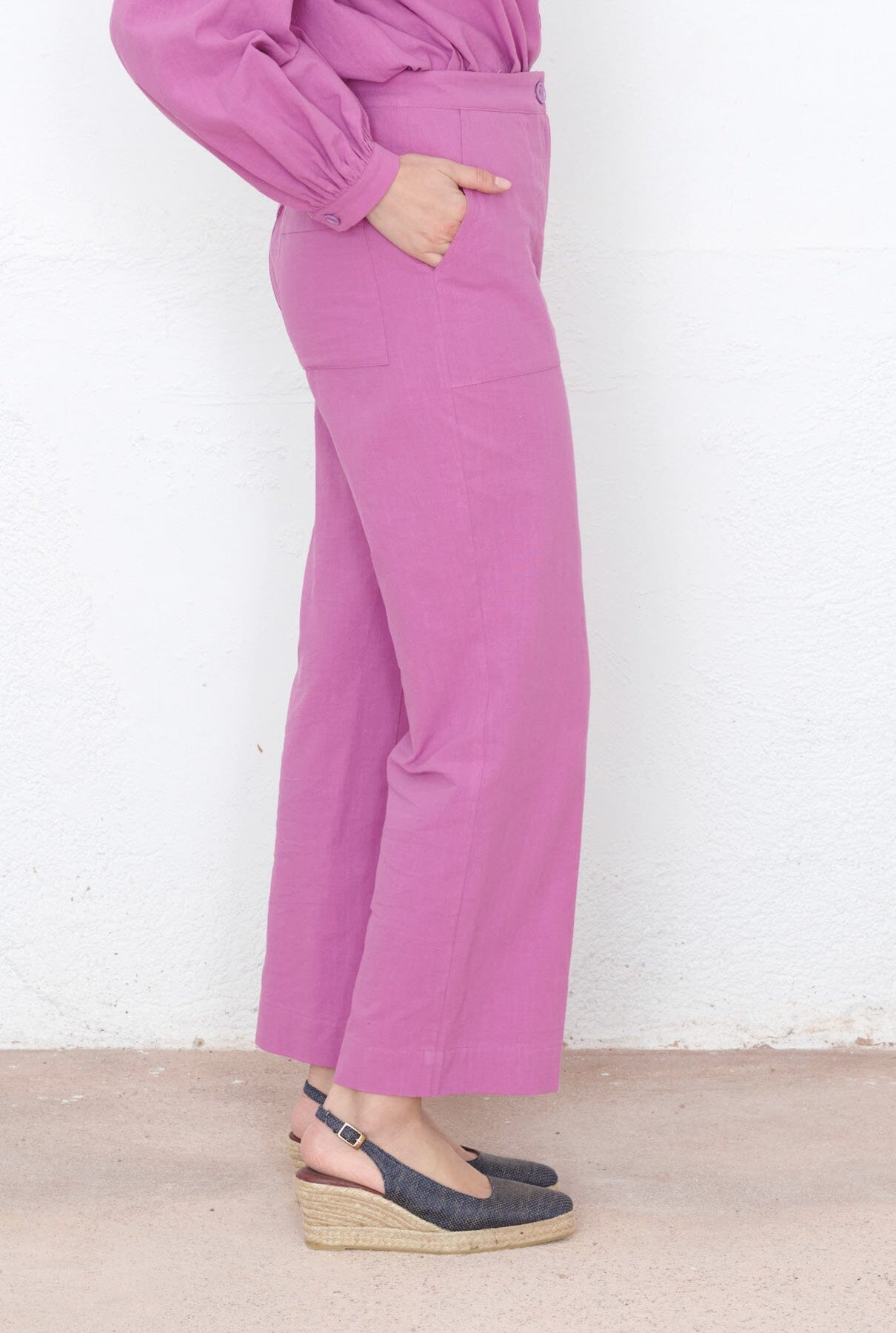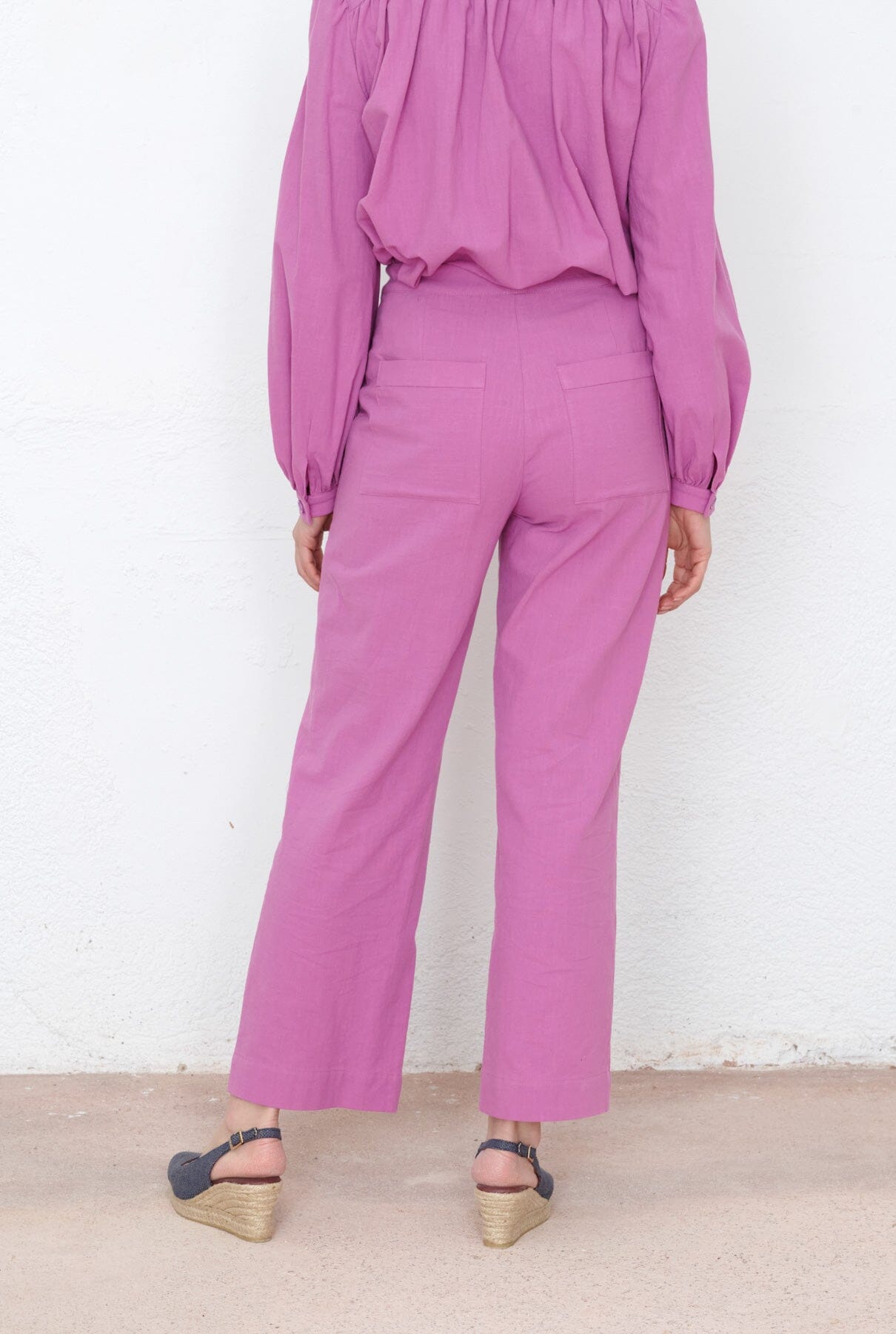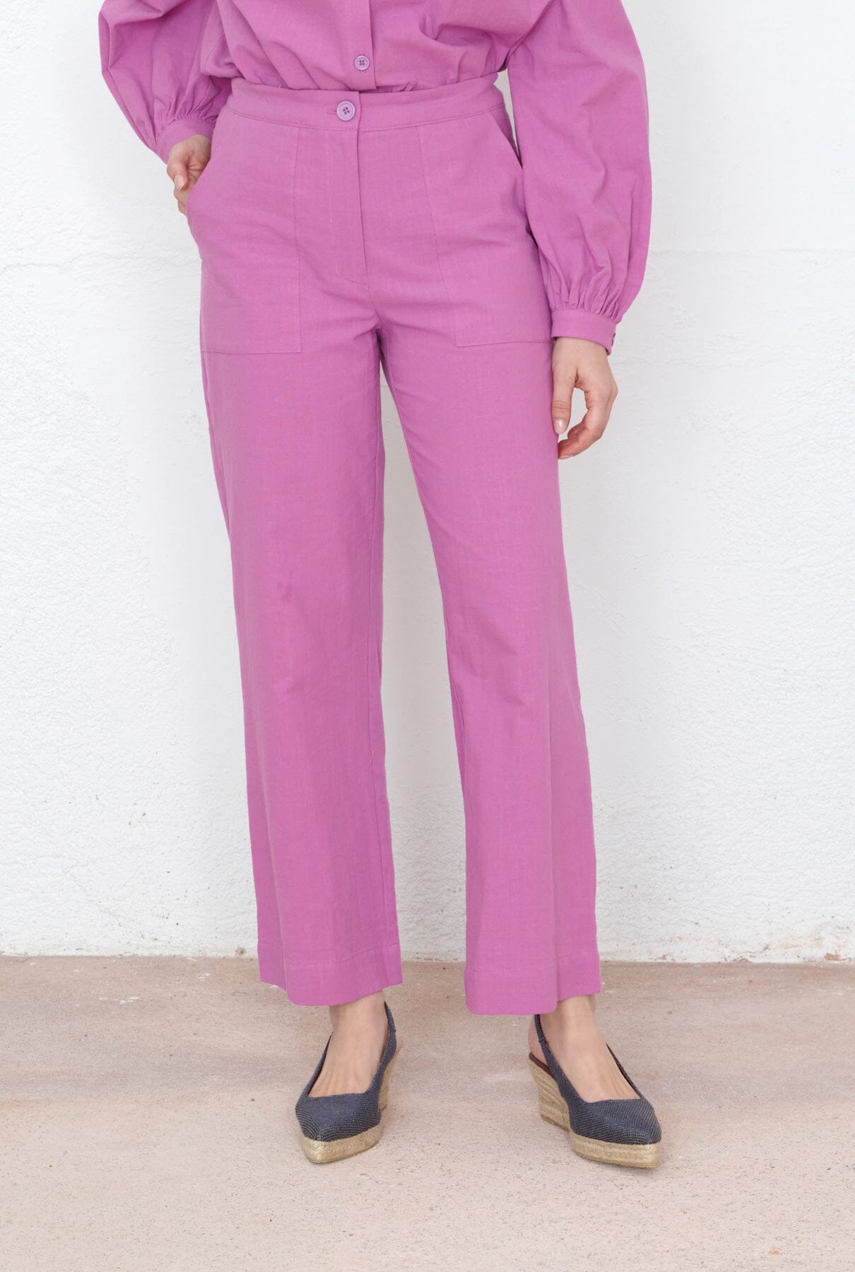 Pantalón recto con cinturilla y cordón interior ajustable. Dos bolsillos delanteros y dos traseros. Cintura alta. Tejido de algodón, ideal para el verano.