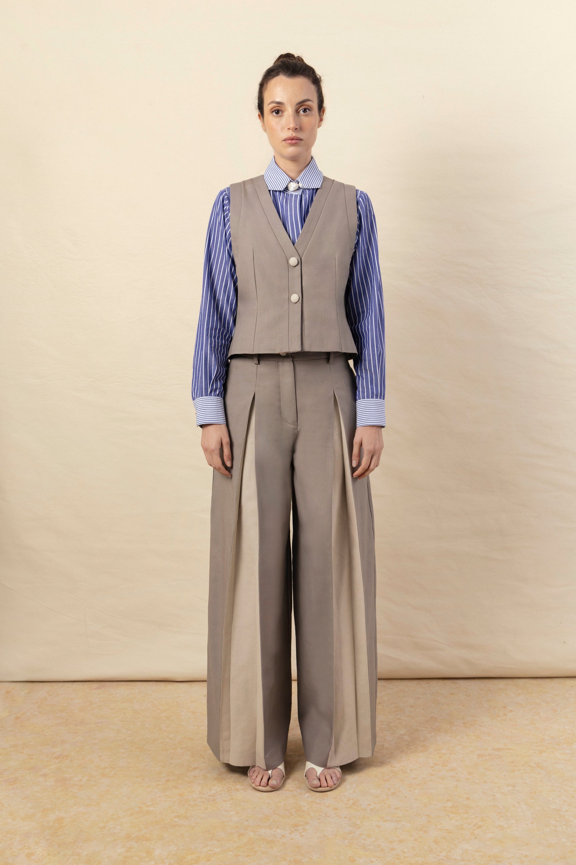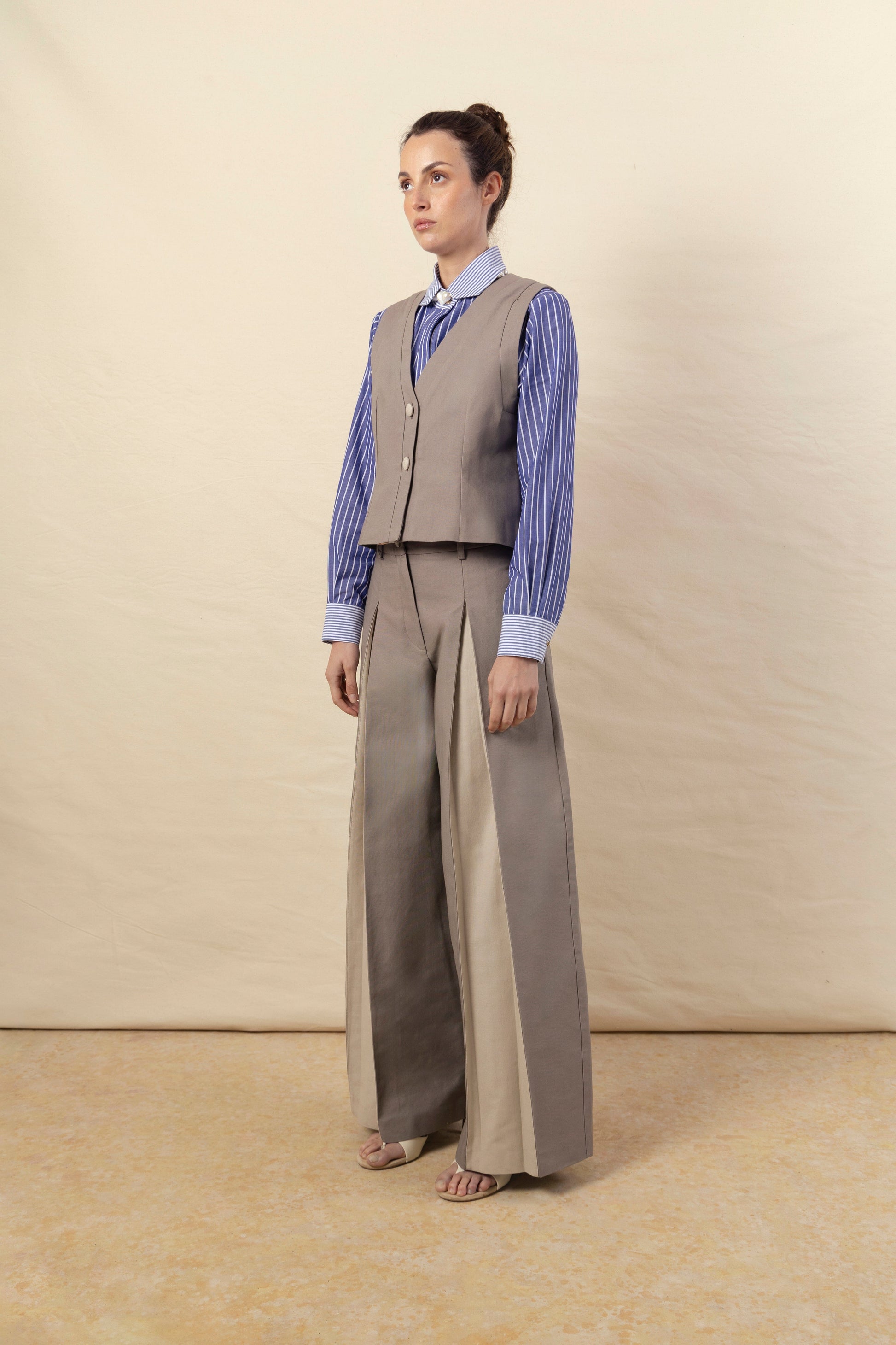 Pantalón palazzo de tiro alto en lona de algodón. Presenta un panel frontal con fondo beige en contraste que crea profundidad y movimiento. Incluye bolsillos laterales.