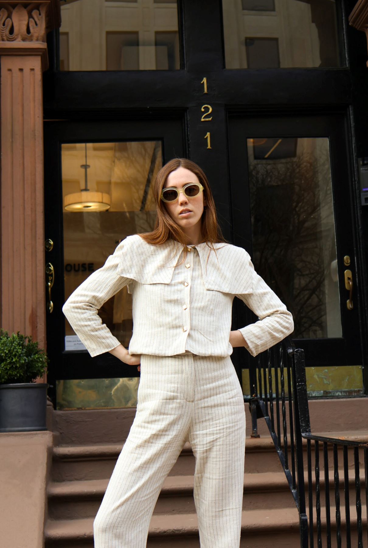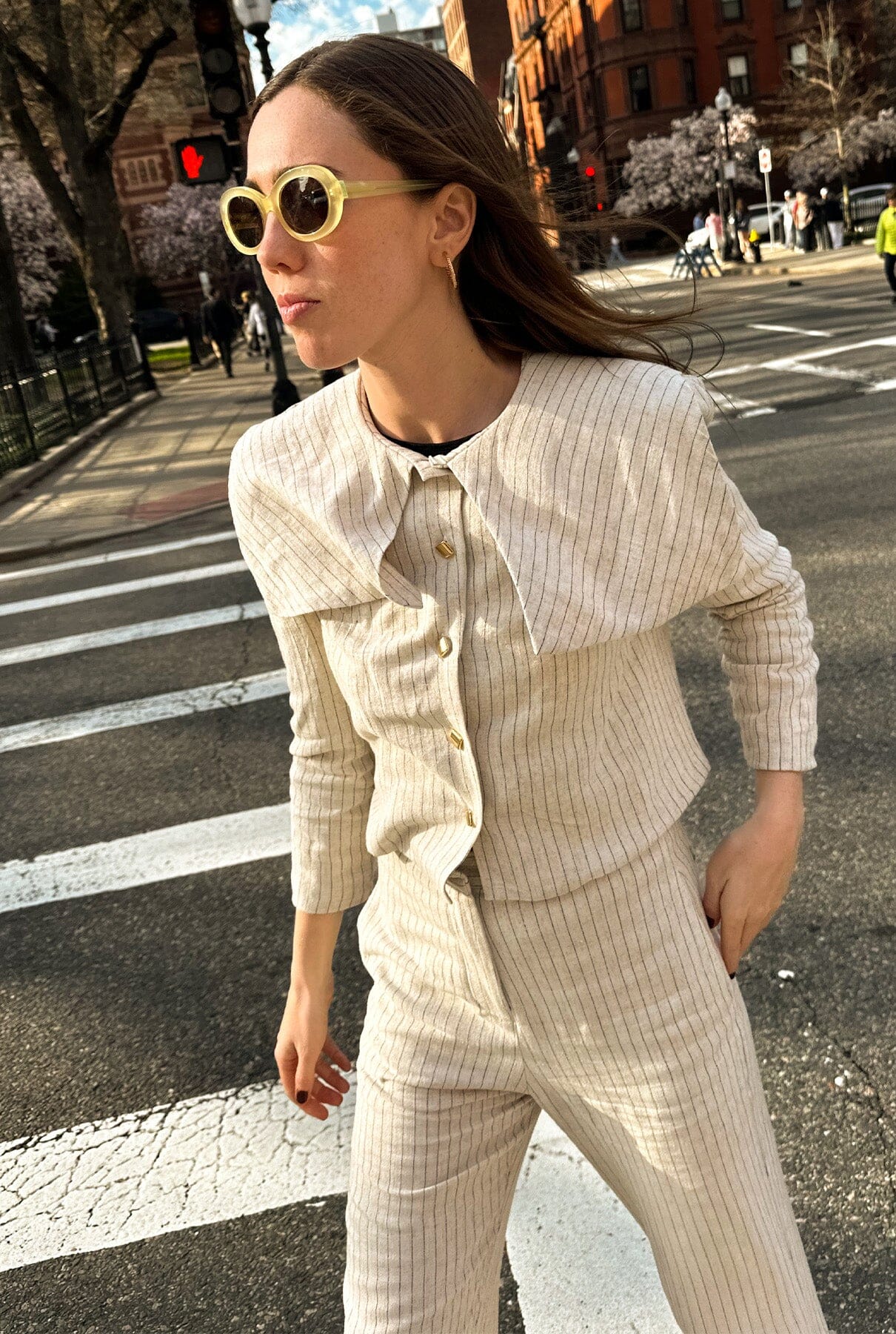 Pantalón con pinzas, cierre frontal con botón interno y cremallera en tejido de rayas finas en color azul marino con fondo beige. Bolsillos laterales en costura y detalle de bolsillo falso en espalda.