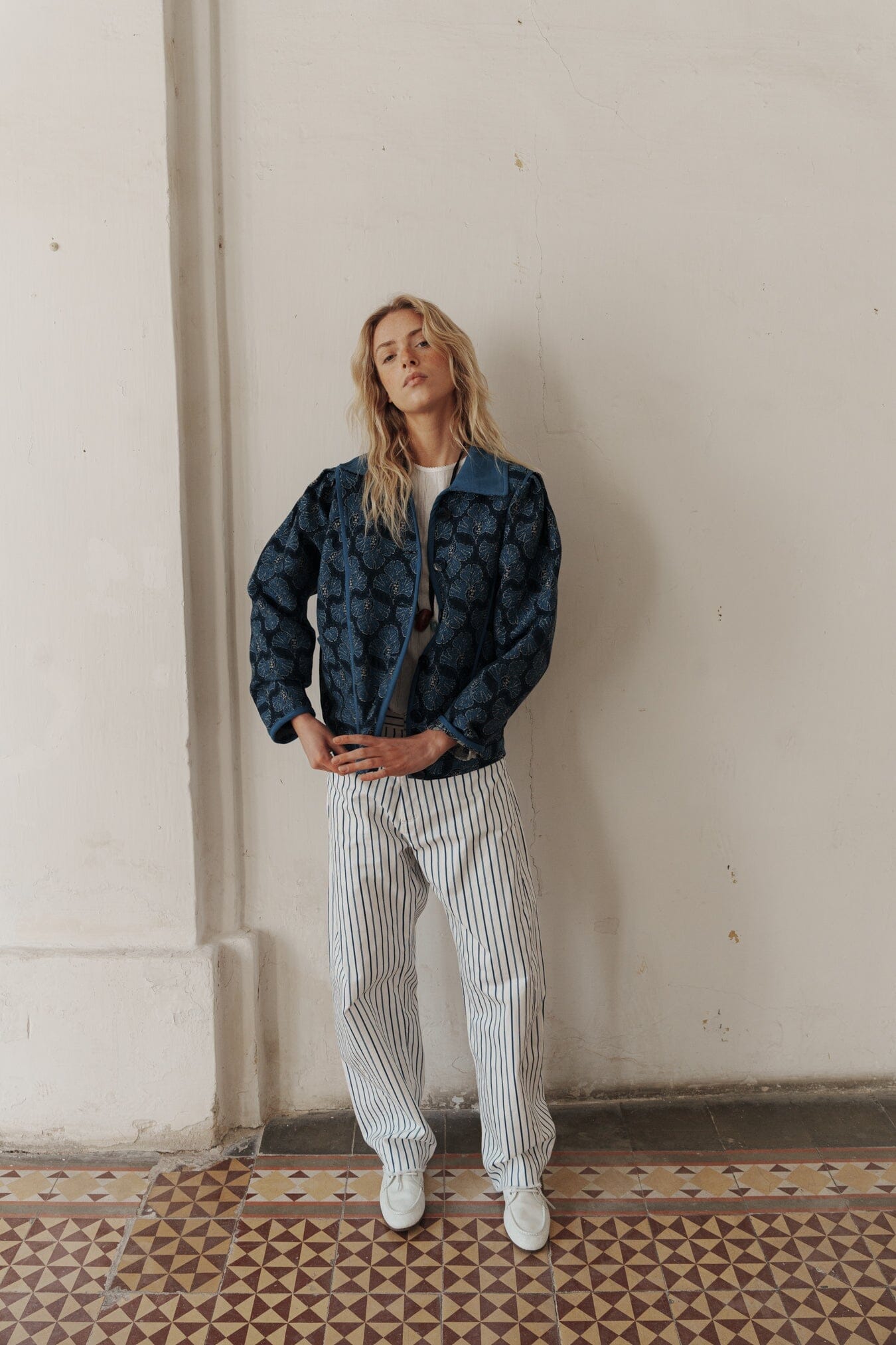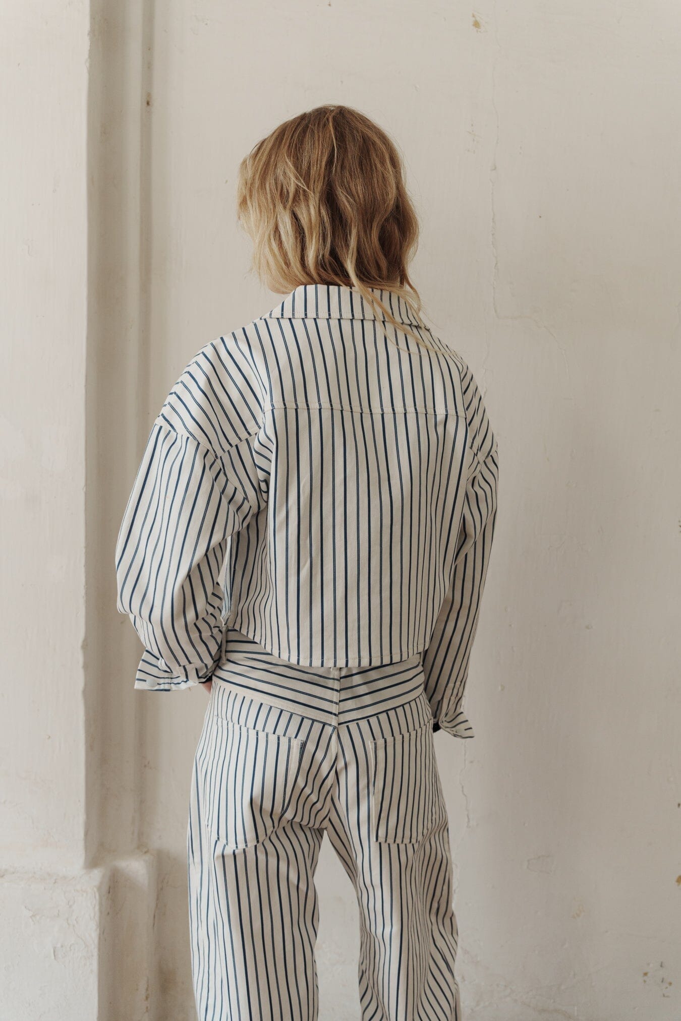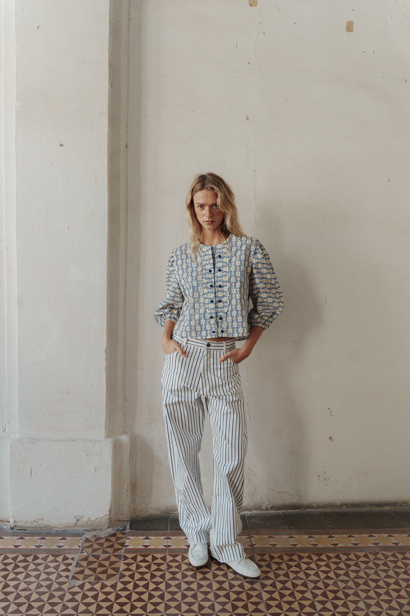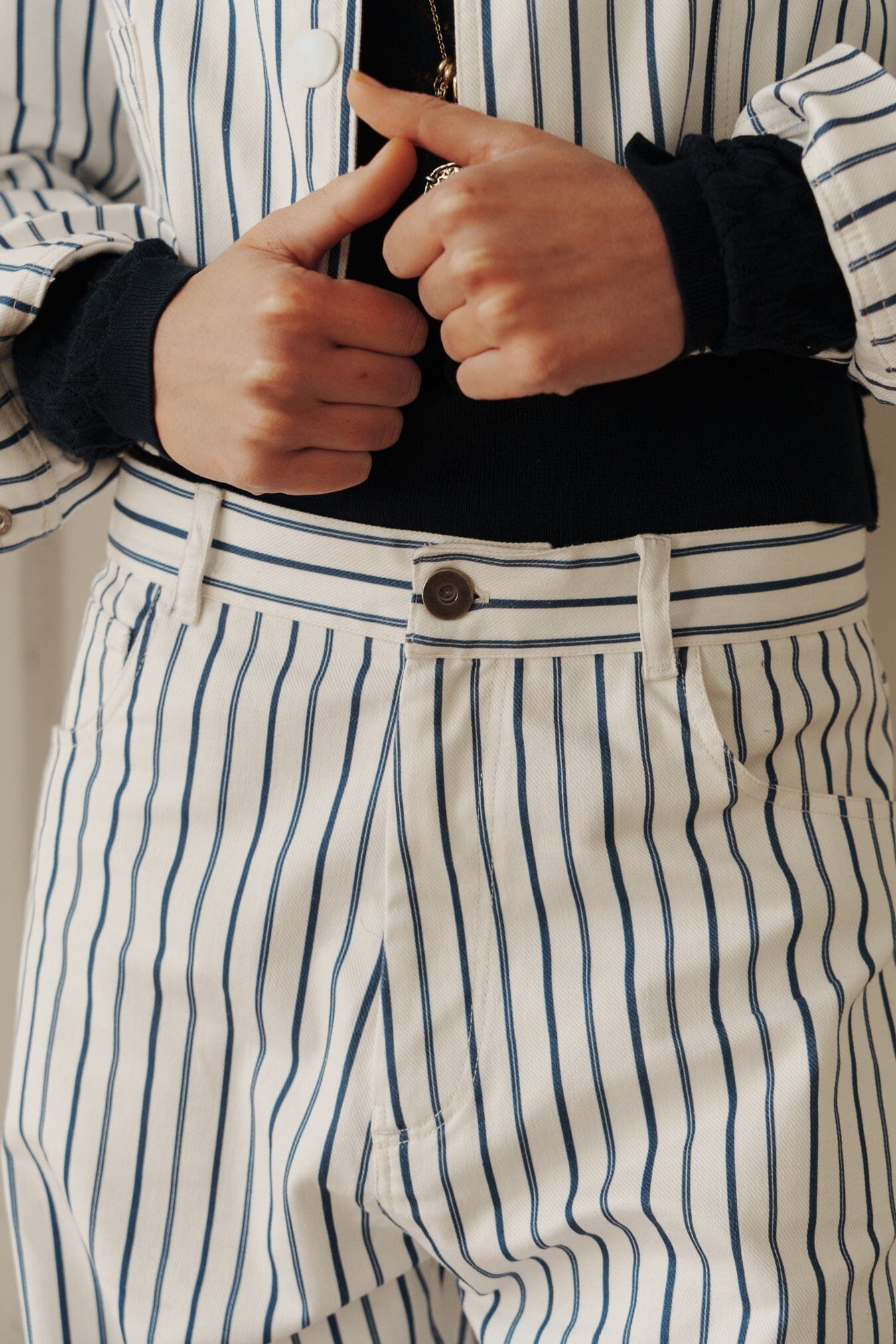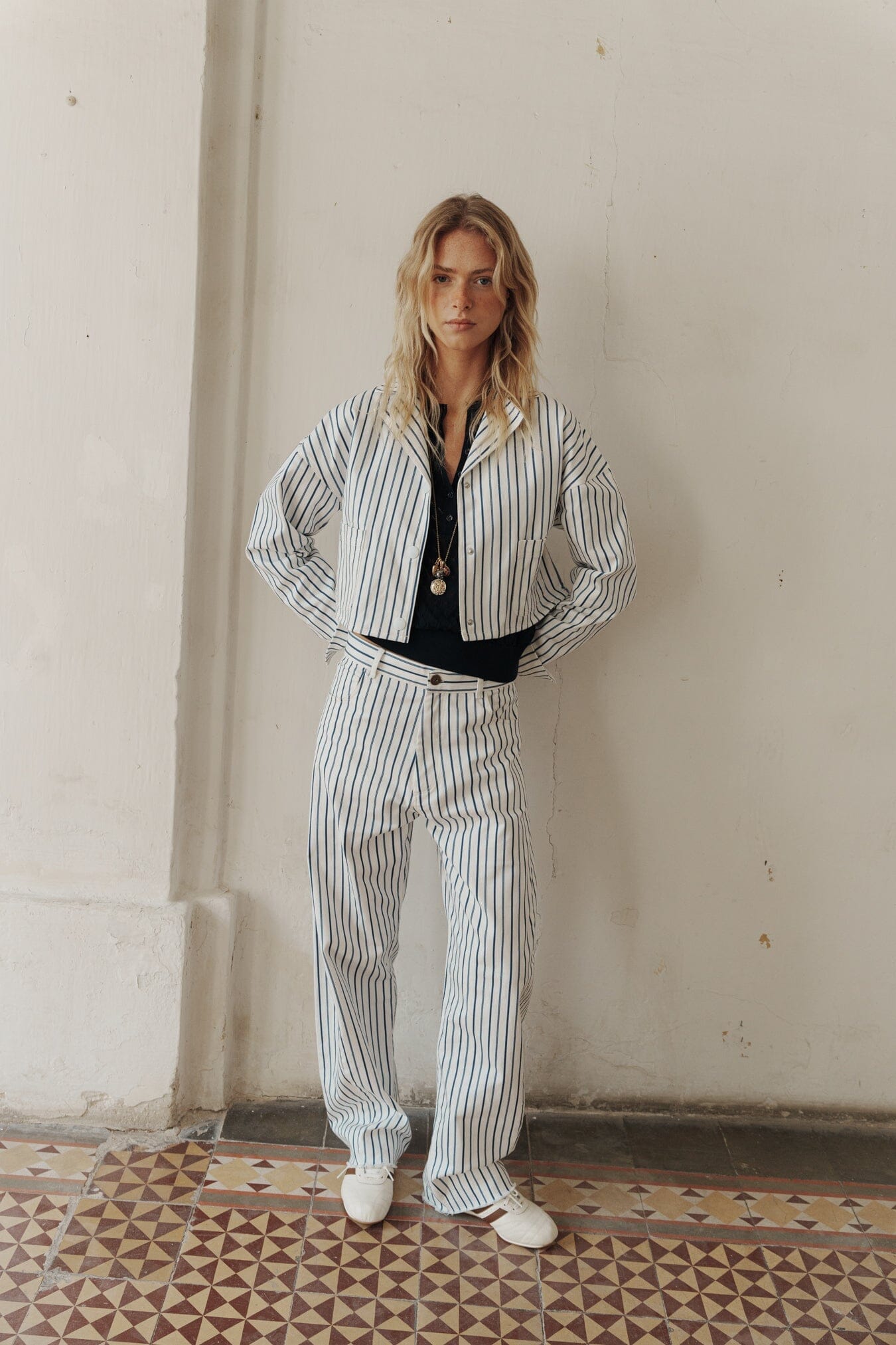 Pantalón recto de cintura alta. Bolsillos delanteros y traseros. Cierre frontal con cremallera y botón.