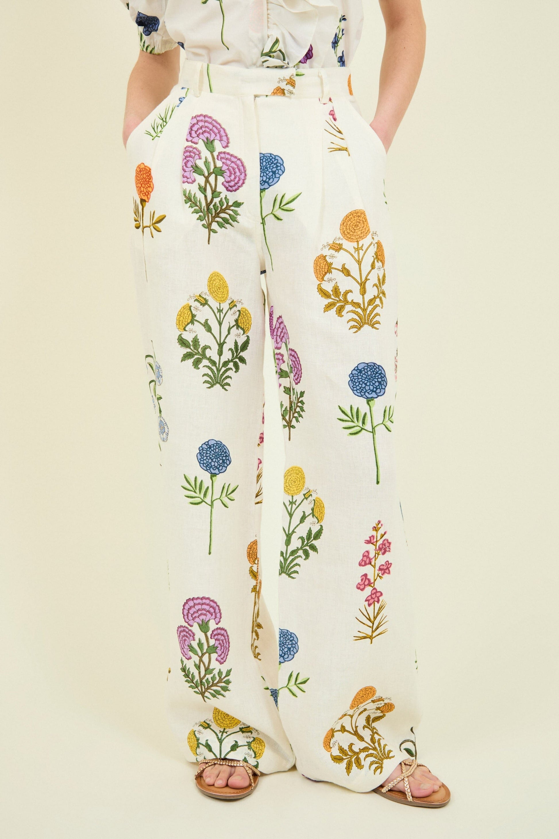 The Aria women's trousers in white are a high-waisted design made from 100% cotton, a natural, soft and lightweight fabric, ideal for the spring-summer season. It features a bold floral print in green, blue, orange and purple. It has a wide cut, two side pockets and a front zip;