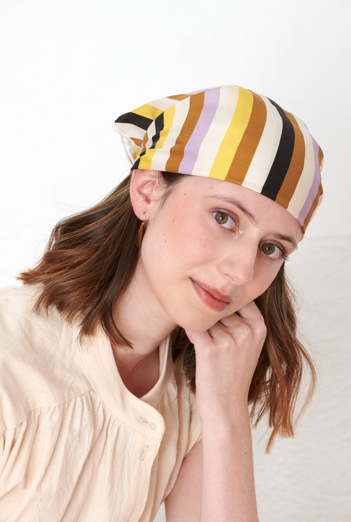 Bufanda de seda de alta calidad. Forma cuadrada y estampado de rayas diagonales en amarillo, crudo, lila, negro y ocre.