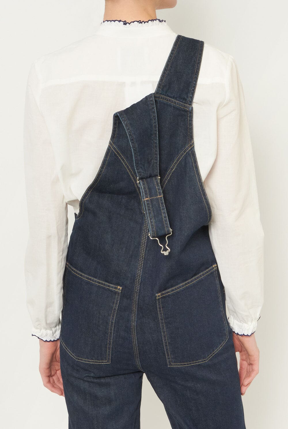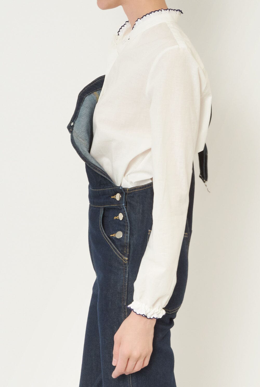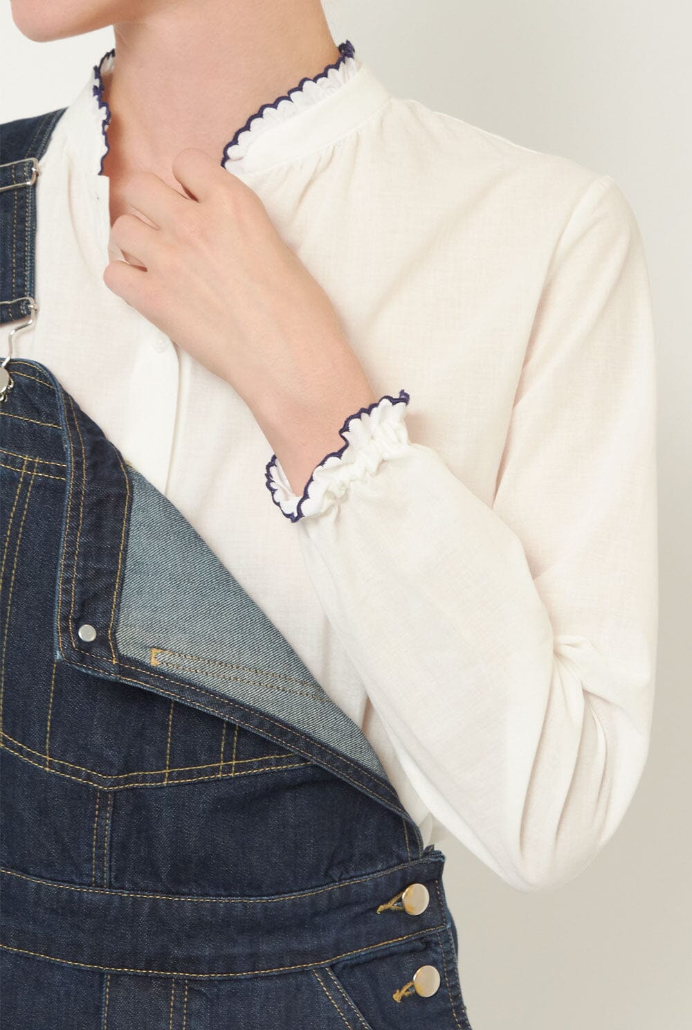 Blusa color blanco roto con volante de volante y ribete bordado azul marino en cuello y puños. Hecho en España
