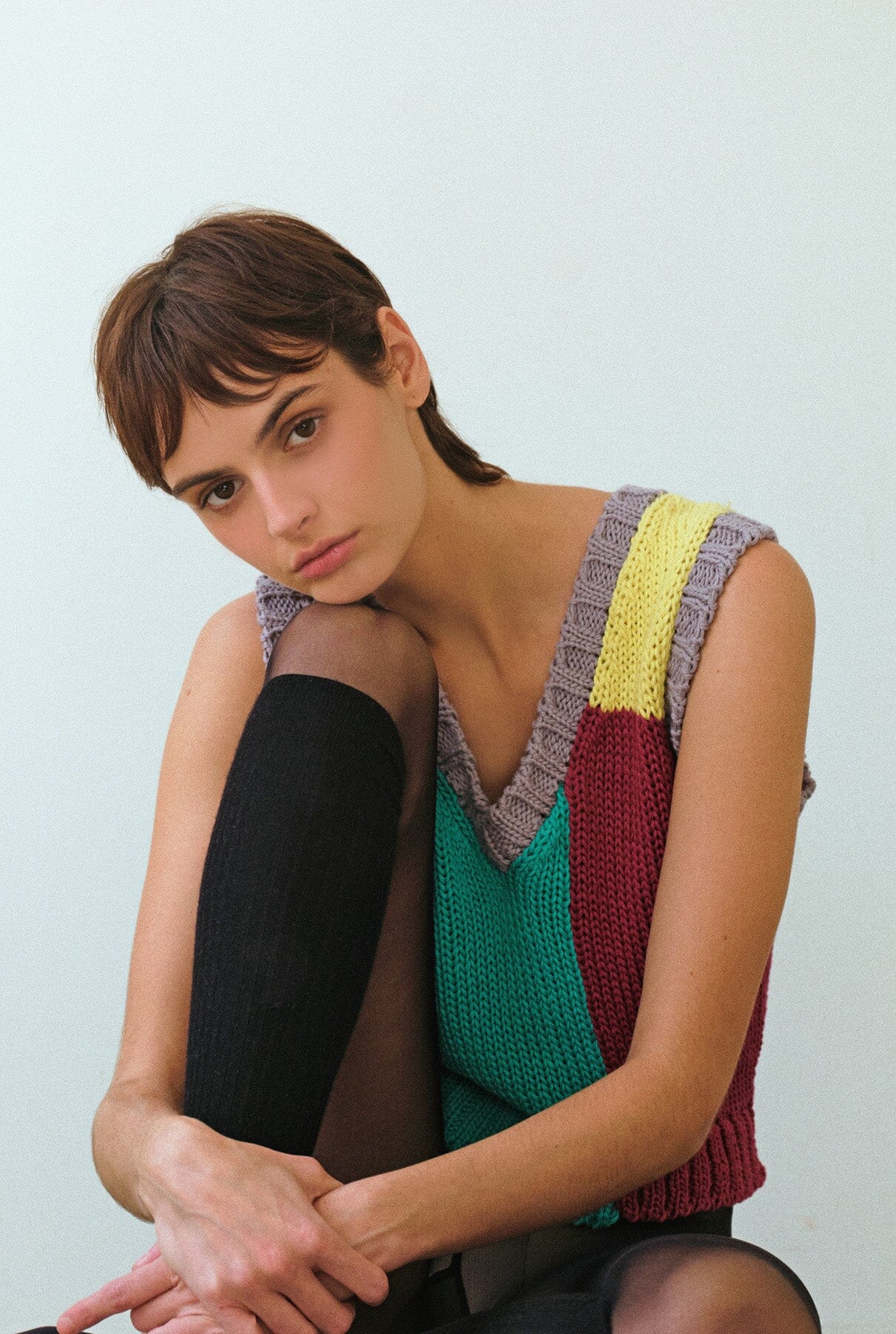 Chaleco patchwork hecho a mano con terminaciones en canalé.